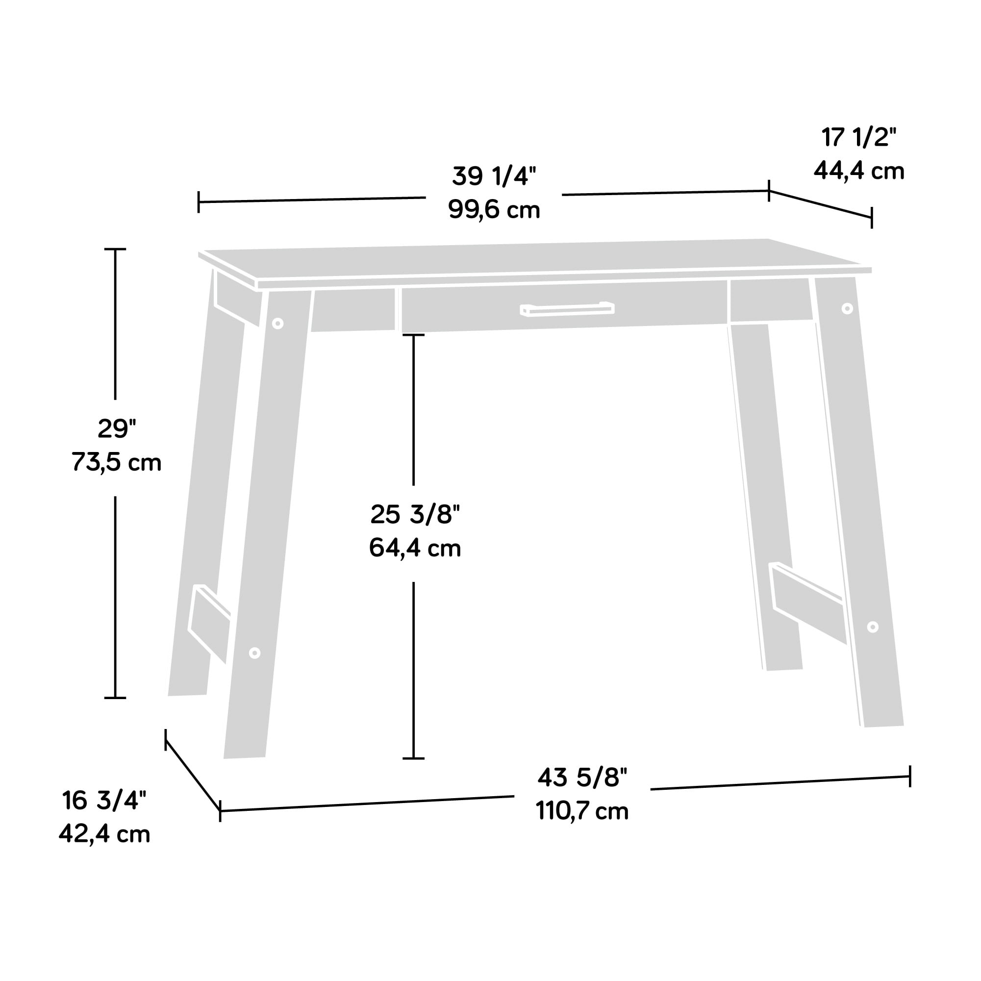 Assembled Dimensions: 43.58″ L x 17.48″ W x 28.94″ H Drawer features metal runners and safety stops for ease of use Finished in a cool Silver Sycamore Assembly Required Model #: 428237 Box Dimensions: 43.88″ L x 18.7″ W x 2.48″ H For additional questions or any issues, please contact the manufacturer at 1-800-523-3987. Be sure to check out the Sauder Beginnings collection for more great items!