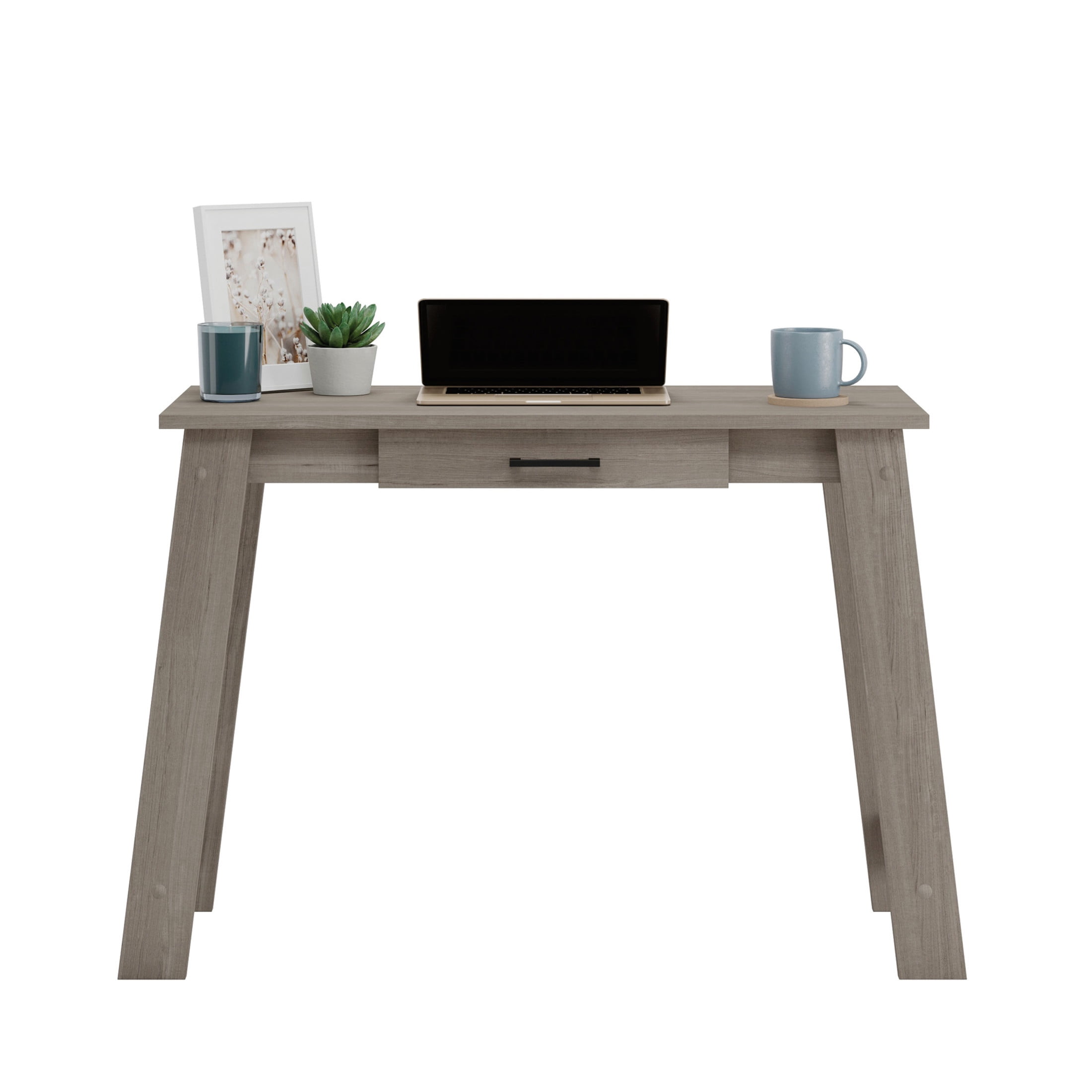 Whether its writing out your grocery list or working on your next big project, you need the perfect place to do so. Create a multifunctional work or study area in any room of your home with this writing desk with drawer from the Beginnings collection. This small writing desk offers a spacious top surface that provides you with all the room you need for desk essentials like your laptop, stacks of notepads, folders, and your hot cup of coffee. It even has room for a little home decor too, like a table lamp or a decorative plant. This writing table features a drawer that opens and closes on smooth metal runners and includes safety stops. This storage drawer is ideal for stowing away all your miscellaneous supplies like pens, pencils, and scissors. Its simple design and charming good looks make this small writing table a great addition to any room in your home. Finished in Silver Sycamore and detailed with attractive hardware, this wood writing desk is just what youve been looking for.