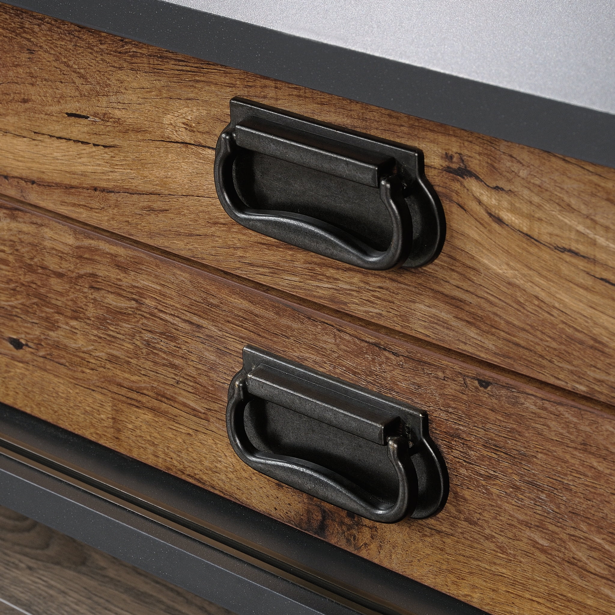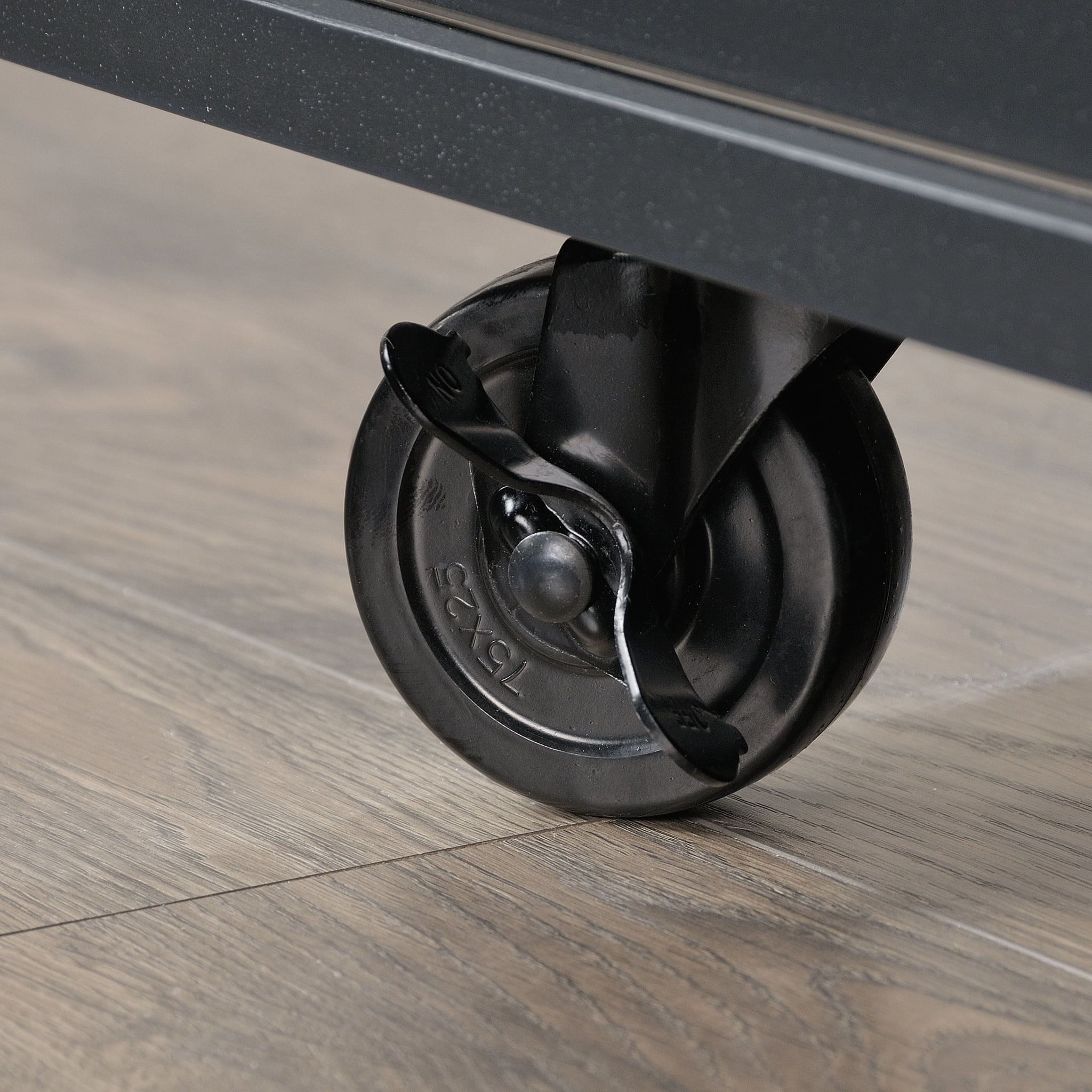 Assembled Dimensions: 45.95″ L x 21.93″ W x 13.54″ H Two easy-glide drawers for magazines, remote controls, etc Hidden storage behind sliding door because everyone needs a place to hide their clutter and chaos Cubbyhole storage for books, home decor, or knick-knacks Easy-roll, locking casters Finished on all sides for versatile placement anywhere in your home Can also function as a TV Stand and accommodates up to a 50″ TV weighing 50 lbs. or less for optimal viewing pleasure Black finish with Vintage Oak accents Model #: 420645 Box Dimensions: 51.75″ L x 24.80″ W x 5.97″ H For additional questions or any issues, please contact the manufacturer at 1-800-523-3987. Be sure to check out the Sauder Boulevard Cafe collection for more great items!
