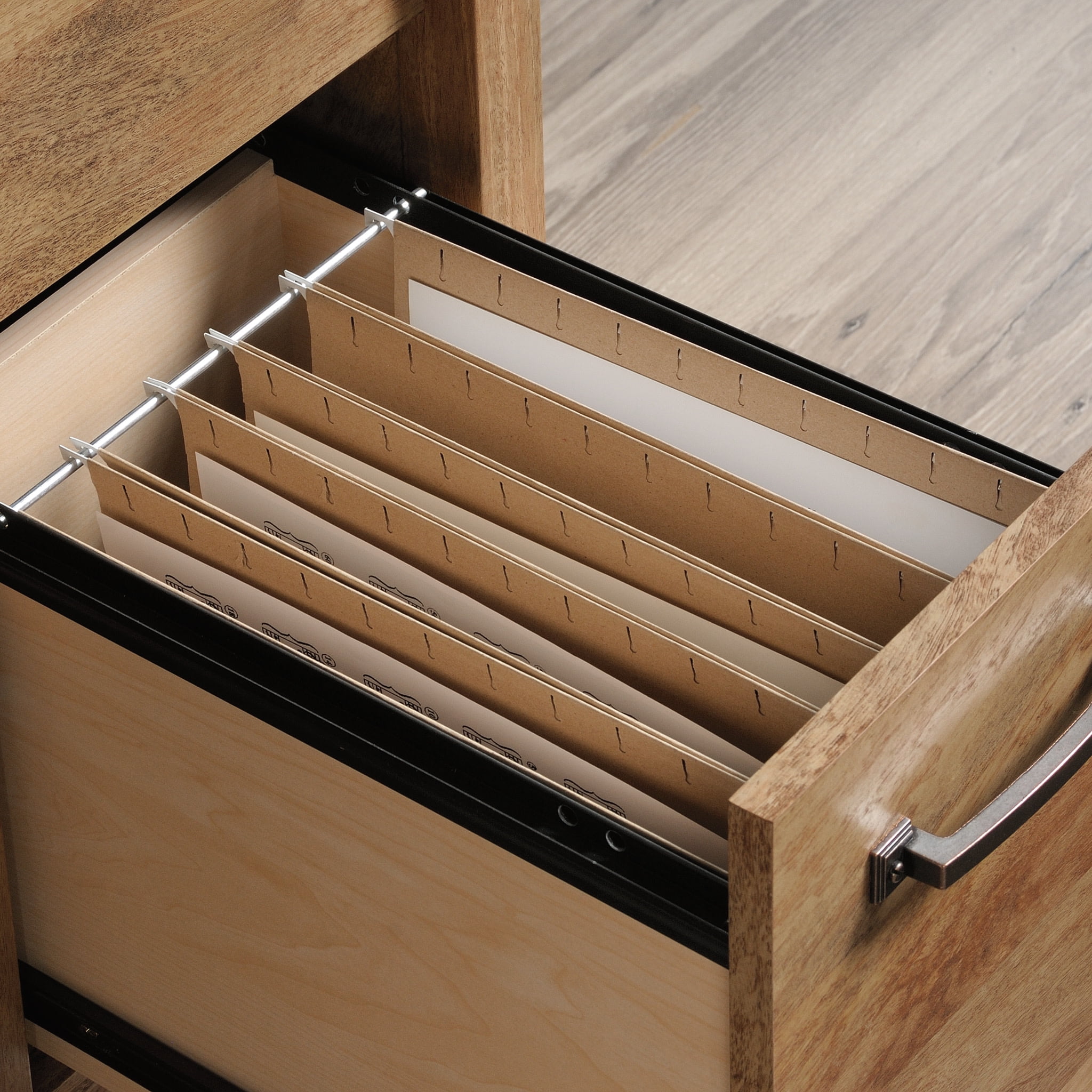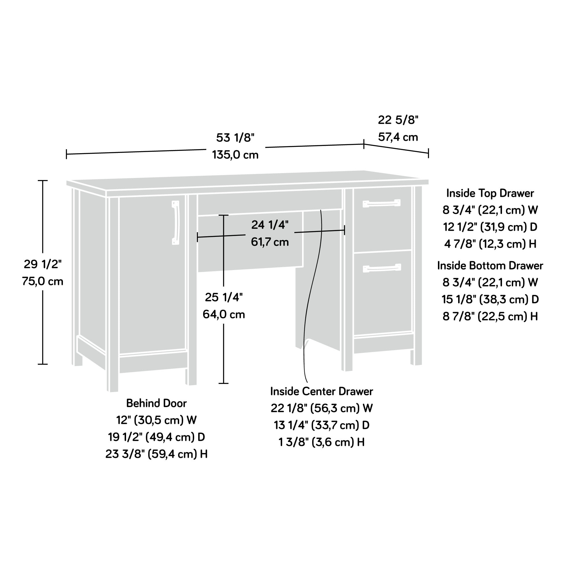 Assembled Dimensions: 53.15″ L x 22.60″ W x 29.53″ H Three drawers with metal runners and safety stops to keep you and your family safe Lower drawer holds letter-size hanging files to keep you organized Storage area behind door features an adjustable shelf and holds vertical CPU tower Finished on all sides for versatile placement anywhere in your home Side panels feature herringbone pattern Sindoori Mango finish Model #: 424127 Box Dimensions: 62.25″ L x 24.25″ W x 5.69″ H For additional questions or any issues, please contact the manufacturer at 1-800-523-3987. Be sure to check out the Sauder Cannery Bridge collection for more great items!