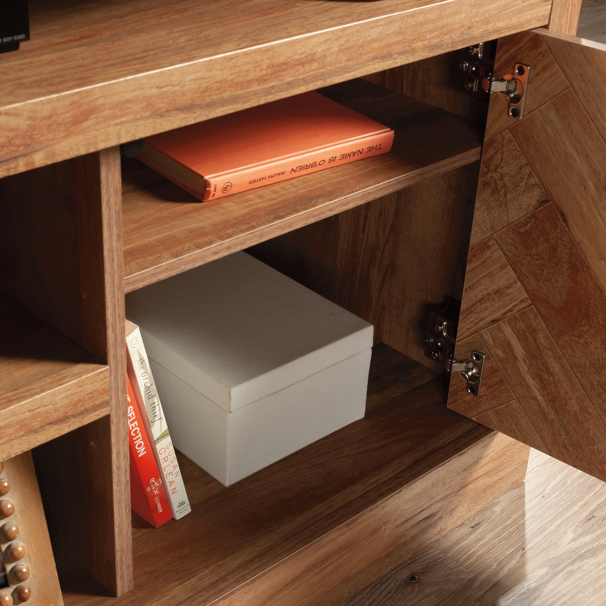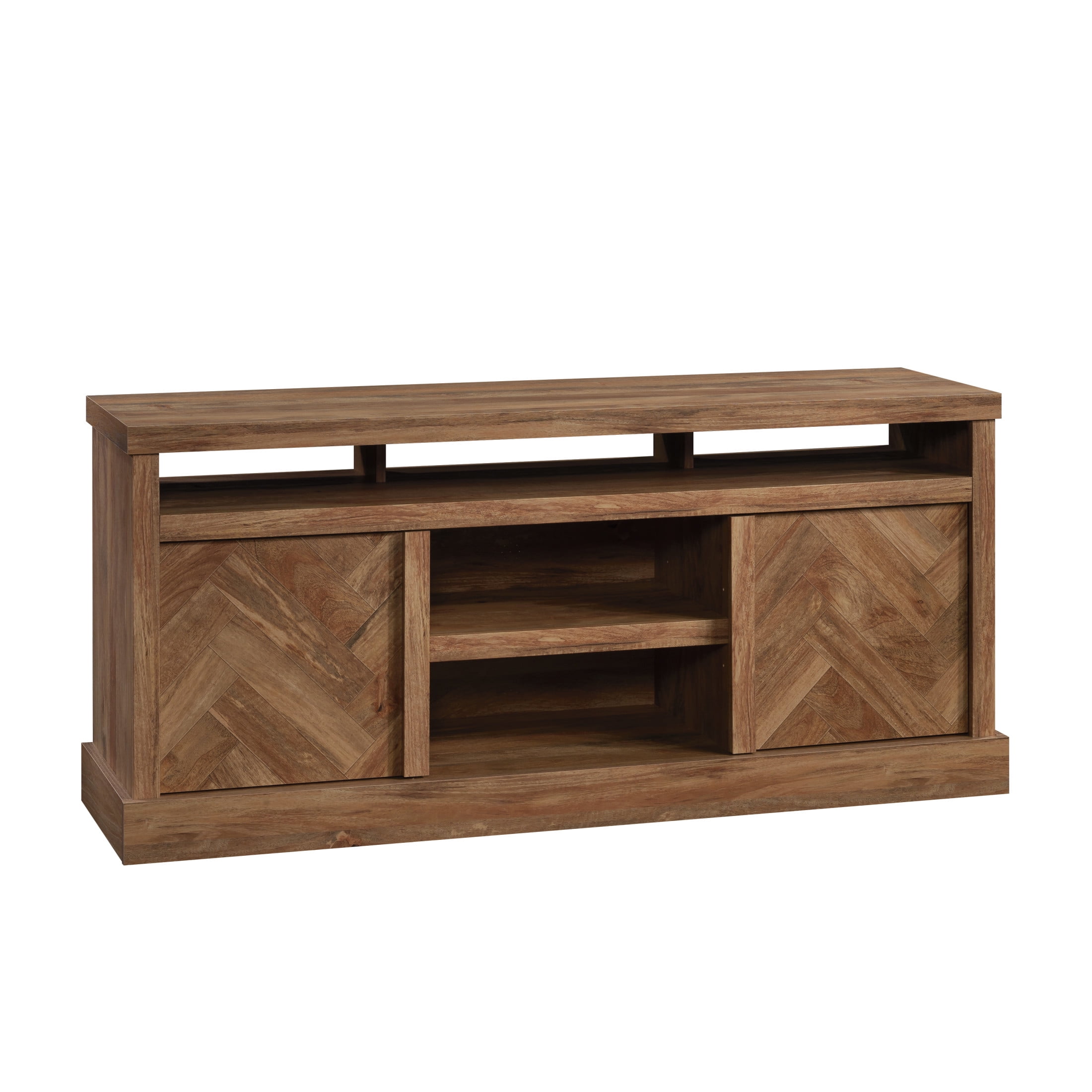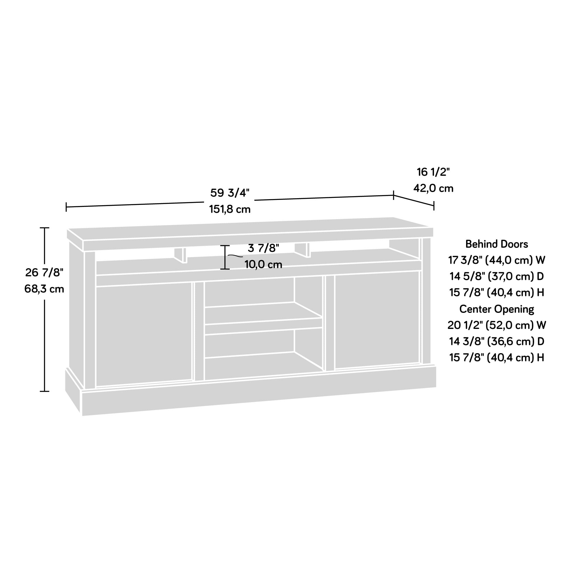 Assembled Dimensions: 59.76″ L x 16.54″ W x 26.89″ H Accommodates up to a 65″ TV weighing 70 lbs or less Top features strong and lightweight 1 “” panel construction Three large cubbies hold audio/video equipment, books, collectibles and more Flexible storage with an adjustable shelf behind each door Door panels feature herringbone pattern Adjustable center shelf provides versatile storage Cord management pass-throughs for electronic components Quick and easy assembly with slide-on moldings Sindoori Mango finish Model #: 430274 Box Dimensions: 65.13″ L x 16.81″ W x 6.44″ H For additional questions or any issues, please contact the manufacturer at 1-800-523-3987. Be sure to check out the Sauder Cannery Bridge collection for more great items!