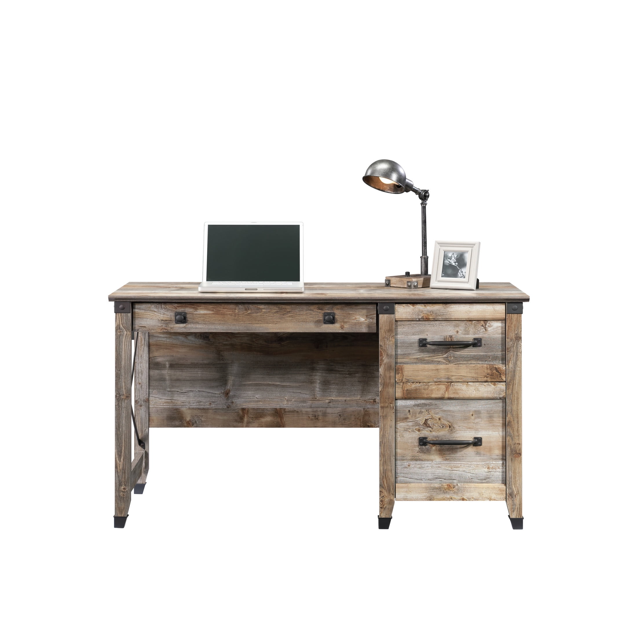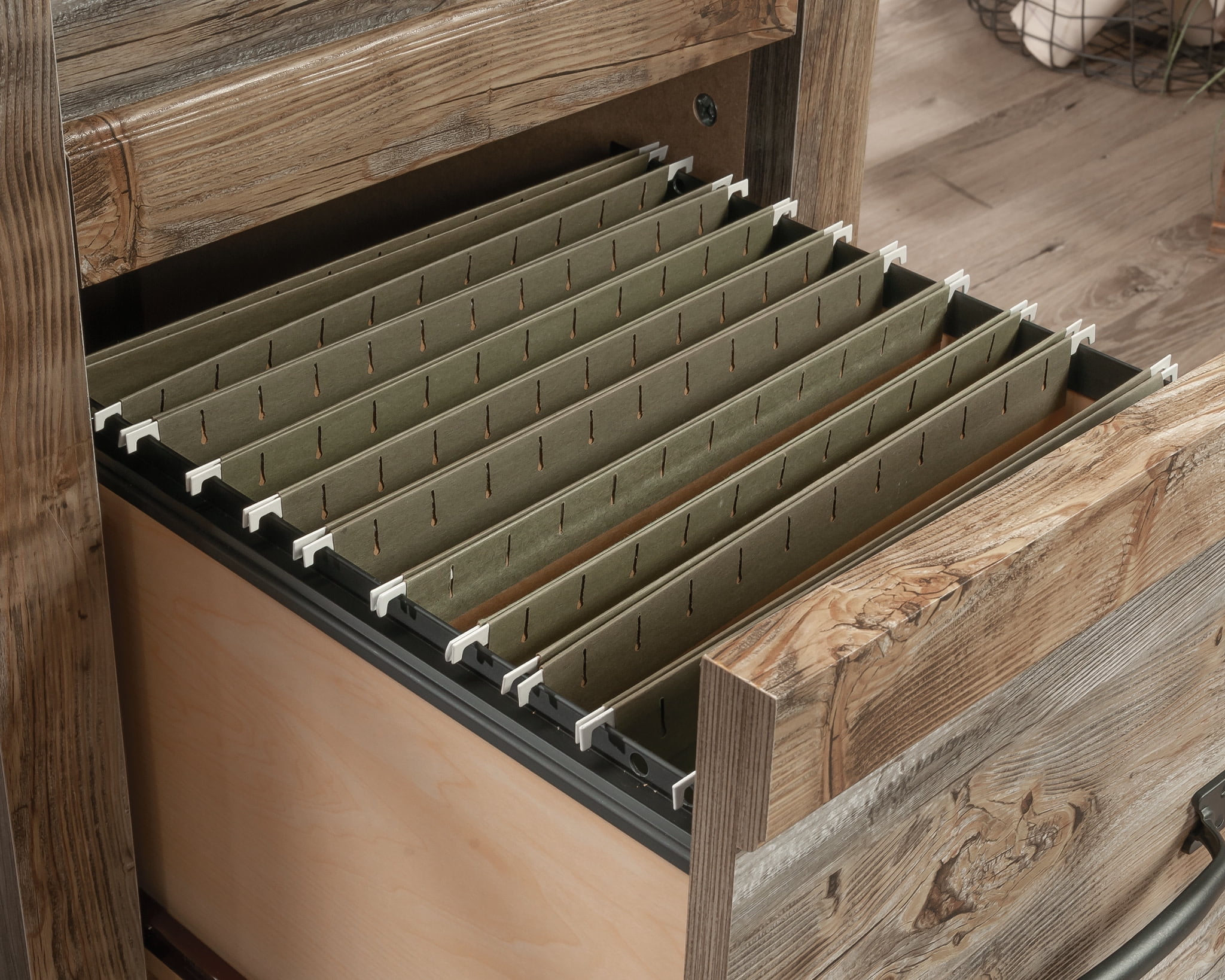 Whether it’s your next big work project or just jotting down a quick grocery list, this stylish single pedestal desk from the Carson Forge collection has got you covered. The spacious top surface of this pedestal desk with drawers provides you with all the room you need for your must-have desk essentials like your laptop, stacks of folders, notepads and of course, your hot cup of coffee. This rustic pedestal desk features three storage drawers with metal runners and safety stops for convenient storage space of all your miscellaneous office items. The lower drawer of this home office desk accommodates letter-size hanging files so you can keep all your papers organized. Details like easy assembly with a T-slot drawer system and wrought iron style hardware and accents make this rustic desk with drawers stand out from the rest when shopping for a new desk. Finished in Rustic Cedar, this stunning desk is just what you have been looking for.