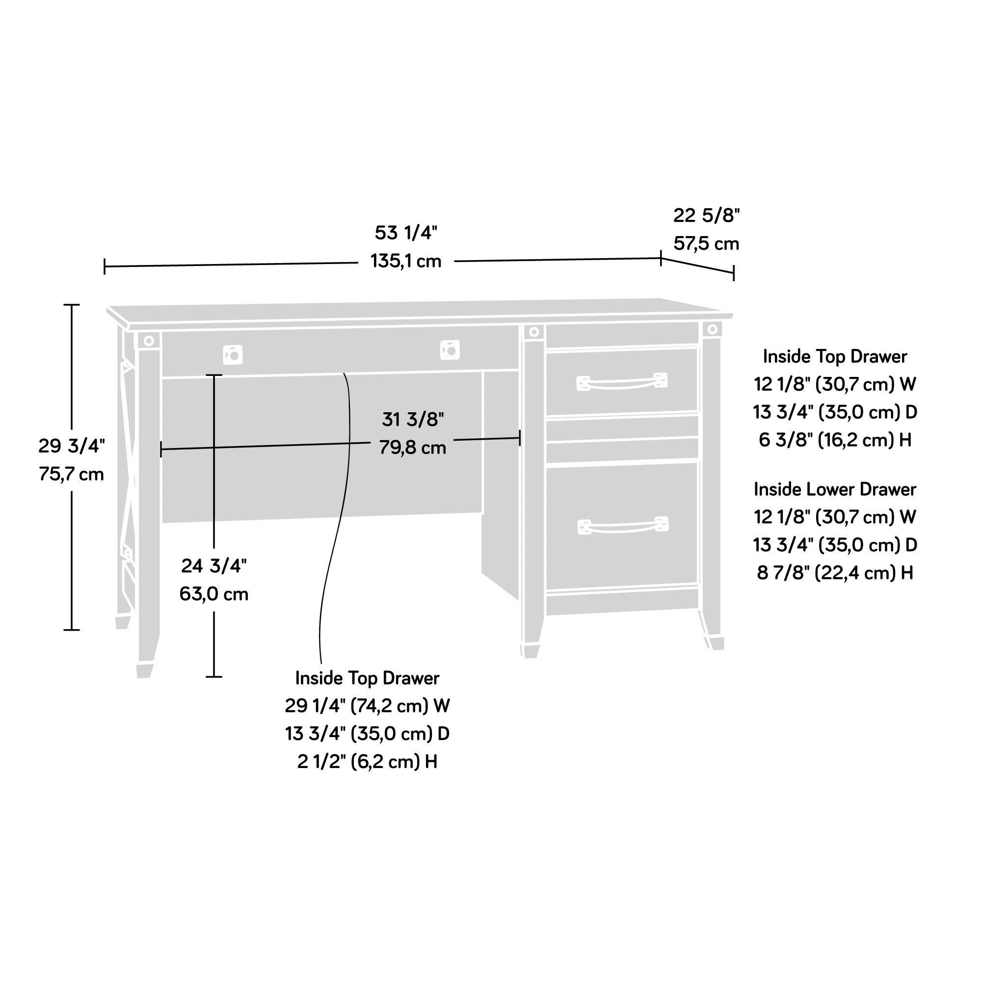 Whether you’re looking for a place to get some work done or really just need another surface for your colossal penny collection, this desk from the Carson Forge® collection is perfect for you. This home office desk features three drawers that glide on smooth metal runners – each provides versatile storage for pens, pencils, notebooks, binders and more. The lower drawer holds letter-size hanging files to help keep your most important files organized and easy to find. The spacious top surface of this desk with storage is large enough for a computer, lamp, your planner, and more. Finished in a rustic Washington Cherry and accented with wrought iron style hardware, this desk hard is to take your eyes off of. We hope you like what you see. Sauder designers travel the world and bring back the best and latest in style, finish, and color trends. This inspiring world travel is evident in the cutting edge and innovative furniture solutions we offer to you! Features: Finish: Washington Cherry Material: Engineered Wood Three drawers with metal runners and safety stops Lower drawer holds letter-size hanging files Wrought iron style hardware and accents Quick and easy assembly with patented T-slot drawer system Specifications: Product Dimensions: 29.80″ H x 53.19″ W x 22.64″ D Product Weight: 103 lbs Weight Capacity: 70 lbs