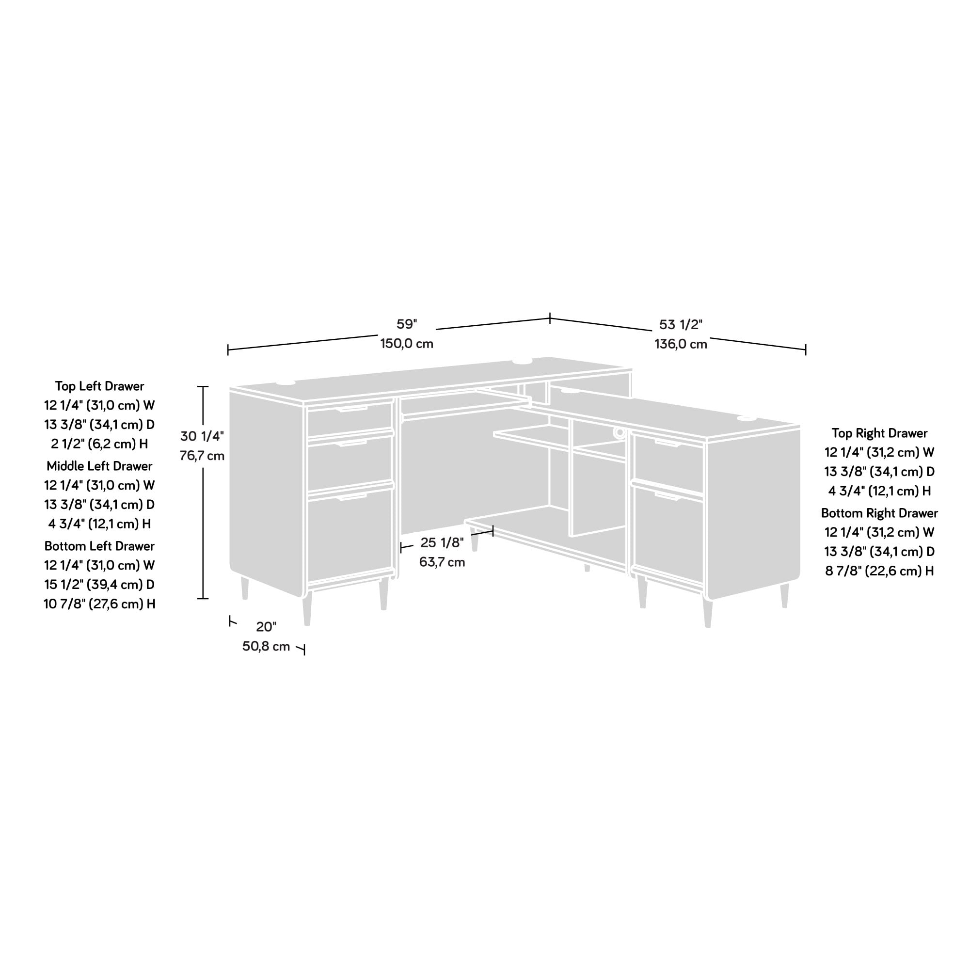 Assembled Dimensions: 59.06″ L x 53.54″ W x 30.2″ H Slide-out keyboard/mouse shelf with metal runners and safety stops to keep you and your family safe Two drawers with full extension slides hold letter-size hanging files to keep your important documents organized Three drawers with metal runners and safety stops conceal miscellaneous office supplies Return can be fastened on the left or right side to fit your space best Grommet holes and pass-through allow convenient paths for cables and cords Finished on all sides for versatile placement anywhere in your home Cubbyhole storage Solid wood feet for long lasting durability Meets BIFMA standard x5.5 for safety, durability, and structural performance Grand Walnut finish Model #: 421120 Box 1 Dimensions: 27.44″ L x 63.58″ W x 4.65″ H Box 2 Dimensions: 22.83″ L x 29.53″ W x 8.58″ H For additional questions or any issues, please contact the manufacturer at 1-800-523-3987.