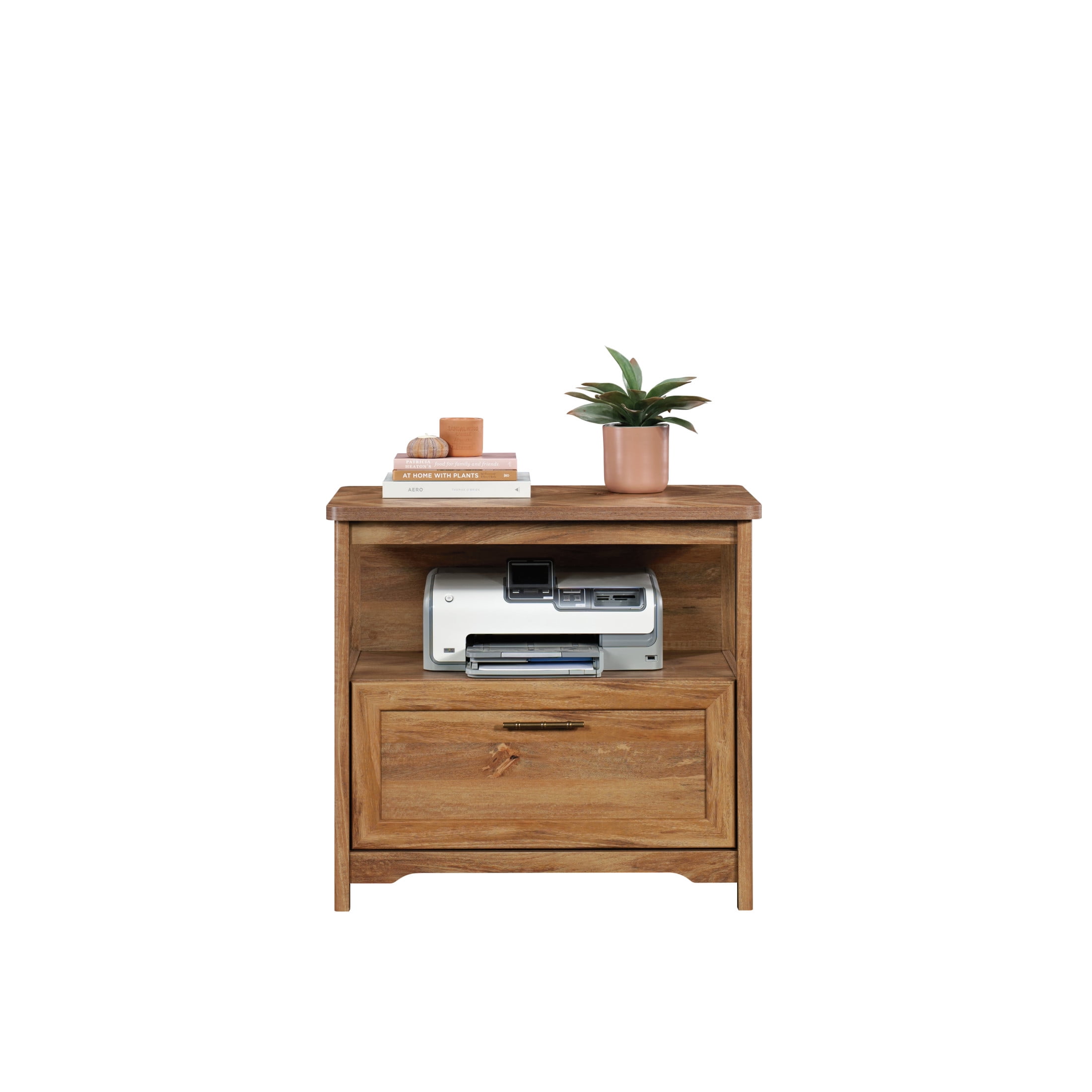 Assembled Dimensions: 32.21″ L x 19.45″ W x 30.0″ H Drawer with full extension slides holds letter, legal, or European size hanging files Top features herringbone pattern Open shelf provides additional storage Finished on all sides for versatile placement Quick and easy assembly with T-lock drawer system Sindoori Mango finish Model #: 431695 Box Dimensions: 36.63″ L x 20.13″ W x 6.75″ H For additional questions or any issues, please contact the manufacturer at 1-800-523-3987. Be sure to check out the Sauder Coral Cape collection for more great items!