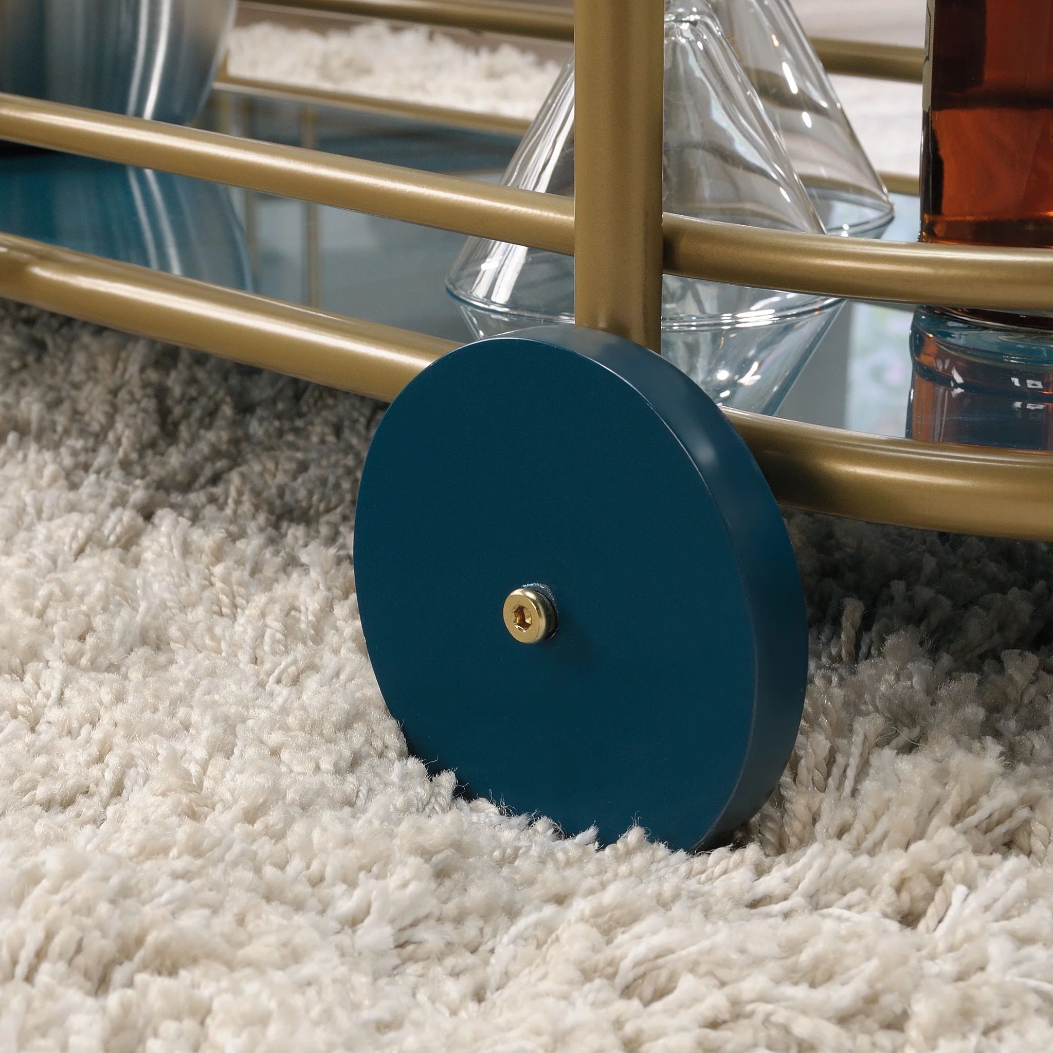 Finish: Satin Gold Material: Metal and Glass Three safety-tempered glass shelves. Middle shelf features banana leaf abstract pattern for added visual interest. Lower shelf features teal tinted silk-screened glass. Powder coated metal frame. Finished on all sides for versatile placement anywhere in your home. Front casters for easy mobility.