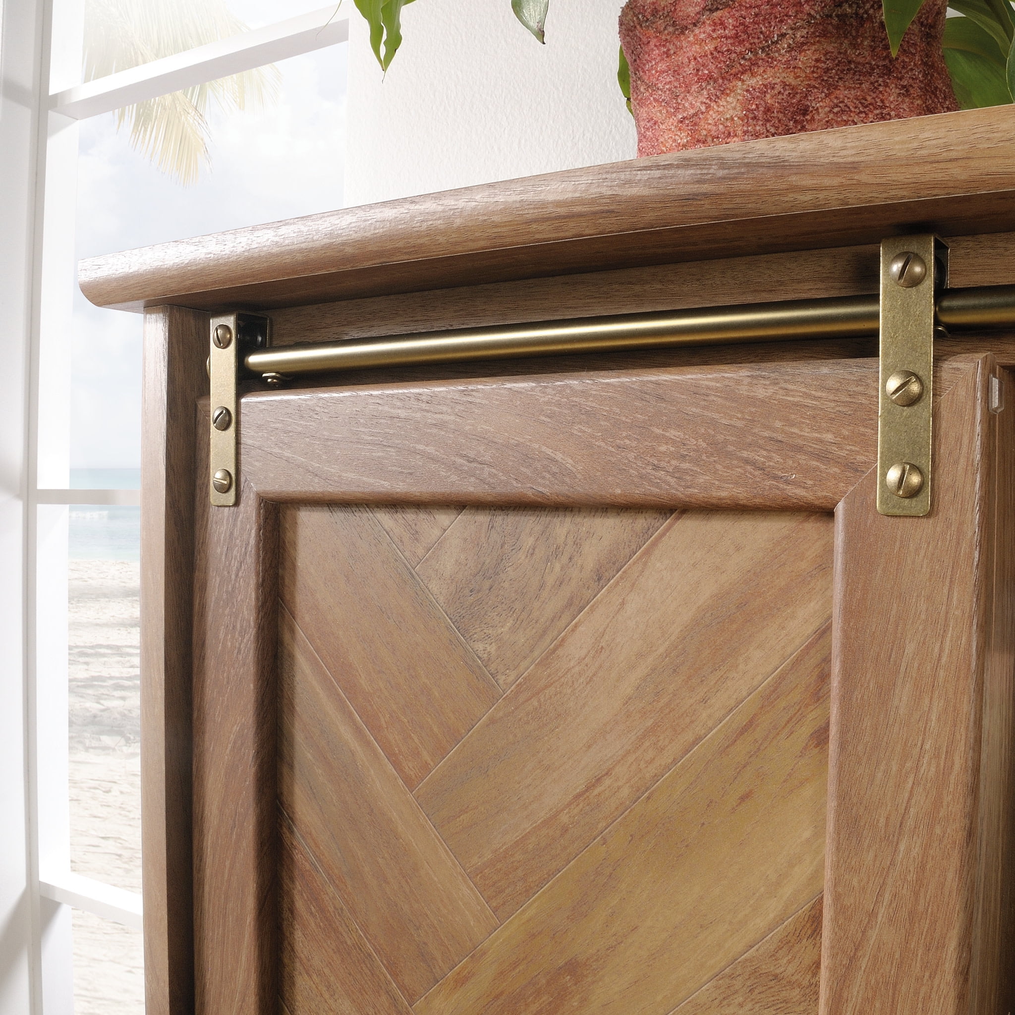 Style and storage all in one. Give your home the additional storage space it needs without having to sacrifice on the style you love with this storage cabinet from the Coral Cape collection. Display the best and hide the rest – this storage cabinet features a large sliding door that allows you to display on one side and have hidden storage on the other. This storage cabinet with doors features six adjustable shelves that can move to different heights to create flexible storage for items of all shapes and sizes. Store items like spare blankets, board games, stacks of books and organizing bins. You can also display items like decorative plants, knick-knacks, and photos of your family and friends. It has room for it all! Its large sliding door includes a reversible door panel that features a herringbone finish on one side and wood pattern on the other. Finished in Sindoori Mango and detailed with attractive hardware, this display storage cabinet will have you feeling clutter-free in no time