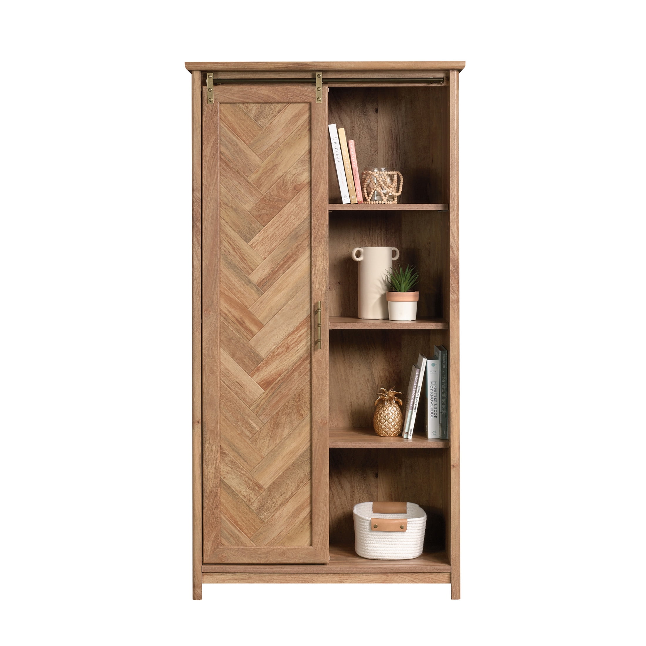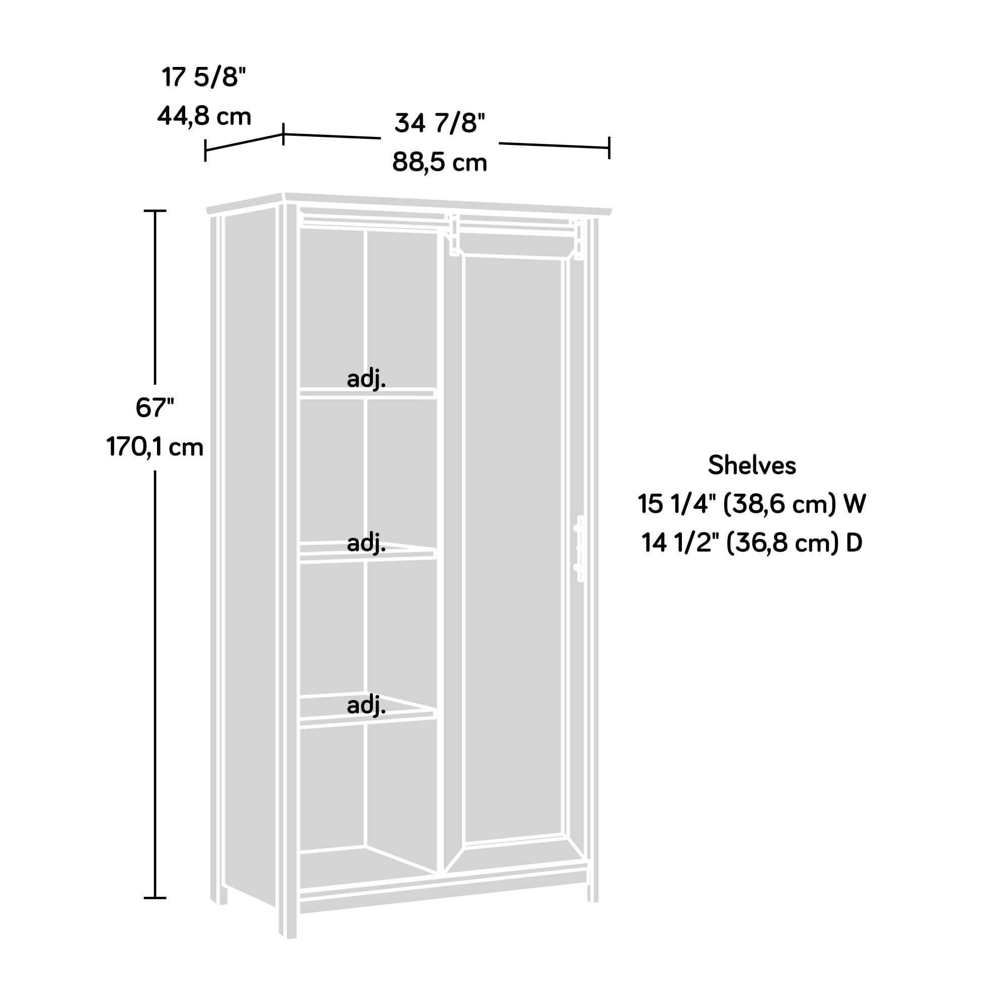 Assembled Dimensions: 34.84″ L x 17.64″ W x 66.97″ H Six adjustable shelves for flexible storage options Hidden storage behind sliding door keeps clutter out of sight Reversible door panel features herringbone or wood pattern – you decide which suits you best Tip restraint safety strap included because we care about you and your family Sindoori Mango finish Model #: 423808 Box Dimensions: 73.63″ L x 19.25″ W x 6.50″ H For additional questions or any issues, please contact the manufacturer at 1-800-523-3987. Be sure to check out the Sauder Coral Cape collection for more great items!
