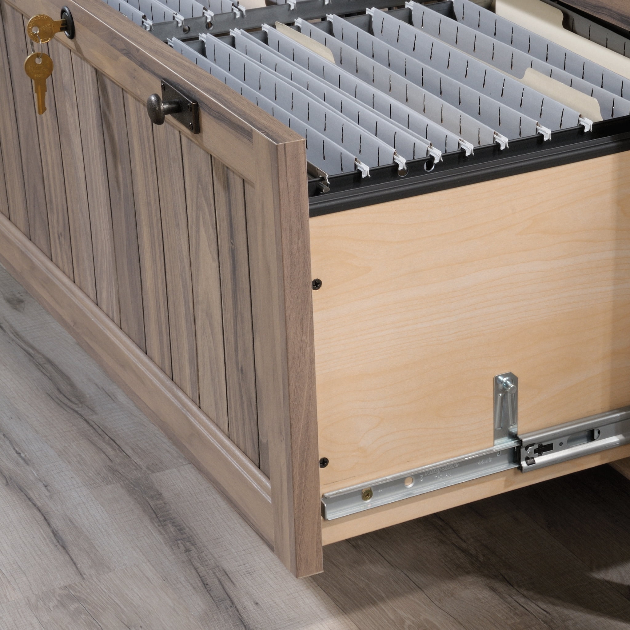 Assembled Dimensions: 33.39″ L x 21.89″ W x 30.00″ H Durable, 1” thick top for display of home décor Drawers with full extension slides hold letter or legal size hanging files Patented, interlocking safety mechanism allows only one drawer open at a time Drawers lock for secure storage of your most important files Stylish, framed, slat-front detailing Meets BIFMA standard x5.9 for safety, durability, and structural performance Finished in Washed Walnut Model #: 428191 Box Dimensions: 40.94″ L x 23.63″ W x 8.50″ H For additional questions or any issues, please contact the manufacturer at 1-800-523-3987. Be sure to check out the Sauder Costa collection for more great items!