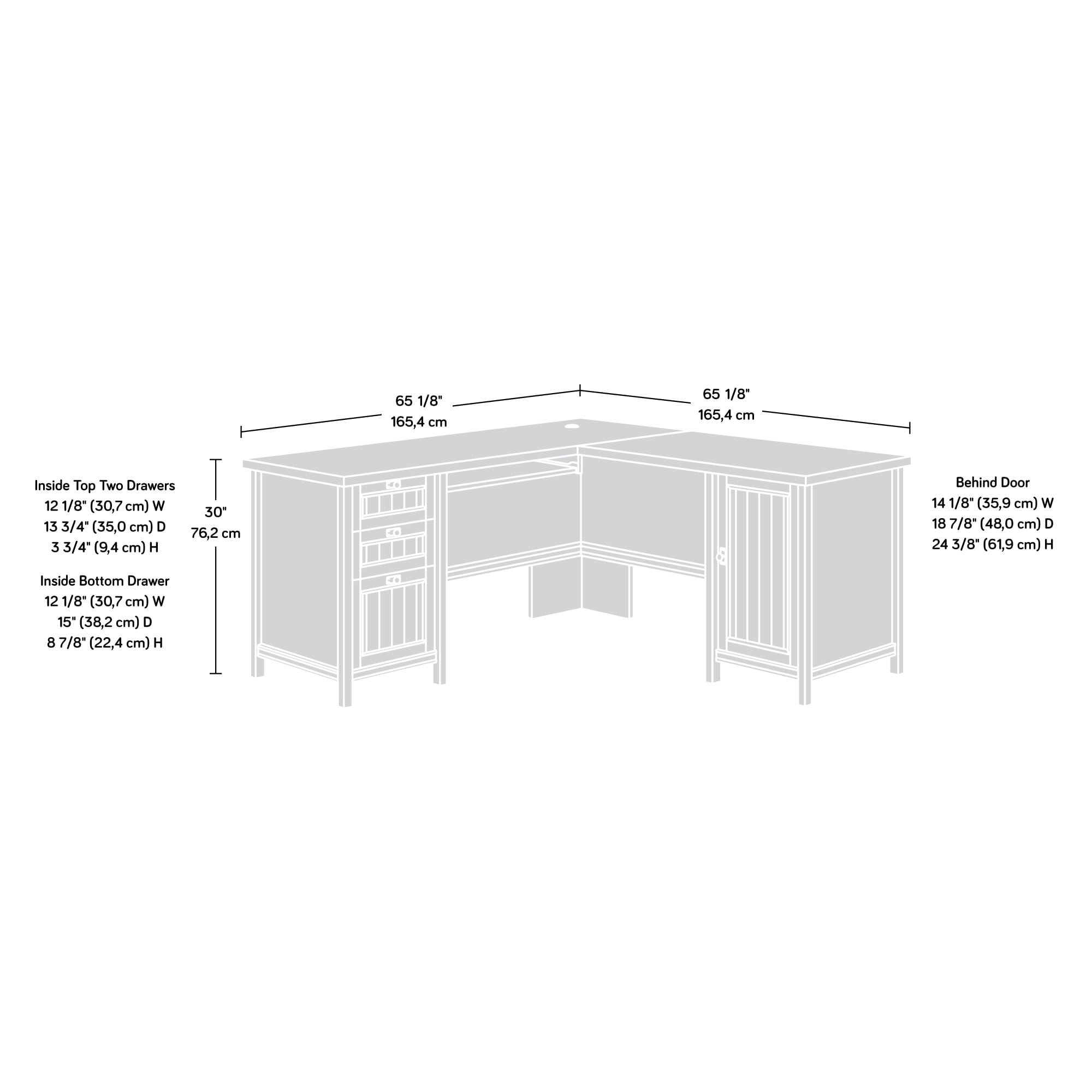 Assembled Dimensions: 65.12″ L x 65.12″ W x 30.00″ H Durable, 1 1/4″ thick top Slide-out keyboard/mouse shelf with metal runners and safety stops Three drawers; lower drawer with full extension slides holds letter or European size hanging files to keep you organized Storage area behind door features an adjustable shelf and holds a vertical CPU tower Framed, slat-front detailing for an extra touch of style Finished on all sides for versatile placement anywhere in your home Cord management includes desktop grommet to keep your cord clutter neatly contained Quick and easy assembly with patented T-lock drawer system to save you time Meets BIFMA standard x5.5 for safety, durability, and structural performance Chalked Chestnut finish Model #: 419956 Box Dimensions: 71.63″ L x 24.94″ W x 10.69″ H For additional questions or any issues, please contact the manufacturer at 1-800-523-3987. Be sure to check out the Sauder Costa collection for more great items!
