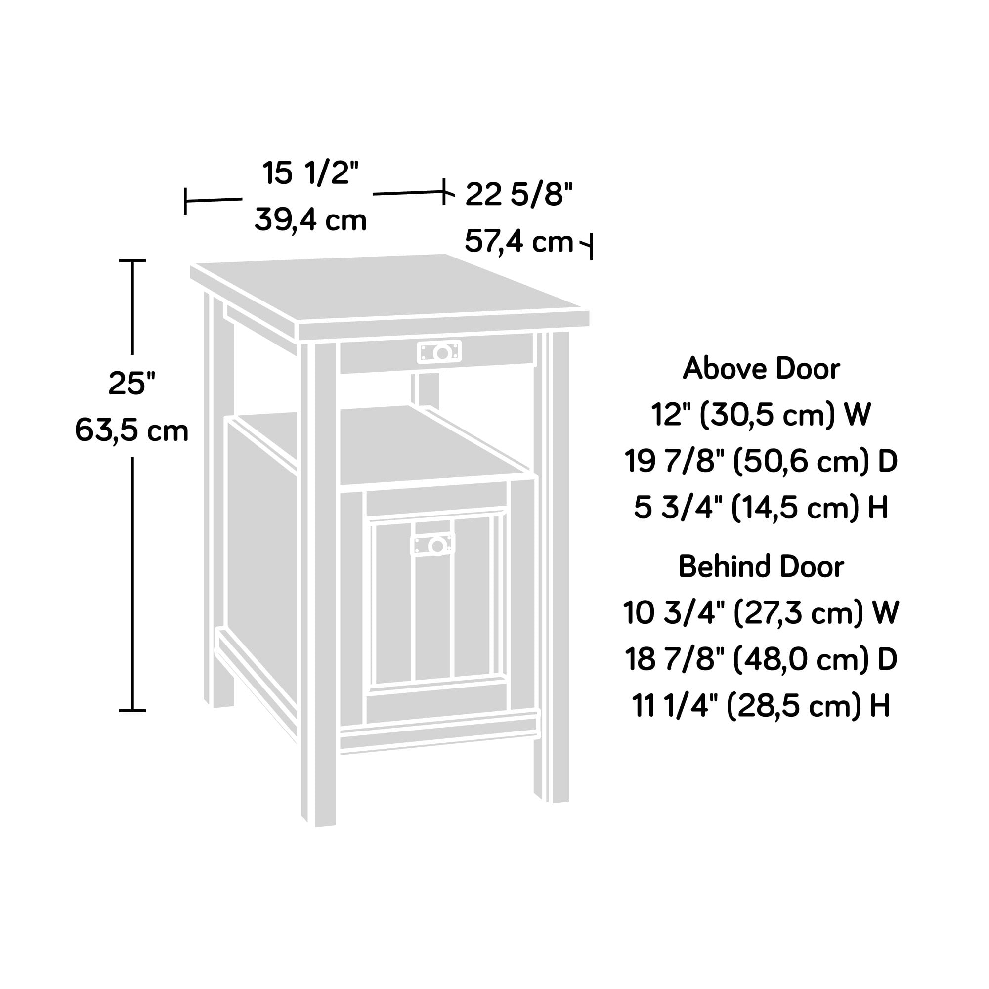 Assembled Dimensions: 15.51″ L x 22.6″ W x 25.0″ H Open shelf for storage of books, magazines, and more Hidden storage behind door for remotes, chargers, or extra cords Top molding reveals slide-out shelf with metal slides for your cup of coffee Finished on all sides for versatile placement in any room of your home Chalked Chestnut finish Model #: 427889 Box Dimensions: 28.38″ L x 17.69″ W x 5.56″ H For additional questions or any issues, please contact the manufacturer at 1-800-523-3987. Be sure to check out the Sauder Costa collection for more great items!