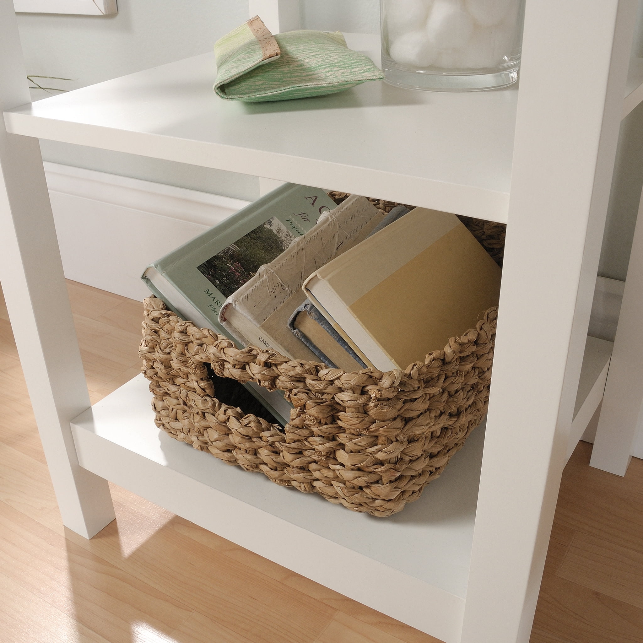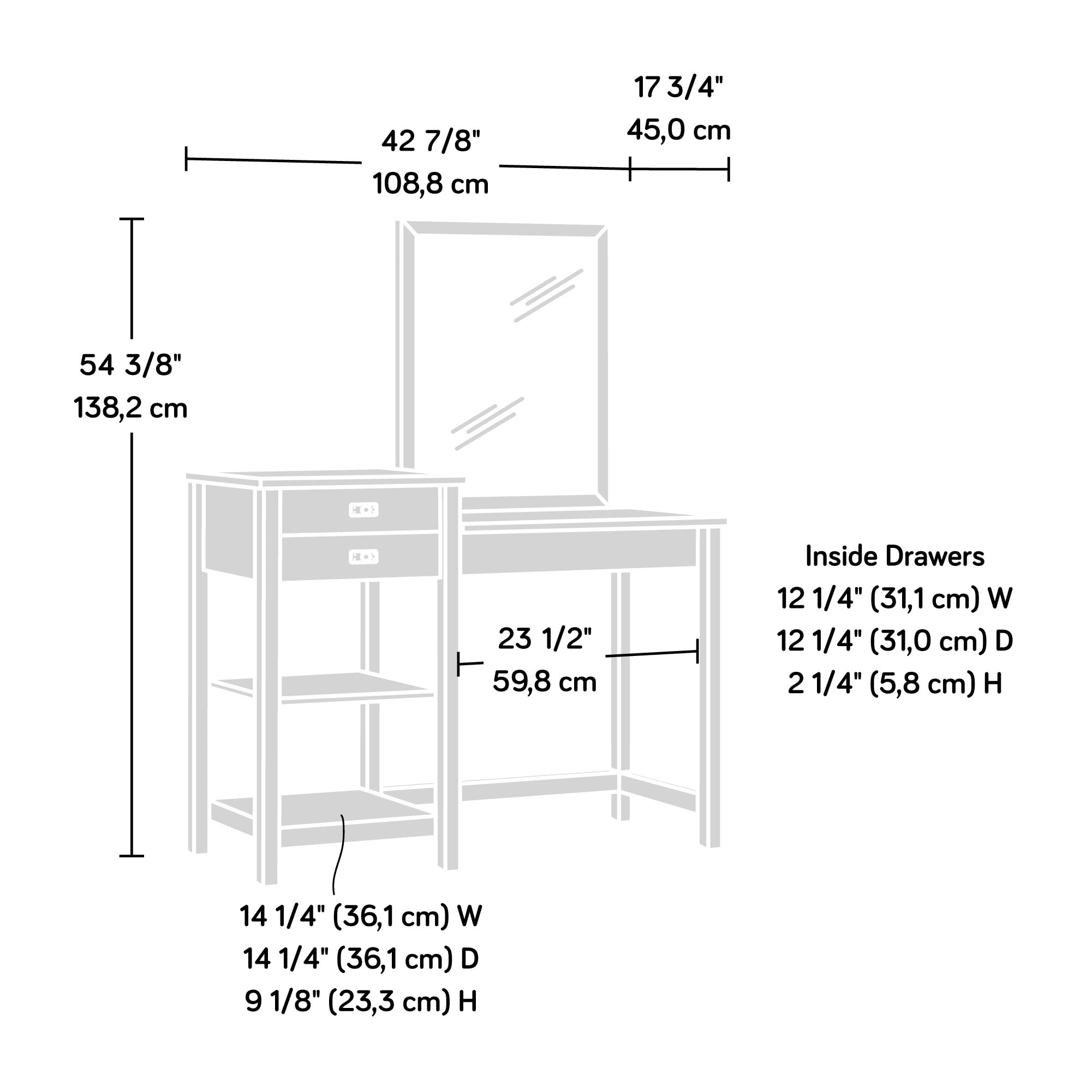 Calling all beauty lovers! Never misplace your makeup and hair products again. Create a designated spot in your home for all your beauty essentials with this vanity from the Cottage Road collection. This vanity makeup table offers a spacious, tiered surface with all the room you need for items like eye shadow pallets, bins full of makeup brushes, your curling iron and all your hair care products. The two drawers open and close on smooth metal runners for easy access storage of various items like hair ties and scrunchies to lip sticks and blushes. Need more storage? Check out the two lower open shelves which provide you with a place for convenient storage of other miscellaneous items. No vanity is complete without a mirror. The large framed mirror allows to check and perfect your look. Finished in soft white with lintel oak accents, this makeup table is everything you need to get ready for work or play.