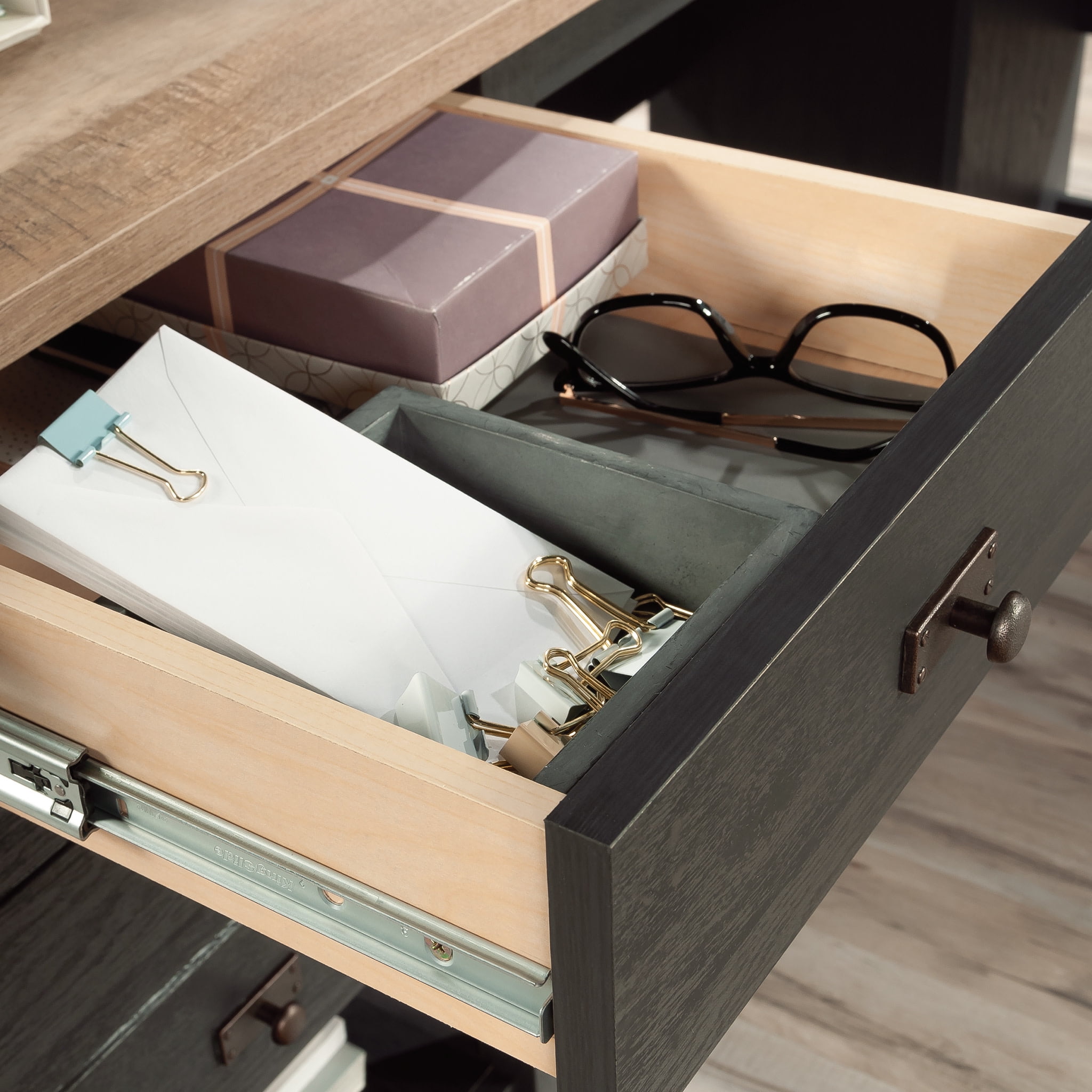 Assembled Dimensions: 65.12″ L x 58.66″ W x 29.76″ H Spacious work surface for a computer, lamp and more Two drawers feature full extension slides for items like, pens, paper, or a stapler Lower drawer holds your important letter-size hanging files Lower shelf for additional storage of books, binders, or an organizing bin Cord management includes two desktop grommets to keep your workspace tidy and clutter free Finished on all sides for versatile placement in any room of your home Raven Oak finish with Lintel Oak accents Model #: 431264 Box Dimensions: 72.13″ L x 21.13″ W x 5.94″ H For additional questions or any issues, please contact the manufacturer at 1-800-523-3987. Be sure to check out the Sauder Cottage Road collection for more great items!
