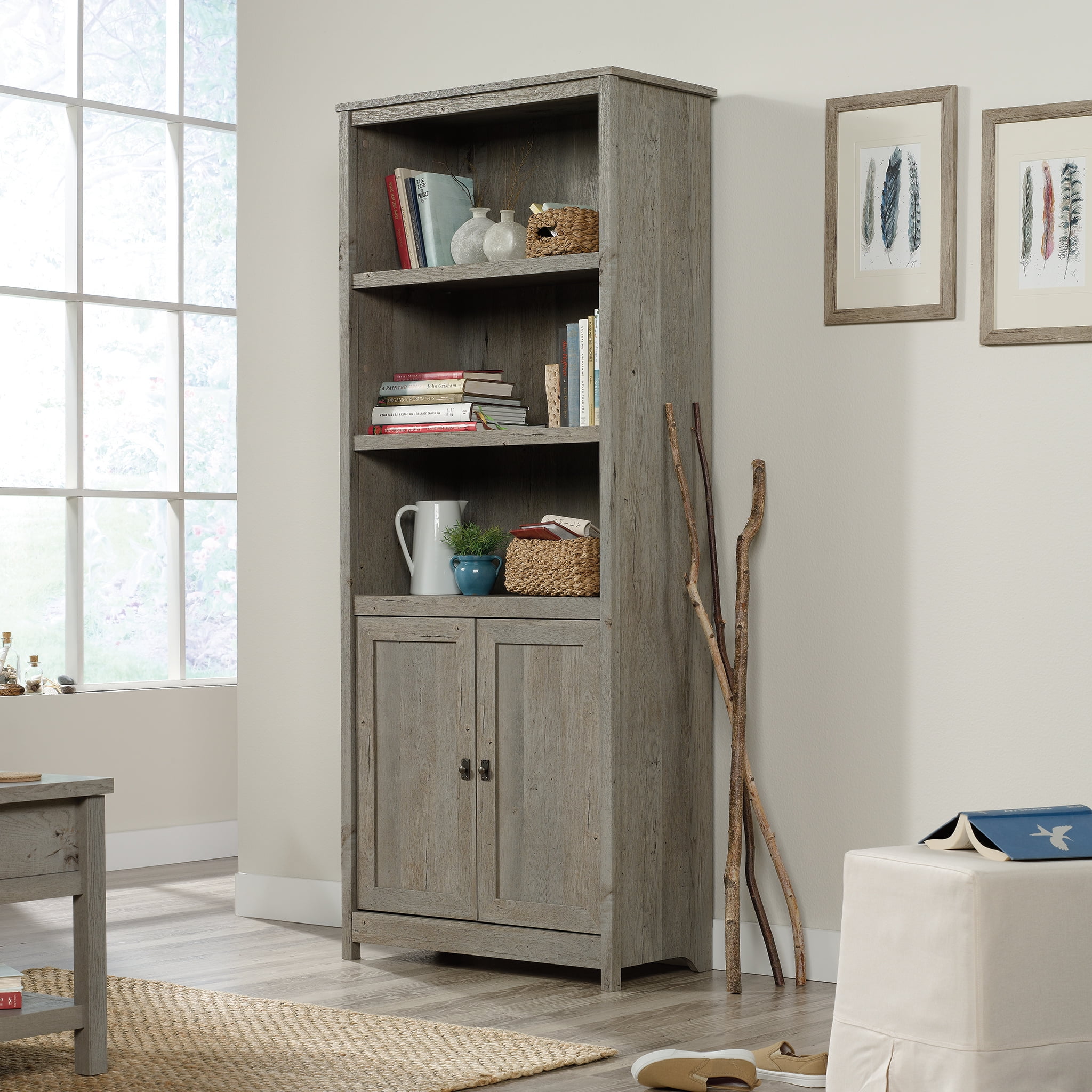 Give your home a fresh new look with this cottage-inspired library with doors from the Cottage Road collection. This charming tall bookcase features three spacious shelves that are ideal for storing and displaying just about anything — from books and awards to decorative plants and knick-knacks. Its two adjustable shelves feature the ability to move and conform to different heights to give you flexible options to create space for items of all different shapes and sizes. Behind its double doors is a hidden storage area that includes an adjustable shelf for additional space to stow away any household items you don’t want seen around your house. Its simple design and classic beauty make this library stand out in any room of your home – the living room, your office, down the hallway, or in the dining room. Finished in Mystic Oak, this handsome bookcase gives your home the style you want with the functionality you have always needed. Features: Finish: Mystic Oak Material: Engineered Wood Three adjustable shelves for flexible storage options Hidden storage behind doors Pre-assembled end panels for quick and easy assembly Specifications: Product Dimensions: 71.5″ H x 29.29″ W x 13.98″ D Product Weight: 97 lbs Weight Capacity: 40 lbs