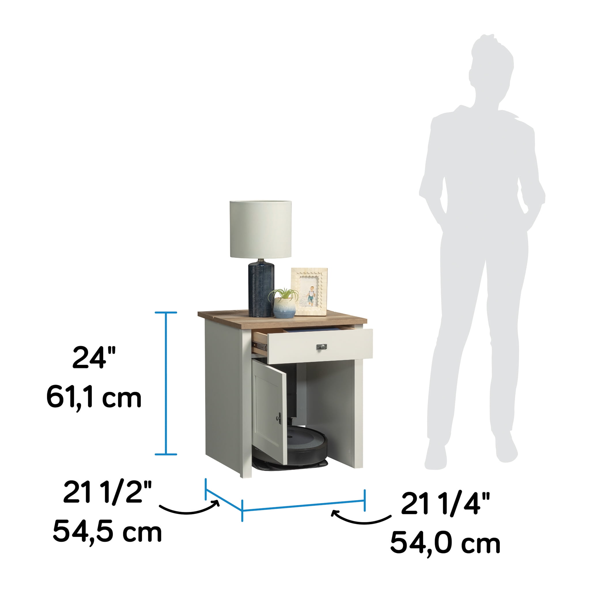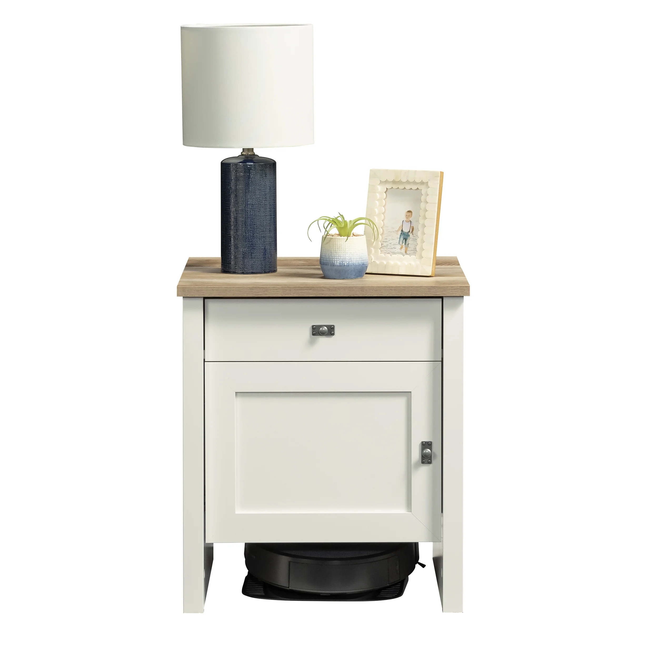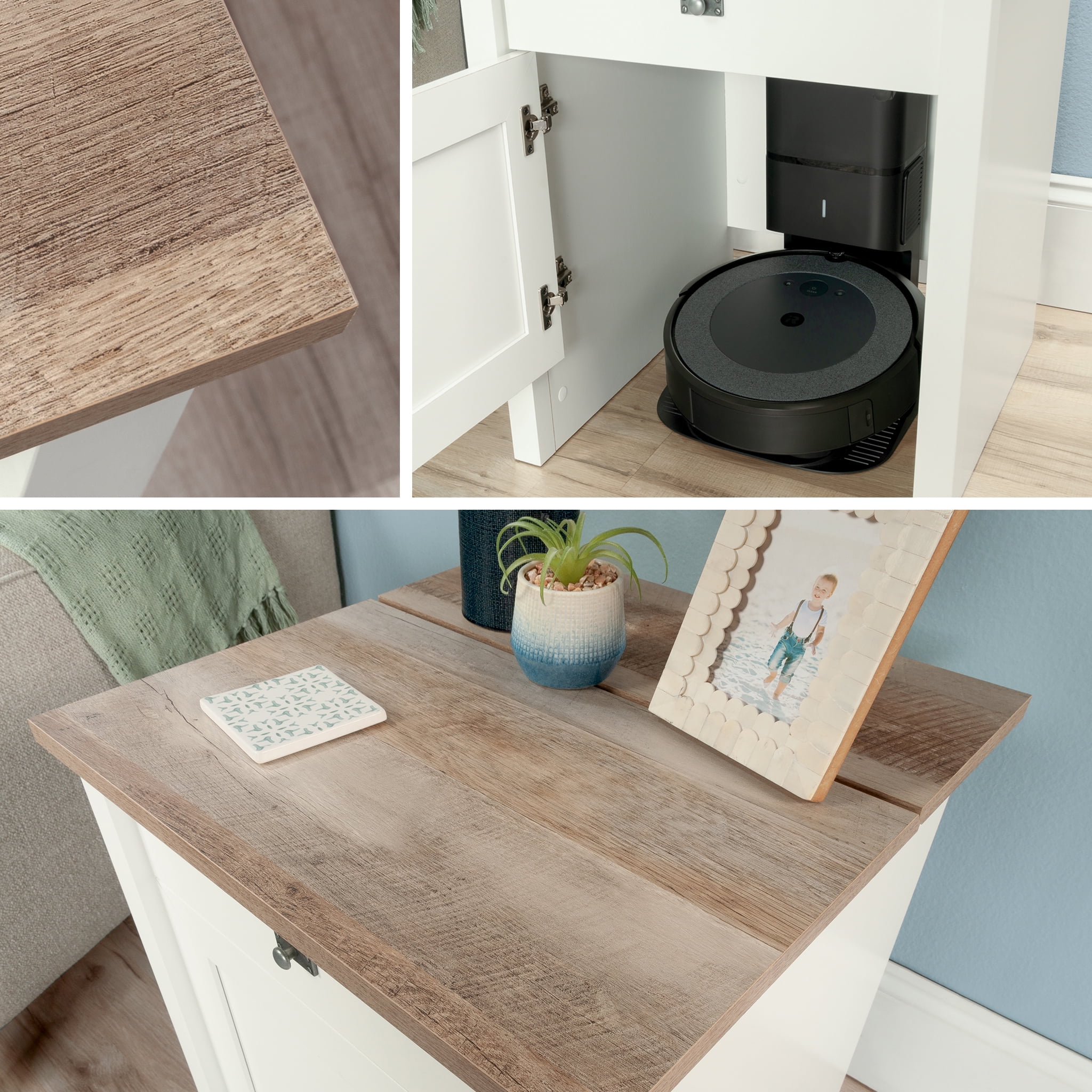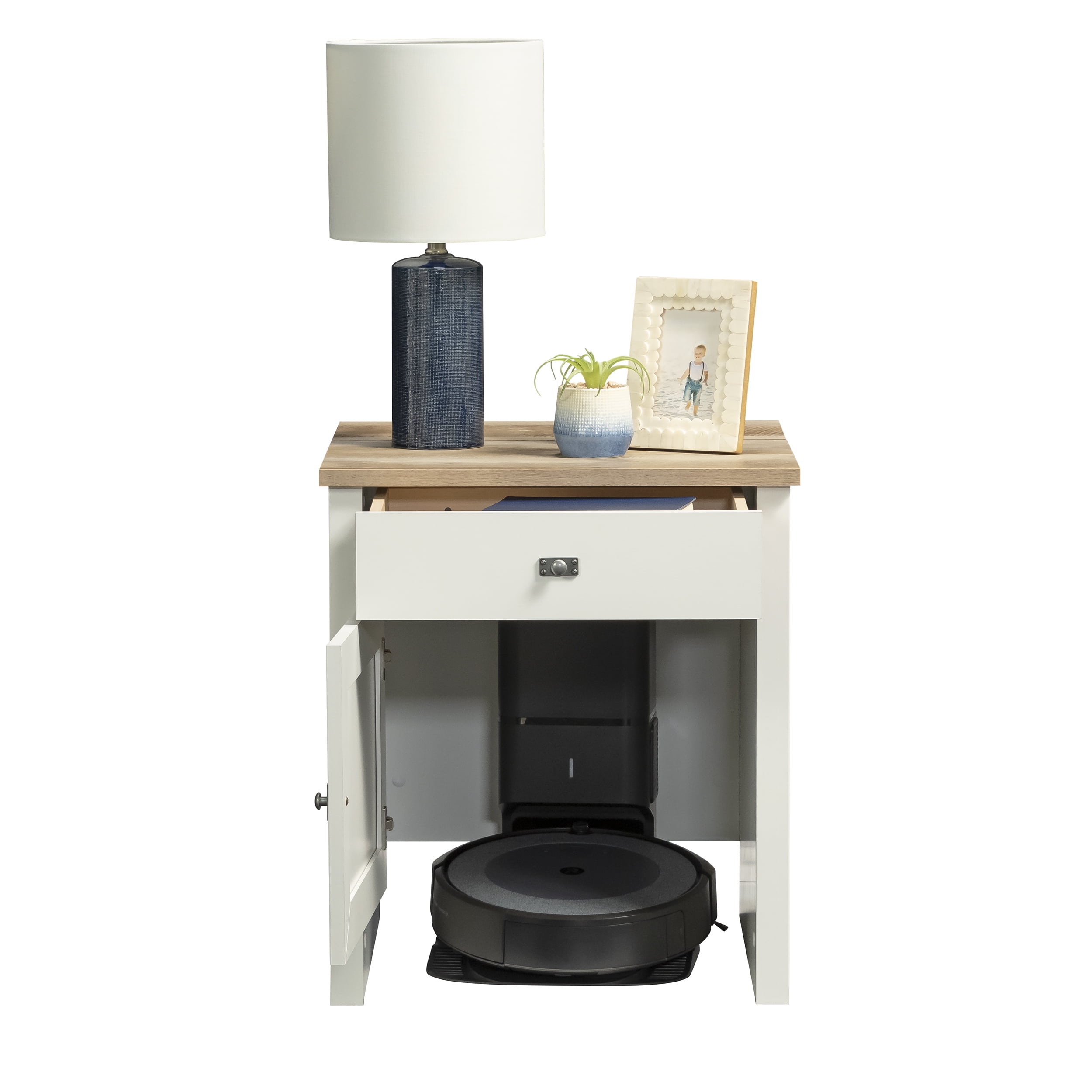Combine the Sauder style and reliability you know and trust with the technology of the patent pending BotStop side table with charging station. This innovative design provides space-saving concepts by stylishly blending hidden space for your robot vacuum with the function of a storage side table. The easy-open door of this robot vacuum storage conceals and quiets the operation of self-emptying docking stations, while the open bottom design allows the vacuum disc easy access and compatibility with most disc style robots and top loading docking stations. The small top panel in the rear of this side table with door flips up for easy access to the vacuum cannister and bag, making cleanup quick, accessible, and easy. A storage drawer features additional space for storing vacuum supplies, with metal runners and safety stops for easy and seamless access. With a Soft White finish on all sides for versatile placement anywhere in your home, and a rustic Lintel Oak accented top, the quaint cottage style of this useful Roomba storage cabinet will make you wonder how you ever lived without it.