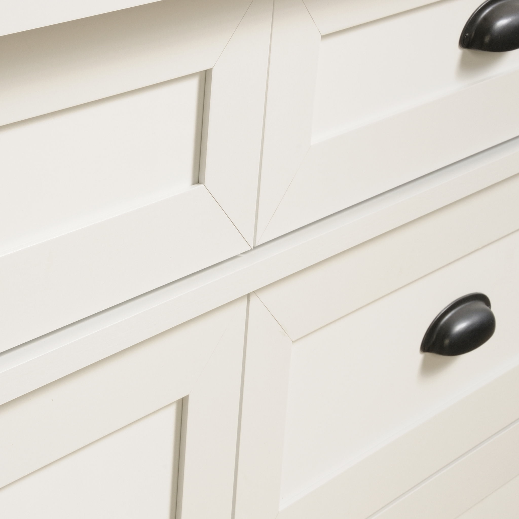 Easily organize your clothes and accessories with this dresser from the County Line collection. This chest of drawers features six large drawers, with the four lower drawers being extra deep for the bulkiest of items like sweaters, jackets, and more. All six spacious drawers open and close on smooth metal runners and are ideal for stashing away anything from your abundance of flannel shirts and blue jeans to your hidden collection of old t-shirts and pajama pants. It has room for all your stuff! This 6-drawer dresser features a roomy top surface that makes a great place to display all your bedroom essentials like an accent lamp, your makeup bag, a mirror and pictures of your family and friends too. Assembly is quick and easy with a T-slot assembly system- making a simple process even easier. Finished in Soft White, this charming dresser adds a flare of country style do your bedroom furniture and décor.