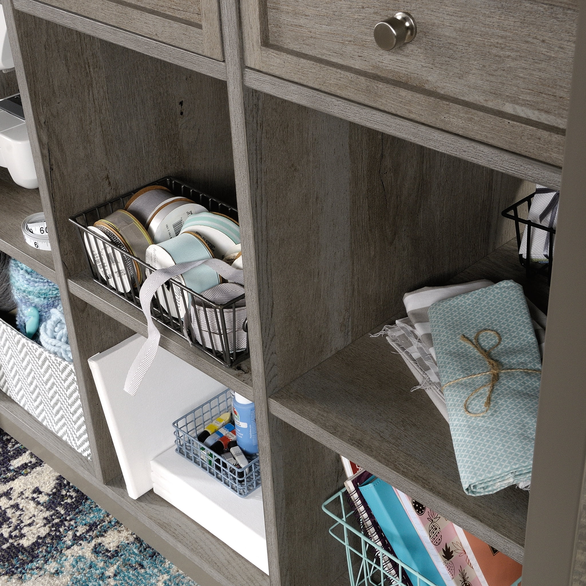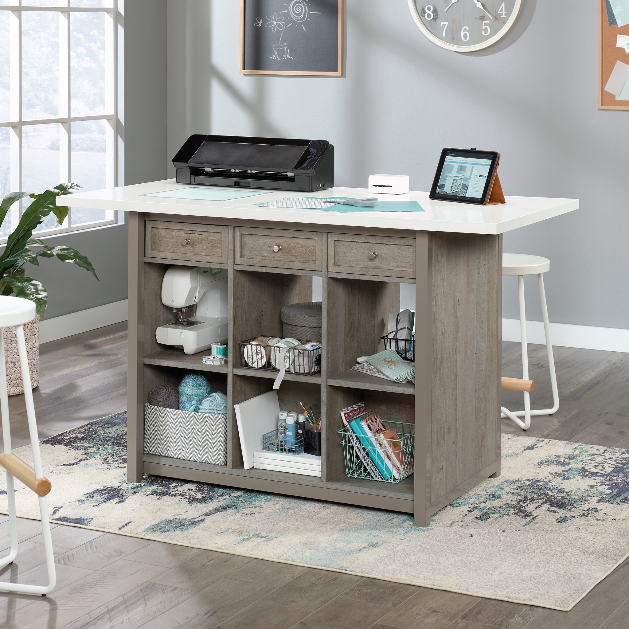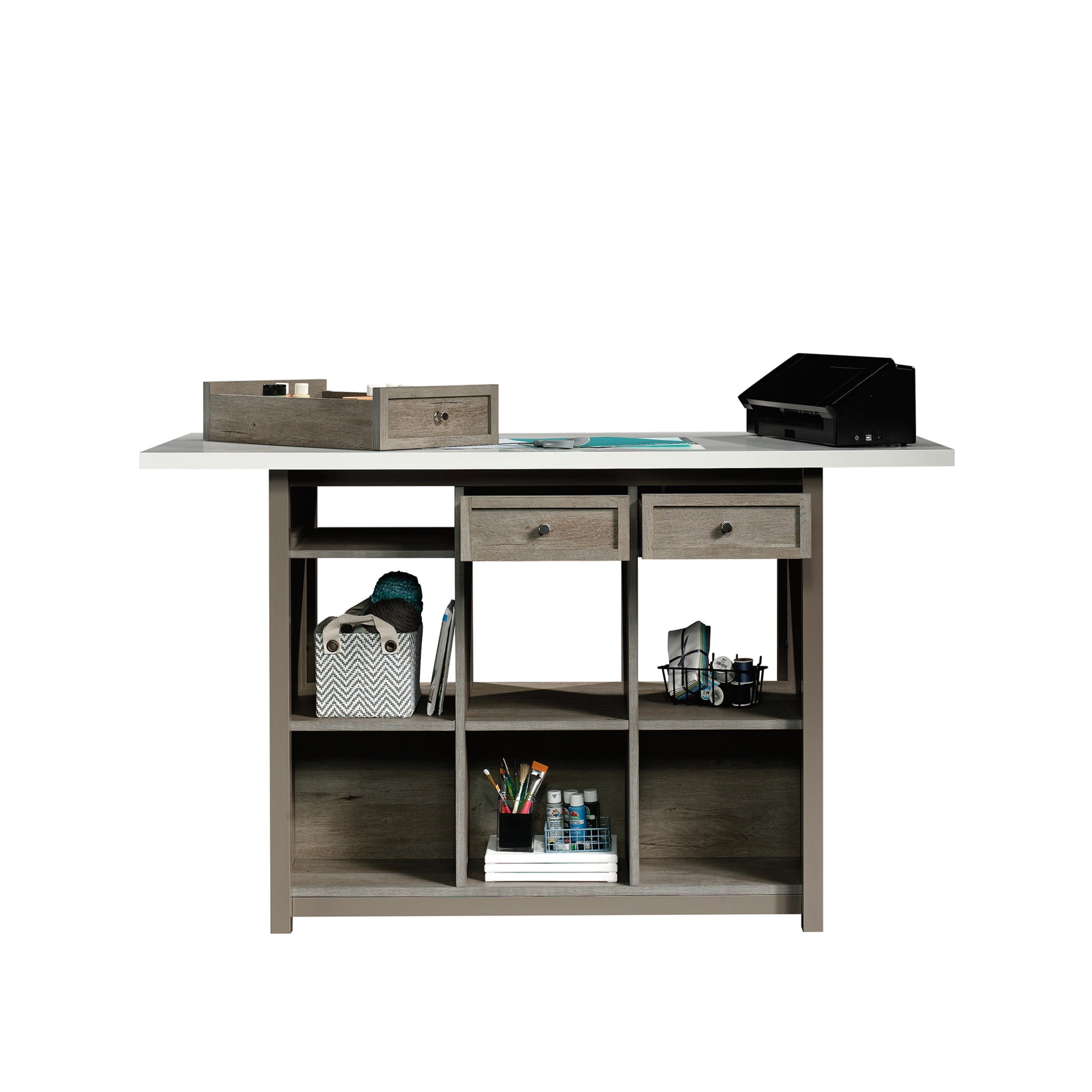 Take your crafting to the next level with the Craft Work Table with Storage from the Craft Pro Series collection. The melamine top surface of this worktable with storage is heat, stain and scratch-resistant: meaning, you can stay worry-free with even the most daring hobby projects. Below the spacious top surface are three storage drawers that can be pulled out from either side of the table for optimal use. These drawers in your crafting table are perfect for smaller items like thread, needles, scissors and more! Even better, the drawers are removable and can function as a tray on the top surface for various craft items. This craft table with storage also includes multiple open shelving display space perfect for a sewing machine or organizing bins. Finished on all sides for versatile placement, this work desk will be stylish and functional no matter where you arrange it. Finished Mystic Oak with White top surface accent, this craft worktable is the perfect upgrade your home needs.