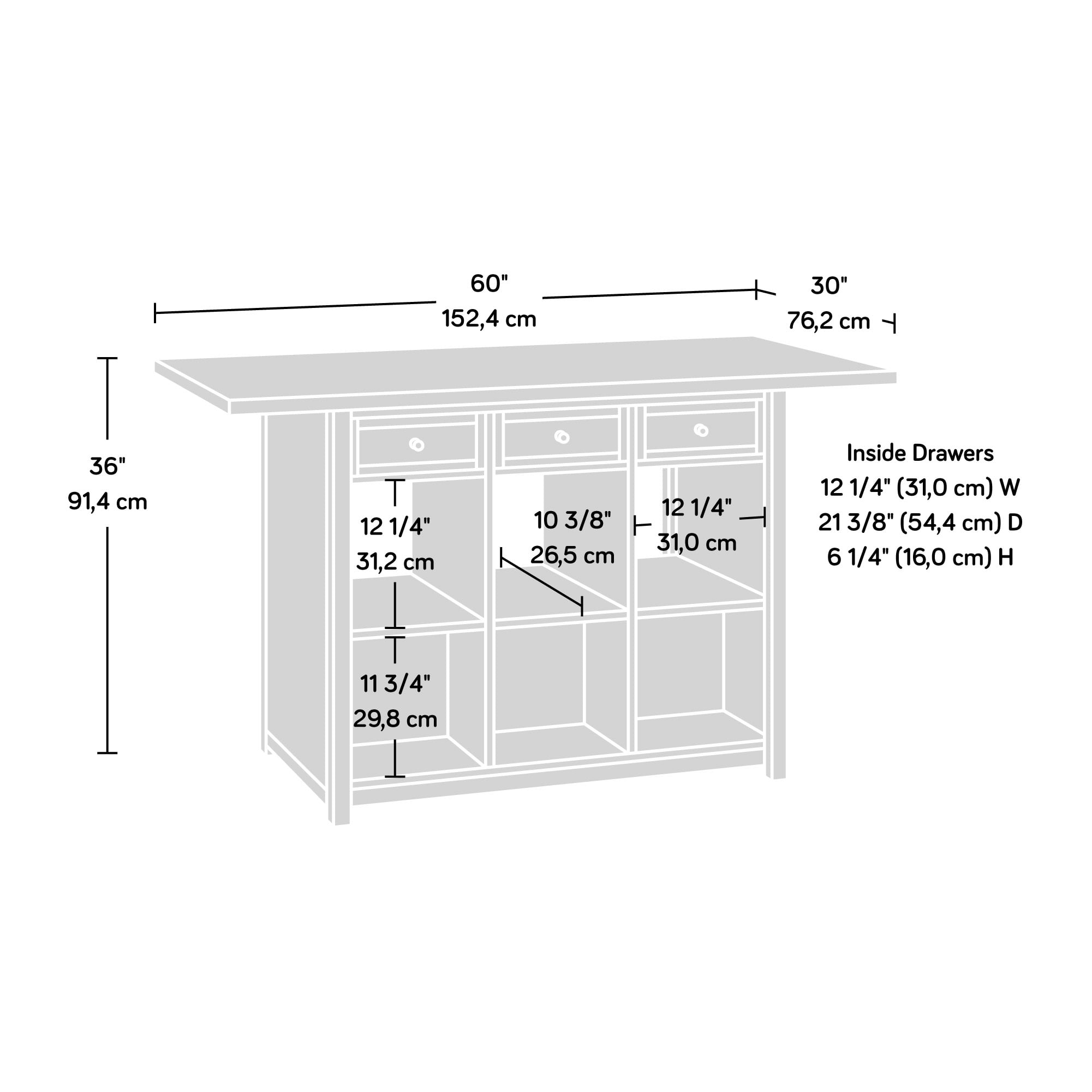 Assembled Dimensions: 60.0″ L x 30.0″ W x 35.98″ H Melamine top surface is heat, stain, and scratch-resistant Three storage drawers can be pulled out from either side of table Drawers are removable and can function as a tray Open shelving for storage and display of home dcor Finished on all sides for versatile placement anywhere in your home Mystic Oak finish Model #: 427456 Box Dimensions: 64.96″ L x 33.86″ W x 8.86″ H For additional questions or any issues, please contact the manufacturer at 1-800-523-3987. Be sure to check out the Sauder Craft Pro Series collection for more great items!
