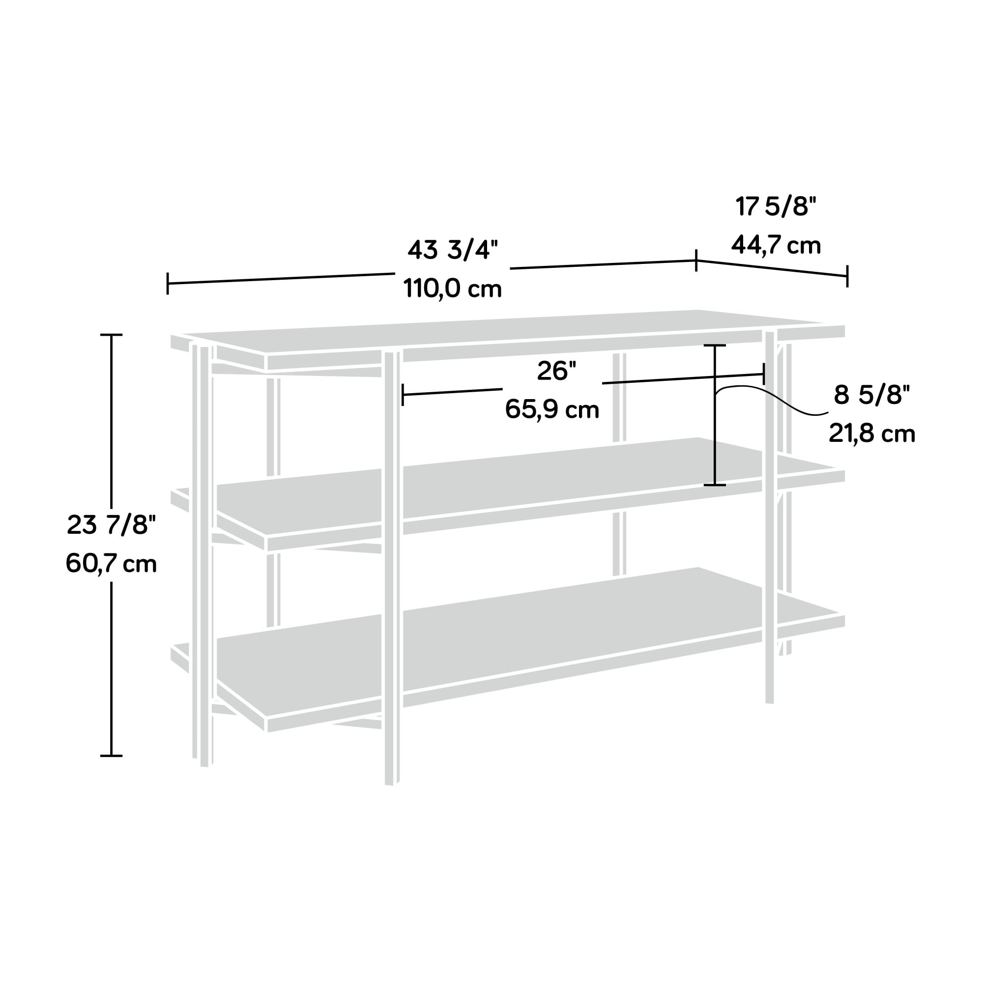 Assembled Dimensions: 43.7″ L x 17.56″ W x 23.86″ H Accommodates up to a 42″ TV weighing 50 lbs. or less Sturdy, 1″ thick top and shelves Finished on all sides for versatile placement Powder coated metal frame Simple, no tools required assembly Charter Oak finish Model #: 427787 Box Dimensions: 44.69″ L x 17.64″ W x 6.61″ H For additional questions or any issues, please contact the manufacturer at 1-800-523-3987. Be sure to check out the Sauder Curiod collection for more great items!