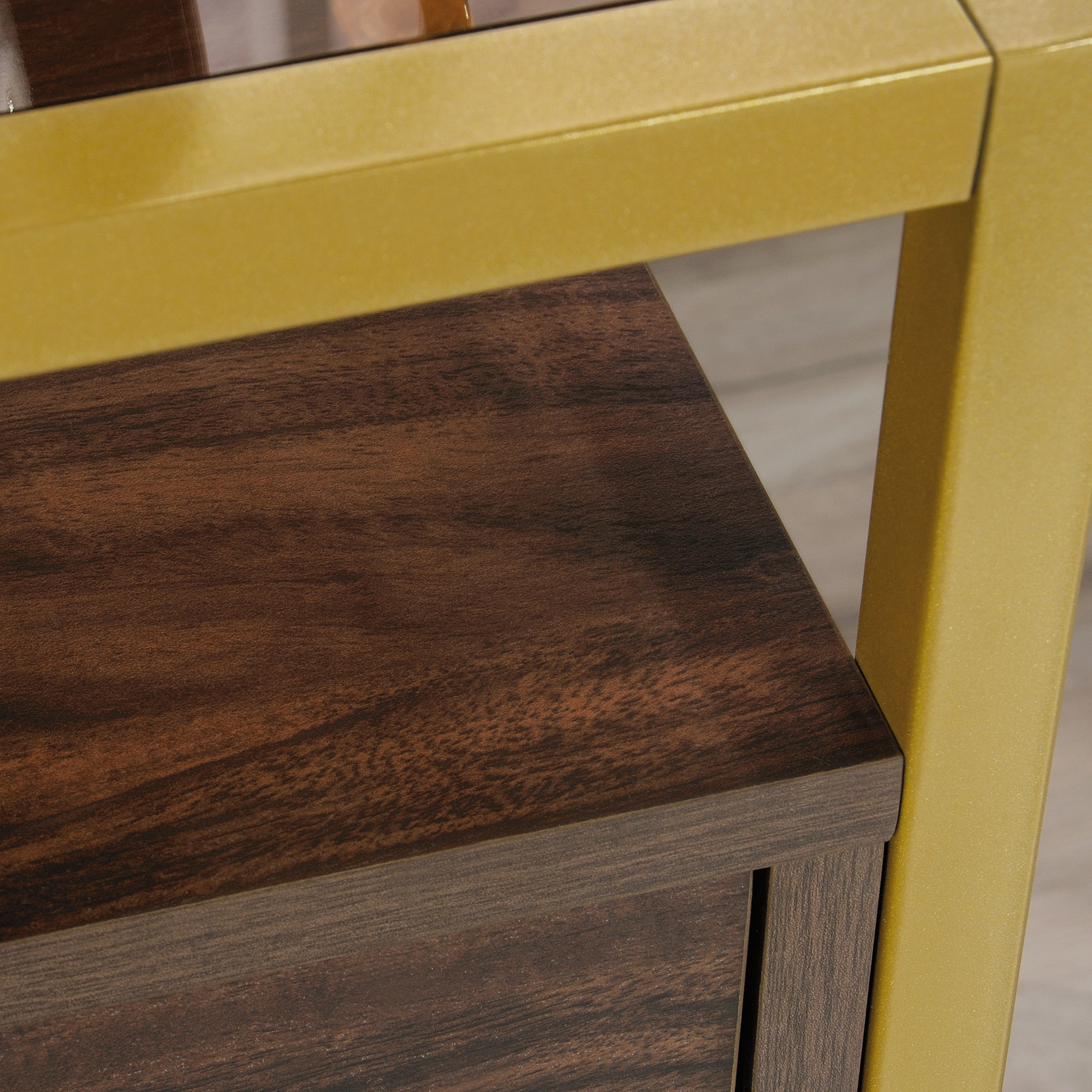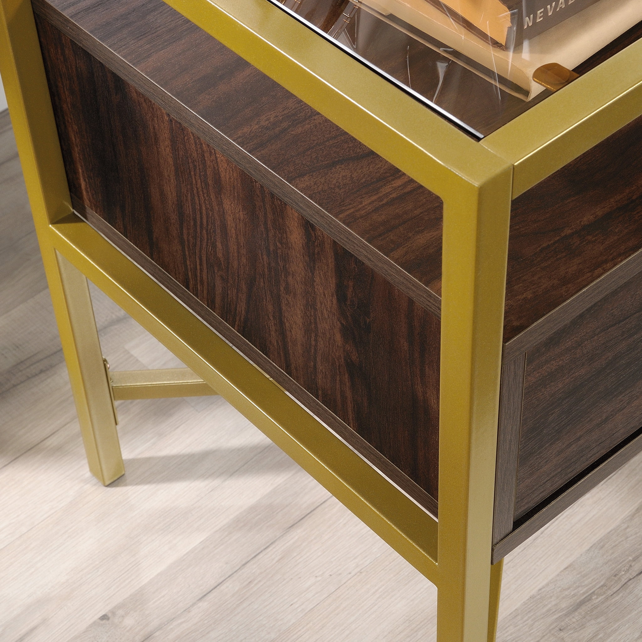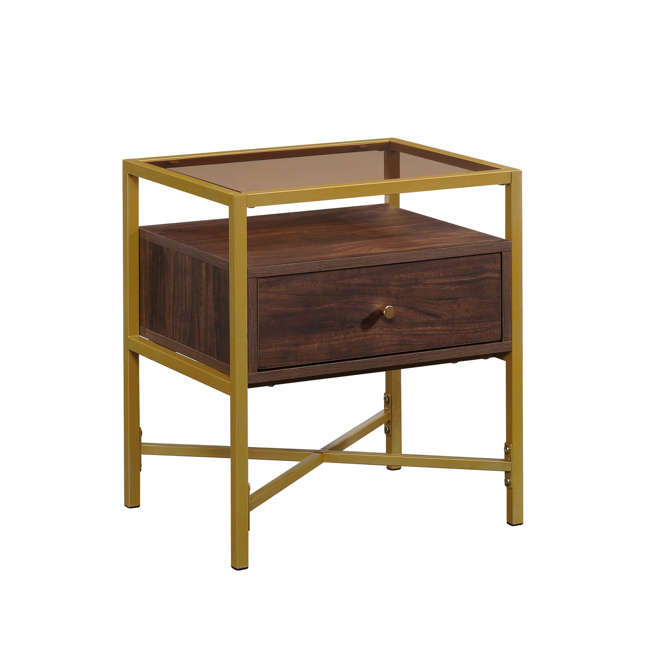 Is your living room looking a bit boring and bland? Add a little style and glam to your home decor with this wood and metal side table from the Harper Heights collection. This glass top side table offers a spacious top surface with all room for items like a lamp, framed photos, coasters, and ice-cold drinks. The tinted, safety-tempered glass top adds an extra touch of luxurious style that is sure to stand out. The contemporary side tables open shelf provides easy-access storage to stow away items like your reading glasses and TV remote. Plus, the lower storage drawer opens and closes on smooth metal runners for a convenient spot to store items like books, crossword puzzles, and your secret stash of sweets. Attractive from every angle, this side table with storage is finished on all sides for versatile placement. Finished in Rich Walnut and paired with a durable, powder-coated metal frame in gold, this stunning glass top end table is sure to catch the eye of all your guests.