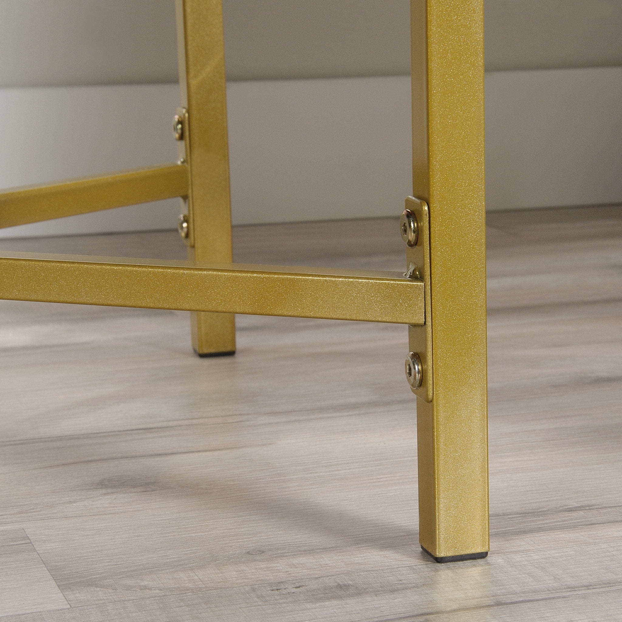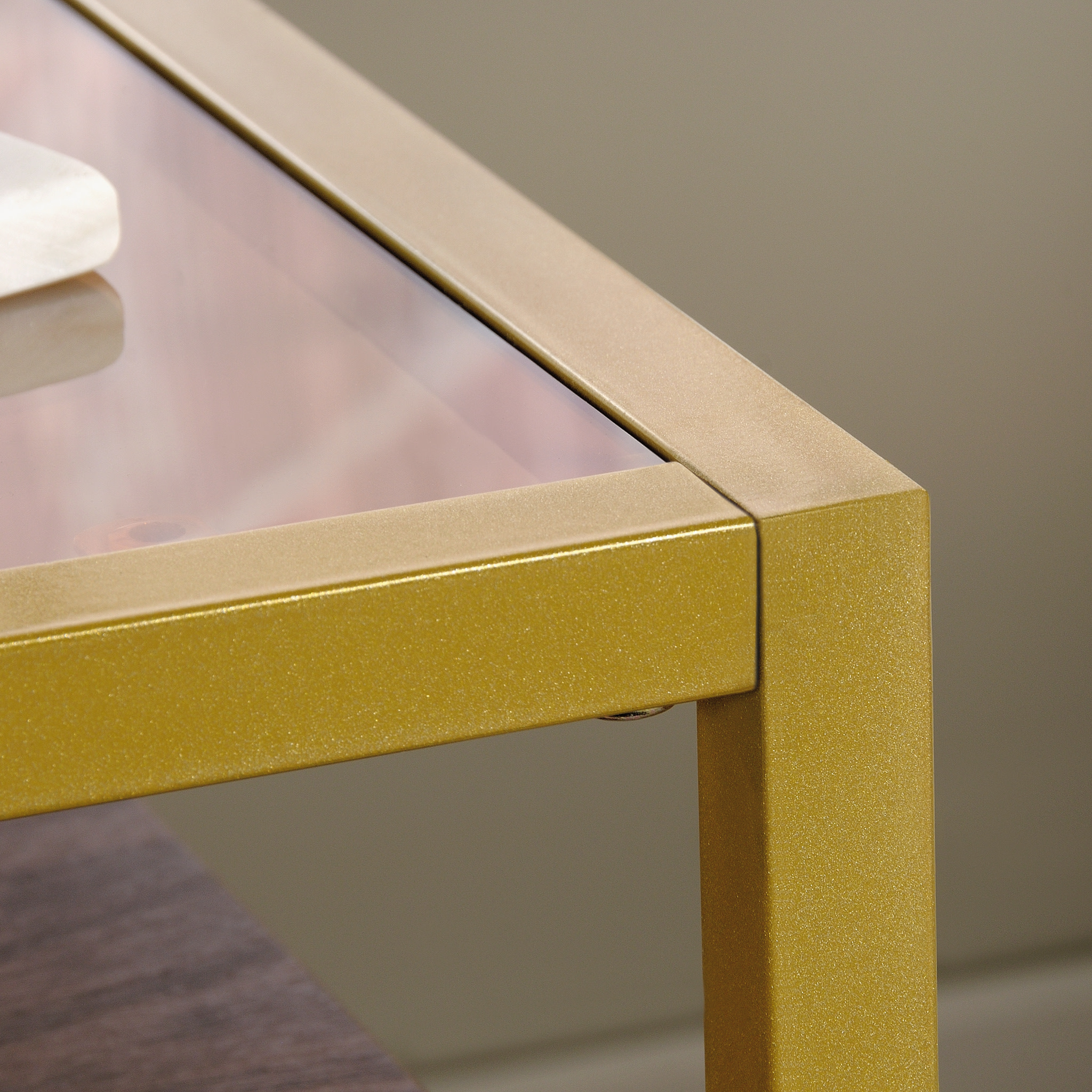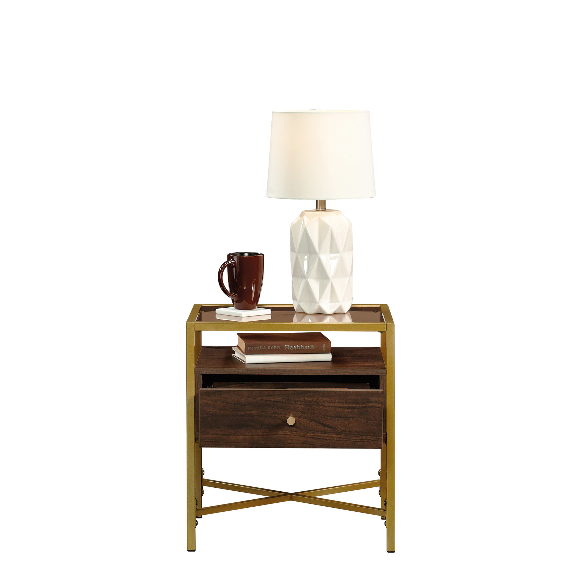 Is your living room looking a bit boring and bland? Add a little style and glam to your home decor with this wood and metal side table from the Harper Heights collection. This glass top side table offers a spacious top surface with all room for items like a lamp, framed photos, coasters, and ice-cold drinks. The tinted, safety-tempered glass top adds an extra touch of luxurious style that is sure to stand out. The contemporary side tables open shelf provides easy-access storage to stow away items like your reading glasses and TV remote. Plus, the lower storage drawer opens and closes on smooth metal runners for a convenient spot to store items like books, crossword puzzles, and your secret stash of sweets. Attractive from every angle, this side table with storage is finished on all sides for versatile placement. Finished in Rich Walnut and paired with a durable, powder-coated metal frame in gold, this stunning glass top end table is sure to catch the eye of all your guests.