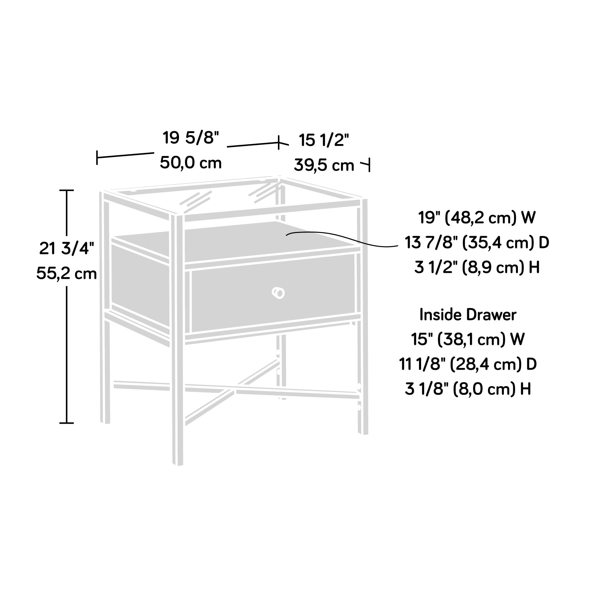 Assembled Dimensions: 19.69″ L x 15.55″ W x 21.73″ H Tinted, safety-tempered glass top because we care about you and your family Open shelf for additional storage of your favorite home dcor Drawer features metal runners and safety stops Finished on all sides for versatile placement anywhere in your home Powder coated metal frame for durability Rich Walnut finish Model #: 430884 Box Dimensions: 29.13″ L x 20.47″ W x 5.63″ H For additional questions or any issues, please contact the manufacturer at 1-800-523-3987. Be sure to check out the Sauder Curiod collection for more great items!