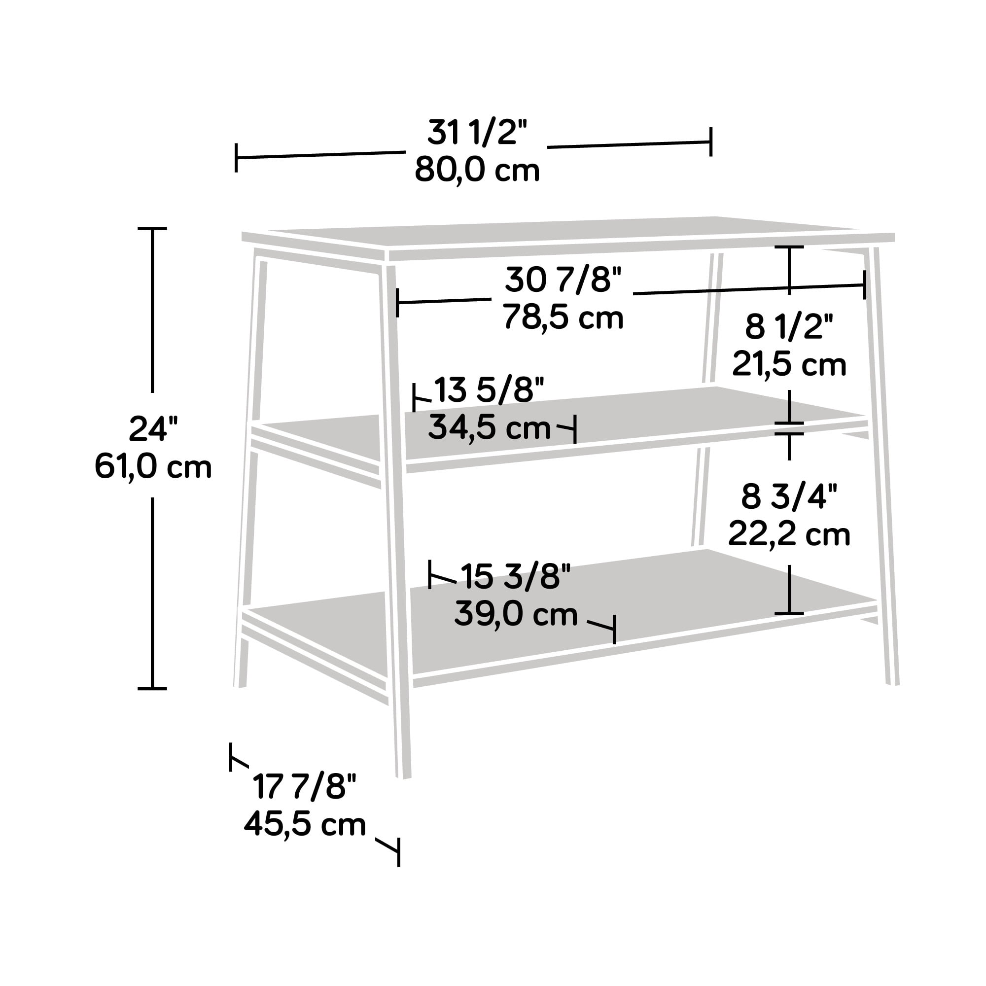 Assembled Dimensions: 31.5″ L x 17.91″ W x 24.21″ H Accommodates up to a 36″ TV weighing 50 lbs. or less Combine two units to accommodate up to a 70″ TV weighing 95 lbs. or less Two spacious shelves hold audio/video equipment Finished on all sides for versatile placement Durable, black metal frame Charter Oak finish Model #: 427783 Box Dimensions: 34.45″ L x 20.0″ W x 4.25″ H For additional questions or any issues, please contact the manufacturer at 1-800-523-3987. Be sure to check out the Sauder Curiod collection for more great items!