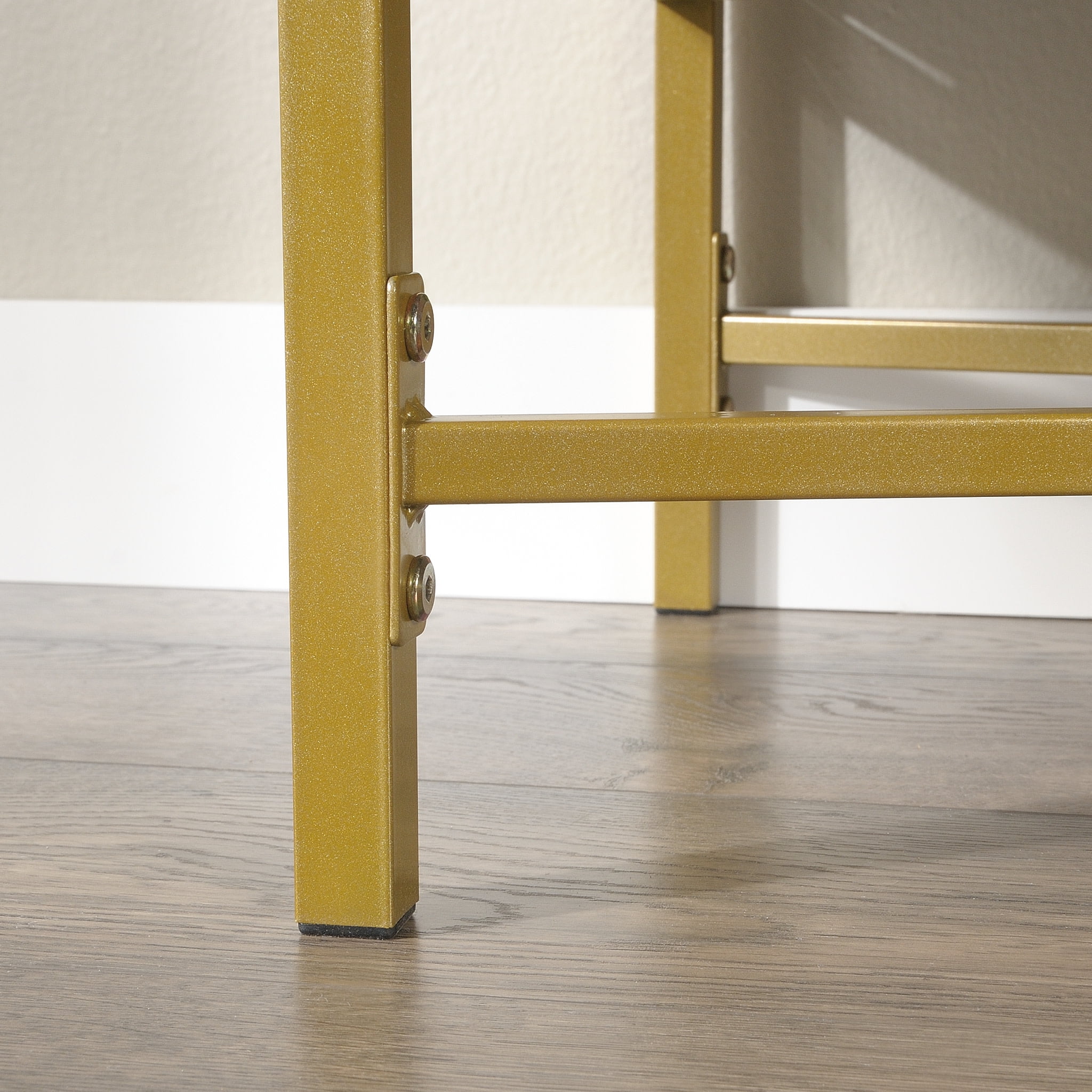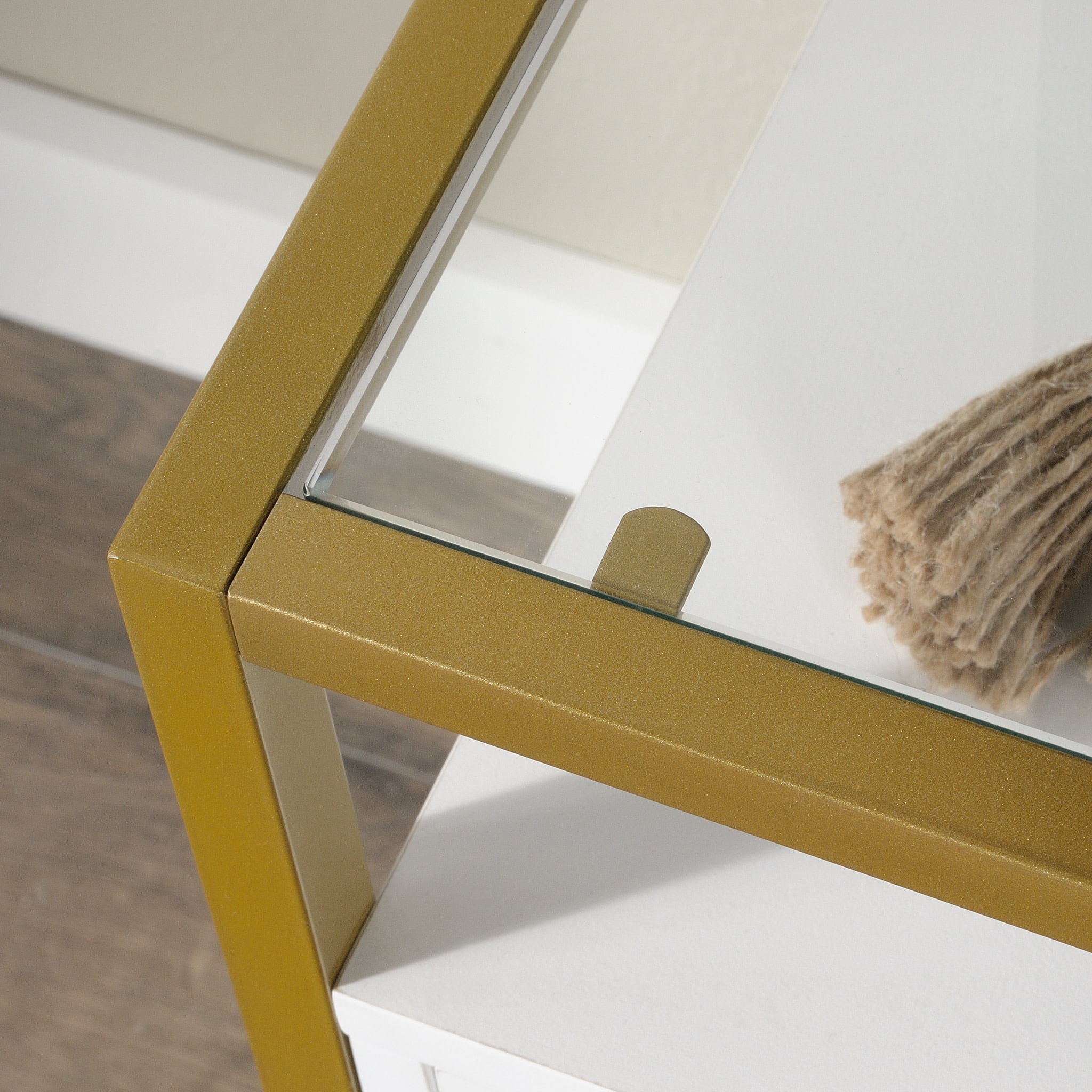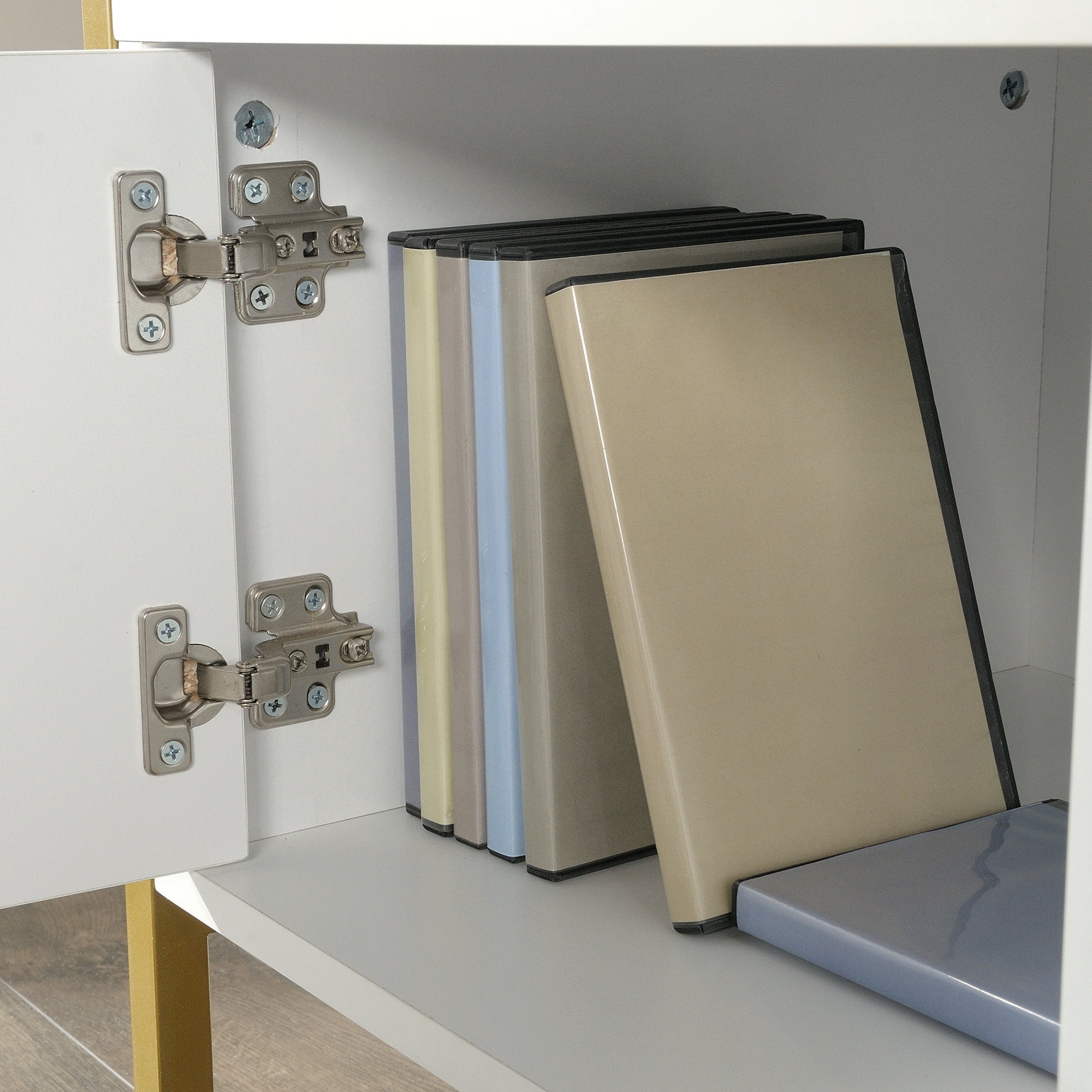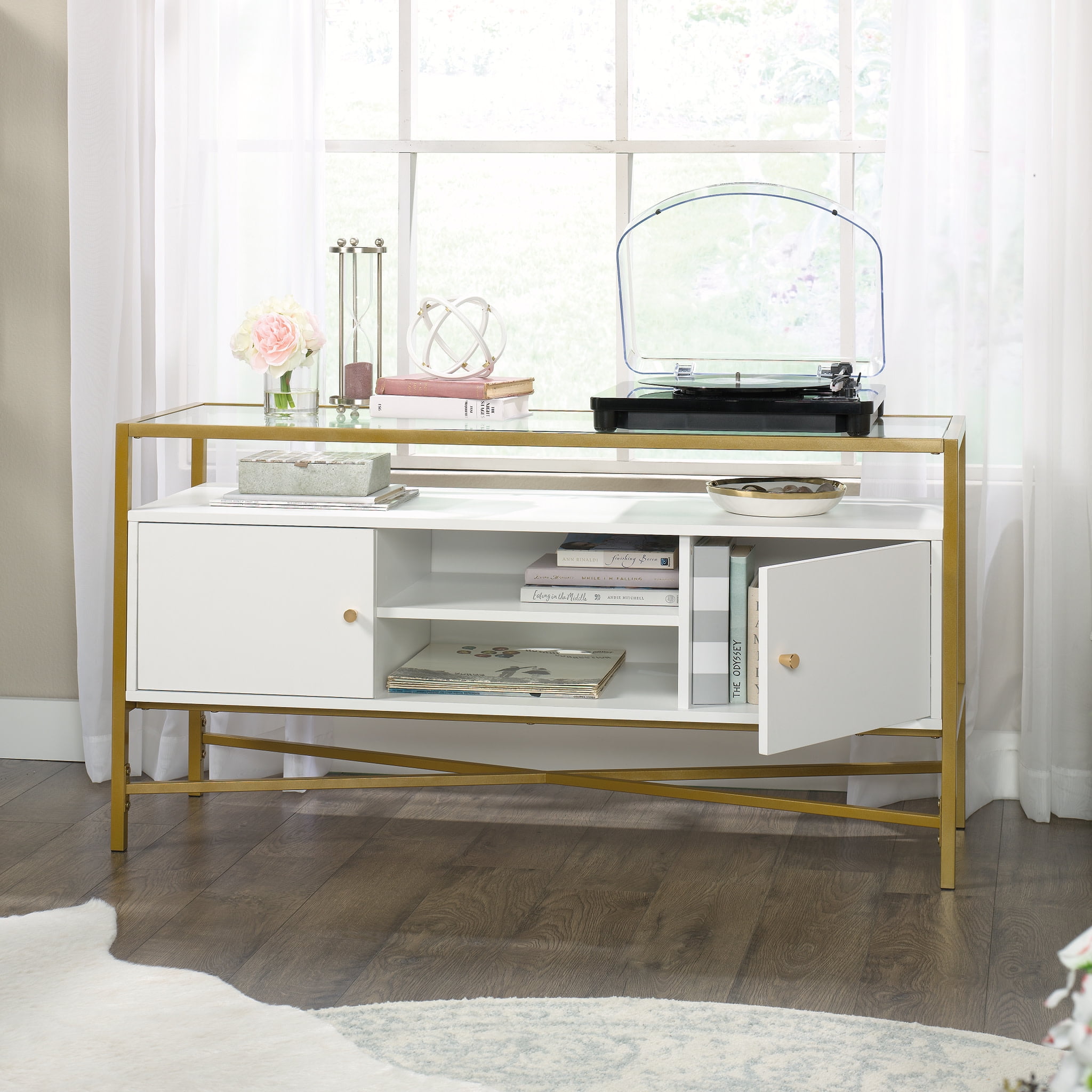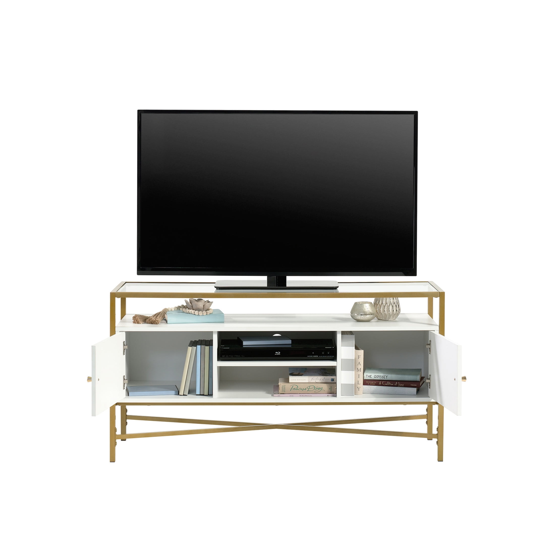 Classy and chicwhat more could you want? Give your living room the update it deserves with the stunning style and modern design of this contemporary credenza from the Harper Heights collection. This entertainment credenza accommodates up to a 55 TV, making it the perfect spot to binge watch your favorite new sitcom or host all-day movie marathons with your friends. The tinted, safety-tempered glass top adds an extra touch of luxurious style that is sure to stand out. The storage credenzas large open shelf provides the perfect spot for audio and video equipment or home decor items. The fixed center shelf provides additional space to store and display items like books, knick-knacks, and framed photos. Plus, the hidden storage area behind each door creates a convenient place for items you prefer to keep out of sight. Finished in white and detailed with a durable, powder-coated metal frame in gold, this good-looking glass top credenza is just what youve been looking for.