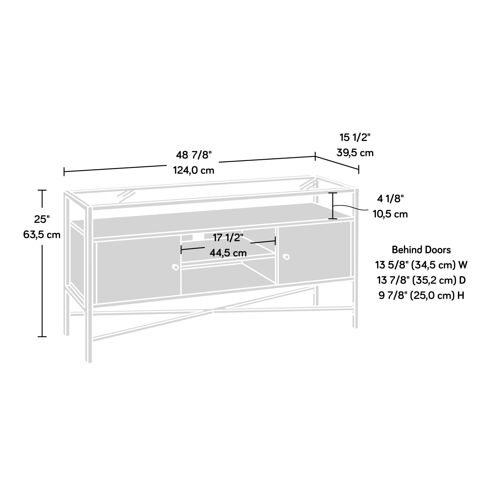 Assembled Dimensions: 48.82″ L x 15.55″ W x 25.0″ H Accommodates up to a 55″ TV weighing 50 lbs. or less Safety-tempered glass top because we care about you and your family Large open shelf holds audio/video equipment or your favorite home dcor Fixed center shelf with cord access Hidden storage behind each door helps to conceal your clutter and chaos Powder coated metal frame for durability White finish Model #: 430888 Box Dimensions: 52.99″ L x 18.03″ W x 7.01″ H For additional questions or any issues, please contact the manufacturer at 1-800-523-3987. Be sure to check out the Sauder Curiod collection for more great items!