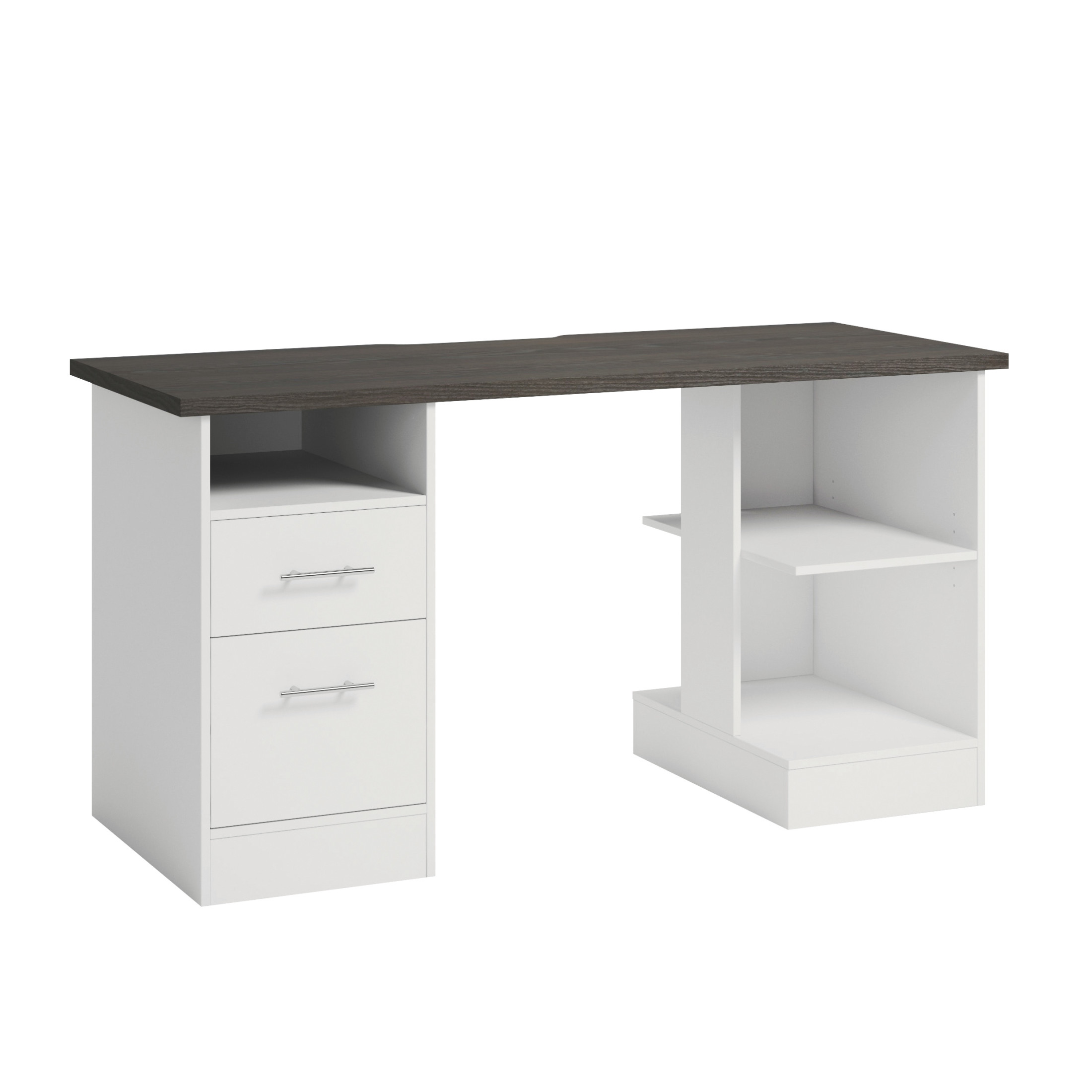 Are you up for the challenge? You will be with this gaming desk from the Sauder Select collection. This desk with storage is equipped with desk pedestals that can be fastened on either the left or right side for maximum customization to your game set up needs. This home computer desk features two drawers with full extension slides, while the lower drawer holds letter-size hanging files. The open storage pedestal includes an adjustable shelf and allows optimal airflow to computer towers, which is a must have in desks for gaming. The pedestal with the storage drawers includes an open storage cubby with a cord management grommet hole for headphones, chargers, and other gaming items. This small computer desk is finished on all sides for versatile placement in any room of your home and looks polished from every angle. Finished in White with Charcoal Ash accented top surface, set your highest score with this versatile and customizable home gaming desk.