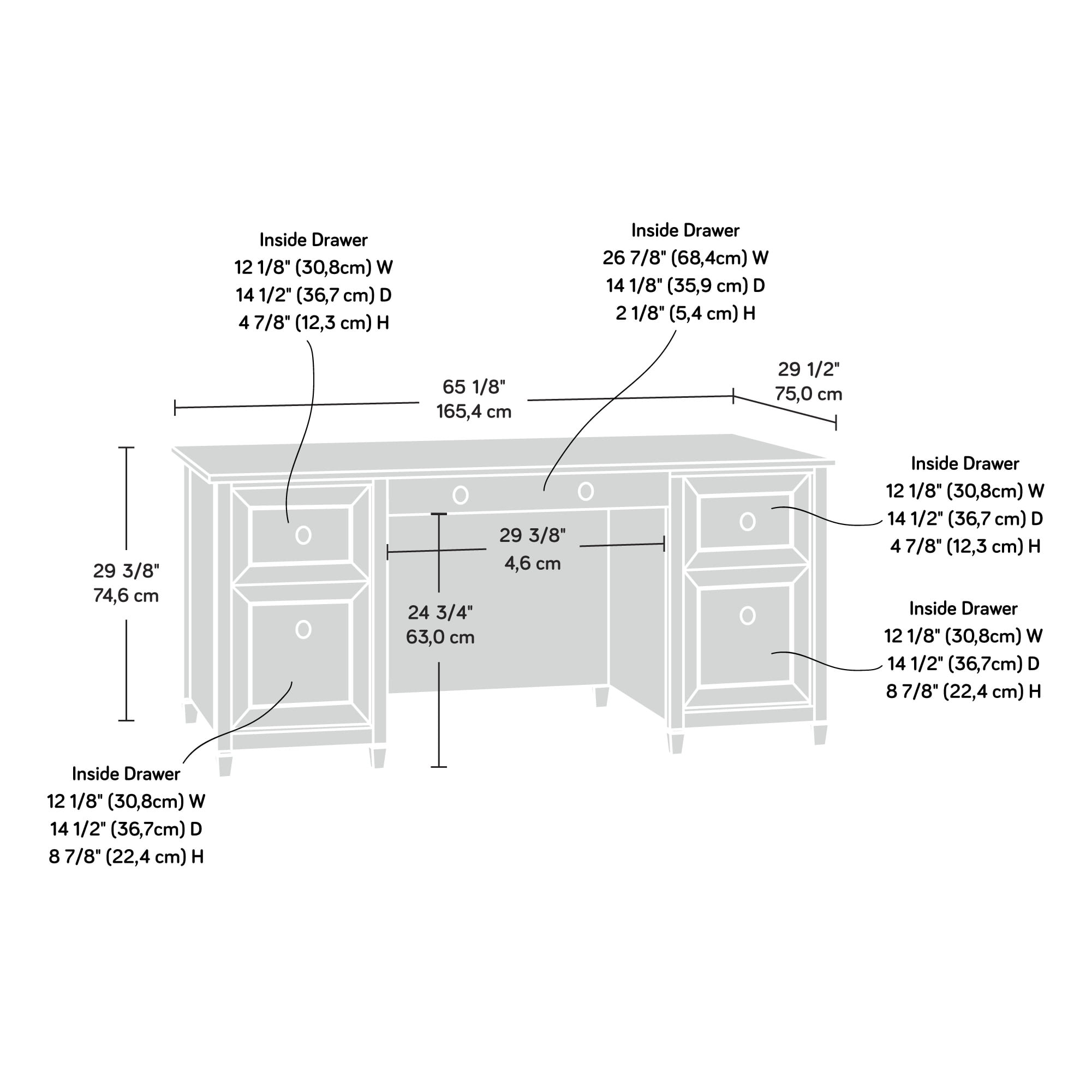 Assembled Dimensions: 65.12″ L x 29.53″ W x 29.37″ H Large drawer/shelf with metal runners and safety stops features flip-down panel for keyboard/mouse Two file drawers with full extension slides hold letter-size hanging files Two small drawers with metal runners and safety stops Desk top has grommet hole for electrical cord access Pre-assembled end panels for quick and easy assembly Chalked Chestnut finish Model #: 418795 Box Dimensions: 70.28″ L x 32.28″ W x 11.22″ H For additional questions or any issues, please contact the manufacturer at 1-800-523-3987. Be sure to check out the Sauder Edge Water collection for more great items!