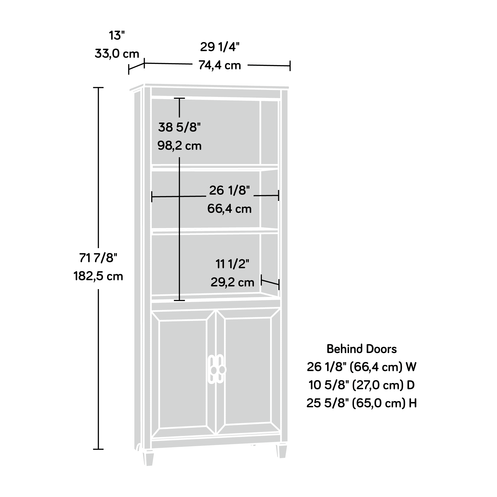 Assembled Dimensions: 29.29″ L X 12.99″ W X 71.85″ H Three adjustable shelves Hidden storage behind doors to conceal your clutter and chaos Estate Black finish Model #: 409046 For additional questions or any issues, please contact the manufacturer at 1-800-523-3987. Be sure to check out the Sauder Edge Water collection for more great items!