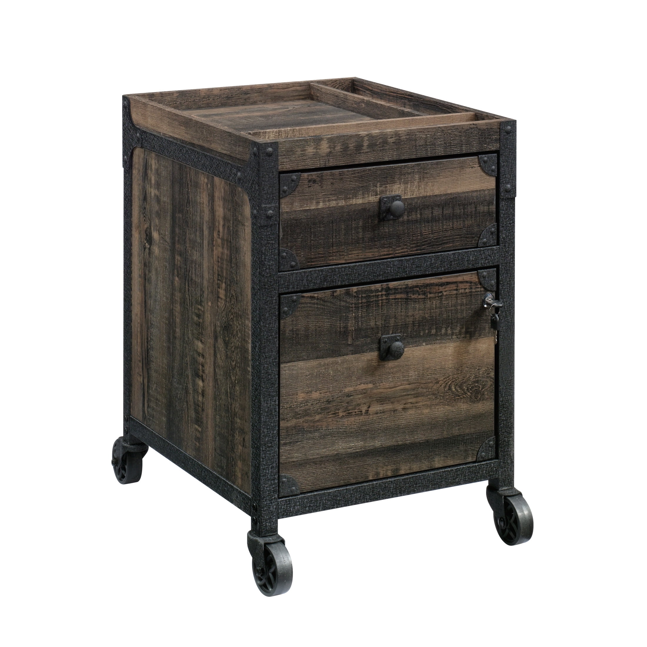 No office is complete without a handy spot to store important files and miscellaneous supplies. Find a versatile and mobile storage option for your office or home office while adding beautiful style and rustic-inspired design with this pedestal filing cabinet from the Foundry Road collection. This 2-drawer file cabinet comes fully assembled, with minimal hardware attachment required, so you can finish your office set-up and begin using your commercial filing cabinet quickly and easily. Both drawers glide on full extension slides, offering convenient full drawer access. The lower drawer locks for security and will hold letter or legal-size hanging files. For movement under the desk or around the office, this mobile file cabinet includes casters (two locking) so you can rearrange when necessary and easily access the divided, open storage area on top. This industrial filing cabinet is finished on all sides for versatile placement – it will look polished from every angle. Finished on all sides in Carbon Oak and accented with a powder coated metal frame and corner accents, this versatile file cabinet makes a great add-on to any office.