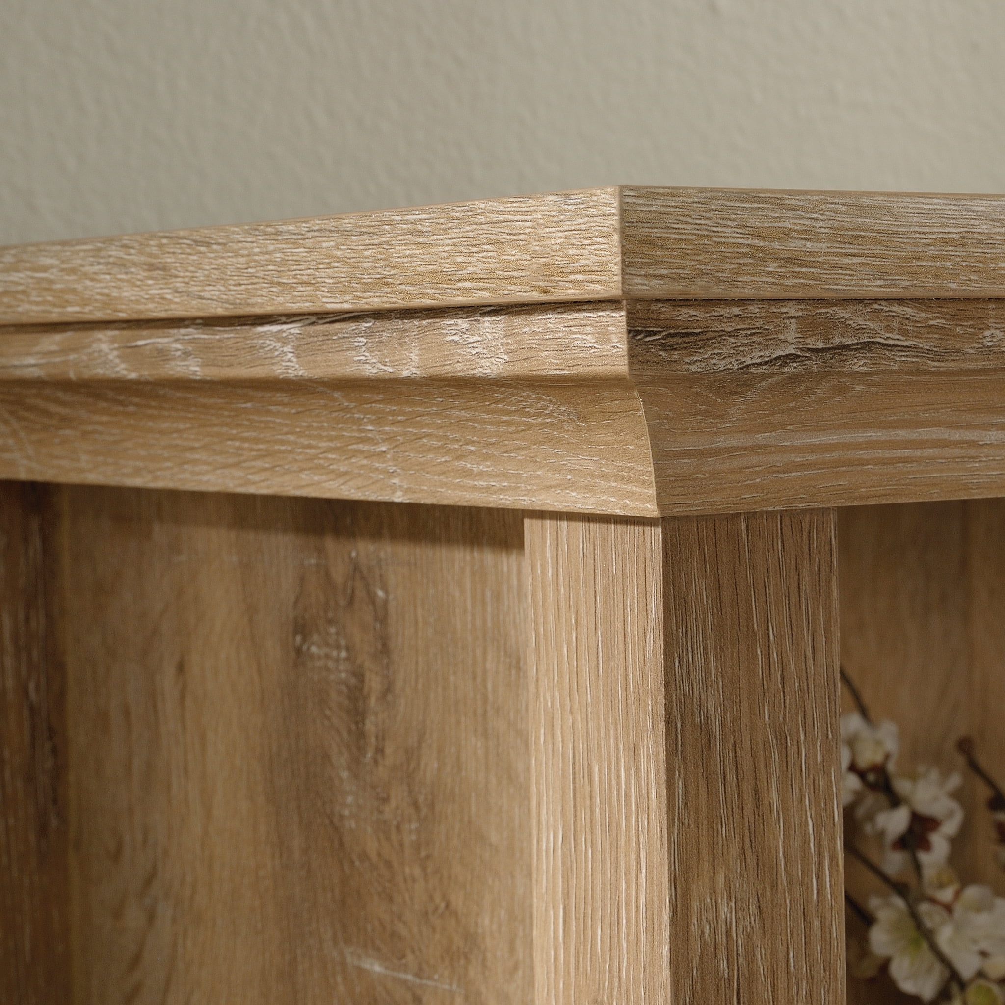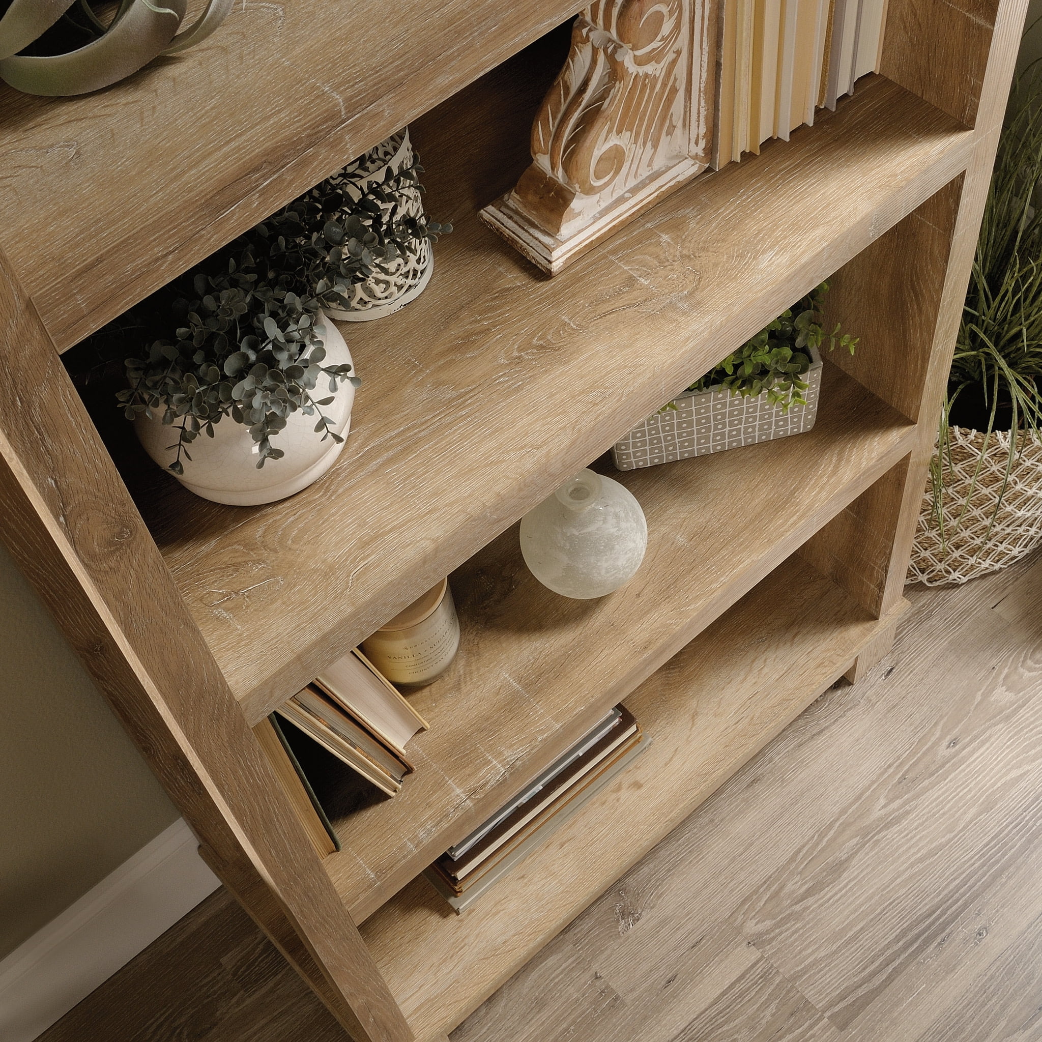 Add a little extra storage and a whole lot of style to any room in your home with this 4-shelf bookcase from the Garden Villa collection. This tall bookcase features a strong and lightweight panel construction that makes this display bookcase easy to move if you decide to redecorate or reposition it within your home. Its four large shelves offer easy access storage of household items like your books, stacks of culinary magazines, and organizing bins. These spacious shelves also make a great spot to display home décor items like decorative plants, your favorite knick-knacks, and framed photos of your family and friends. Its charming good looks and versatile design make this tall bookshelf a great fit for any room in your home. Finished in Orchard Oak™, this tall display bookcase is the storage solution that your home needs.We hope you like what you see. Sauder designers travel the world and bring back the best and latest in style, finish, and color trends. This inspiring world travel is evident in the cutting edge and innovative furniture solutions we offer to you!