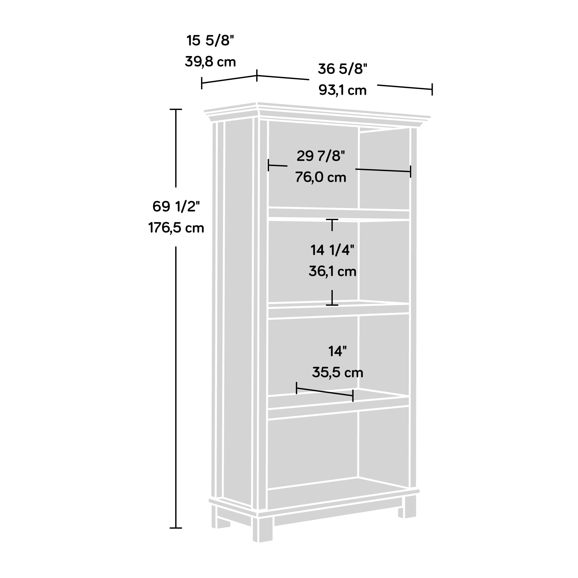 Assembled Dimensions: 36.65″ L X 15.67″ W X 69.49″ H Strong and lightweight panel construction for long lasting durability Four shelves for storage and display of your favorite home décor Shelves hold books, binders, framed photos, collectibles and more Detailed instruction book for easy assembly Orchard Oak finish Model #: 424106 Box dimensions: 71.28″ L X 20.09″ W X 9.13″ H For additional questions or any issues, please contact the manufacturer at 1-800-523-3987. Be sure to check out the Sauder Garden Villa collection for more great items!