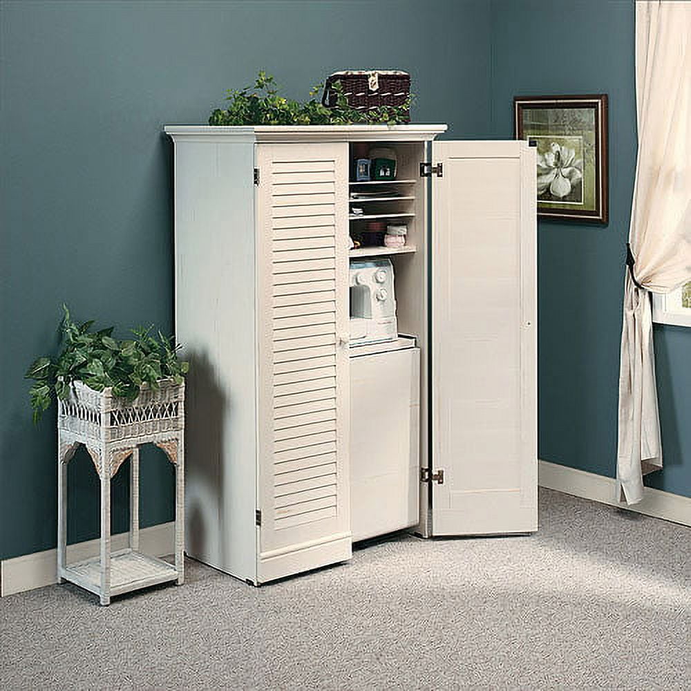 Make all your crafting dreams come true with this sewing cabinet armoire from the Harbor View collection. Behind its louver-detailed doors saves space and conceals a convenient storage area for all your miscellaneous crafting and sewing supplies, like scrapbook paper, scissors, fabric and your glue gun. Store it all in this stylish craft armoire. The cubbyhole storage area includes six adjustable shelves to store and organize craft supplies. Adjustable shelves create flexible storage for items of all different shapes and sizes. Use the large, pull-out shelf with full-extension slides and a drop-leaf extension to create a versatile craft or sewing workspace. The center shelf includes a power strip with two outlets to power a glue gun or charge batteries. The lower slide-out shelf glides on smooth metal runners making supplies and tools easily accessible. Finished in Antiqued White, this one-of-a-kind craft armoire lets you craft like a pro!