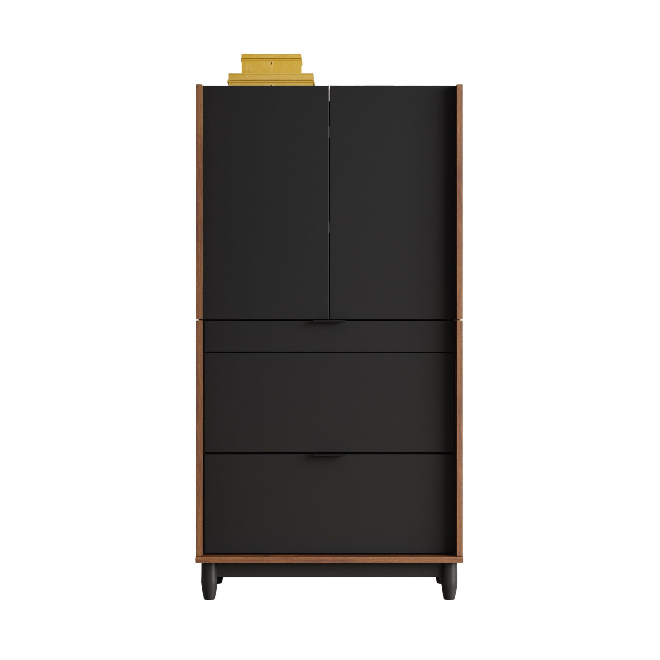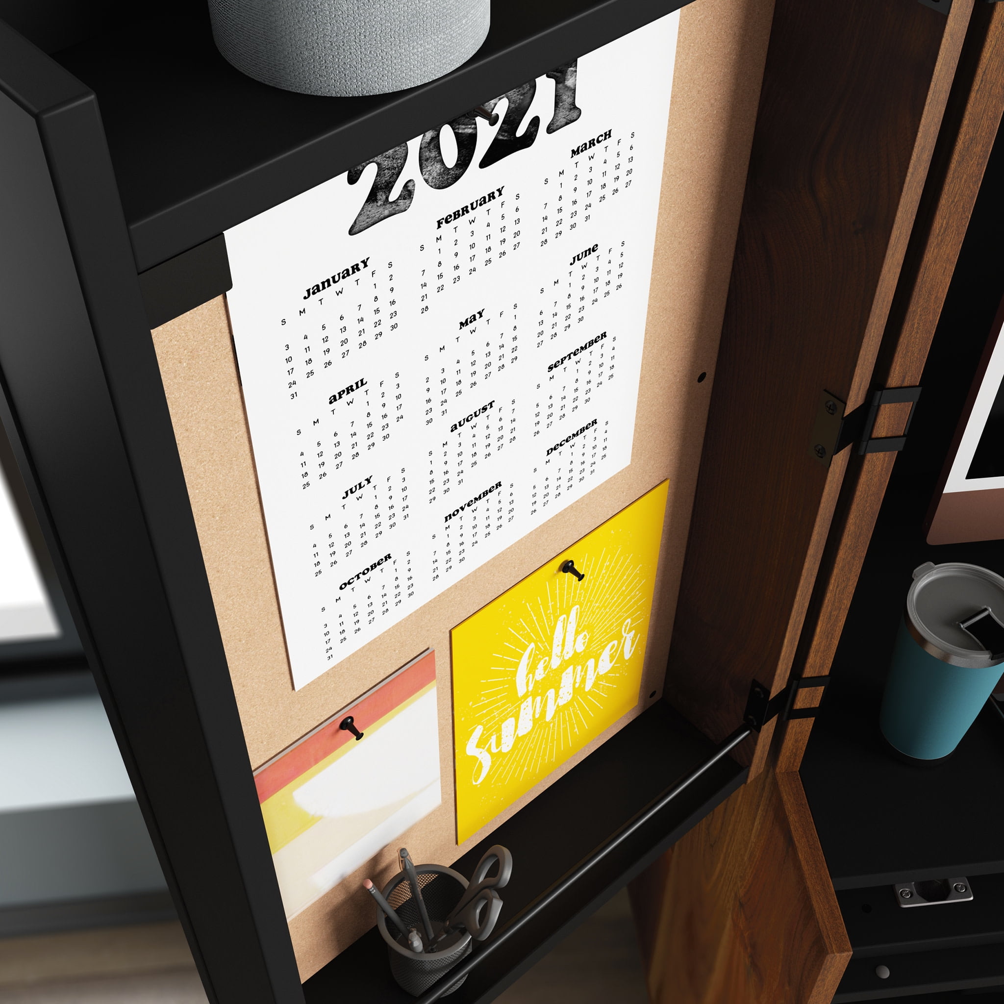 Who doesn’t love a multifunctional cabinet? This computer cabinet from the Harvey Park® collection is the organizers dream. The hidden area behind the swing-out doors reveals various cubbyhole storage options for sticky notes, pens, and books. The upper doors have a metal retaining rod on the lower shelves to keep office supplies from falling out. The left door of this computer storage cabinet features a cork bulletin board, and the right door features two adjustable shelves that feature a retaining lip. Wow! This computer desk cabinet is customizable and includes infinite amounts of storage capabilities. The flip-down molding reveals a slide-out keyboard/mouse shelf for easy storage. The lower barrister door of this wood computer cabinet flips up and slides back into the cabinet. A lower file drawer with full extension slides holds letter or legal-size hanging files to keep documents close at hand. If that’s not enough, a cord management system allows for reduced cord clutter. Finished in Grand Walnut® with Black accents, this computer desk with storage cabinet is just what your home office is missing. Features: Materials: Engineered wood Finish: Grand Walnut and Black Hidden area behind swing-out doors reveals cubbyhole storage. Upper doors have metal retaining rod on lower shelves Left door features cork bulletin board. Right door features two adjustable shelves with retaining lip. Flip-down molding reveals slide-out keyboard/mouse shelf. Lower barrister door flips up and slides back into cabinet. File drawer with full extension slides holds letter or legal size hanging files. Cord management. Specifications: Product Dimensions: 59.69″H x 30.87″W x 16.85″D Product Weight: 151.36 lbs Weight Capacity: 35 lbs