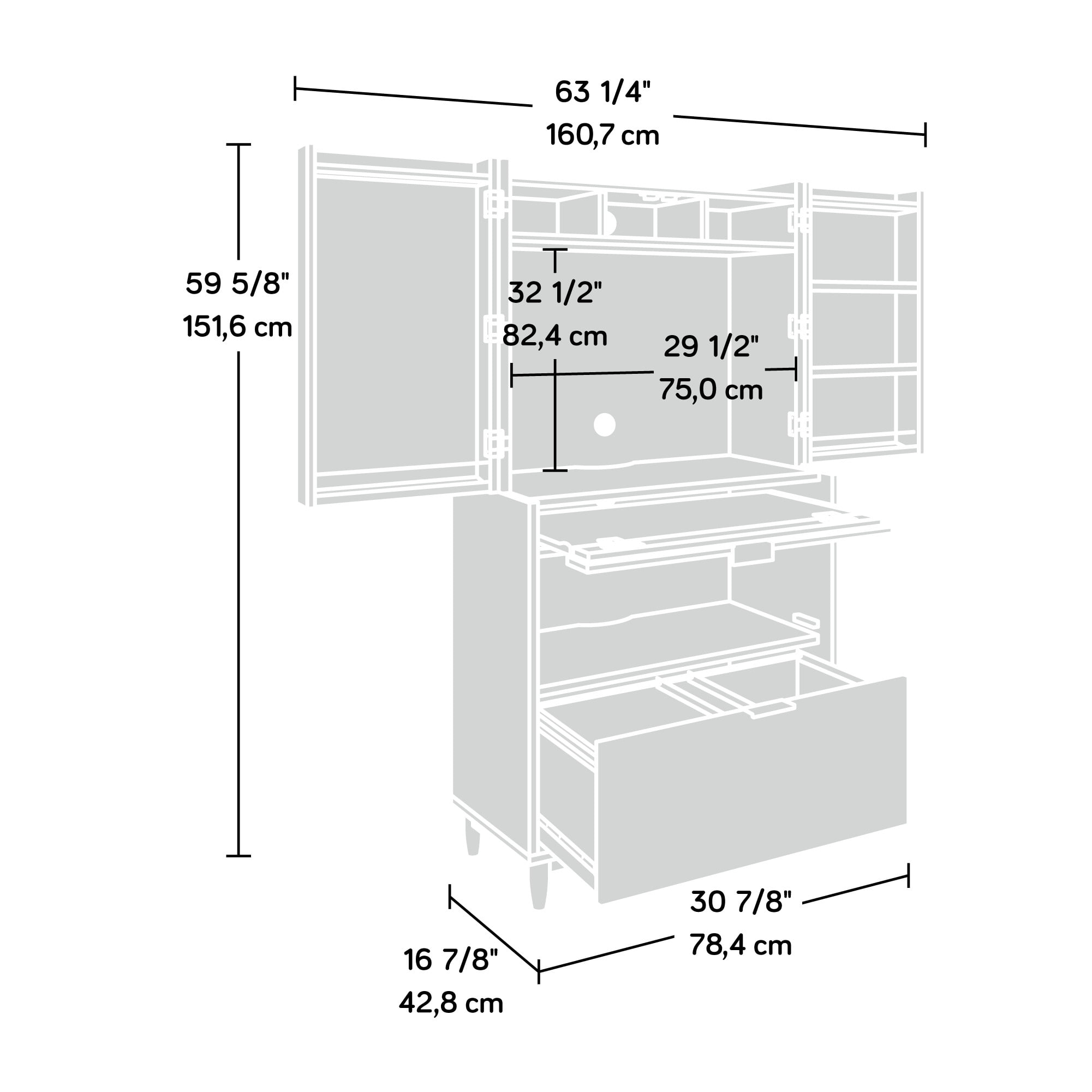 Assembled Dimensions: 30.87″ L x 16.85″ W x 59.69″ H Hidden area behind swing-out doors reveals cubbyhole storage Upper doors have metal retaining rod on lower shelves Left door features cork bulletin board Right door features two adjustable shelves with retaining lip Flip-down molding reveals slide-out keyboard/mouse shelf Lower barrister door flips up and slides back into cabinet File drawer with full extension slides holds letter or legal size hanging files Cord management Grand Walnut finish with Black accents Model #: 430053 Box 1 Dimensions: 20.08″ L x 38.39″ W x 8.86″ H Box 2 Dimensions: 17.52″ L x 35.83″ W x 6.89″ H For additional questions or any issues, please contact the manufacturer at 1-800-523-3987. Be sure to check out the Sauder Harvey Park collection for more great items! This items ships in multiple cartons. If picking up in stores, please ensure you have enough room in your vehicle.