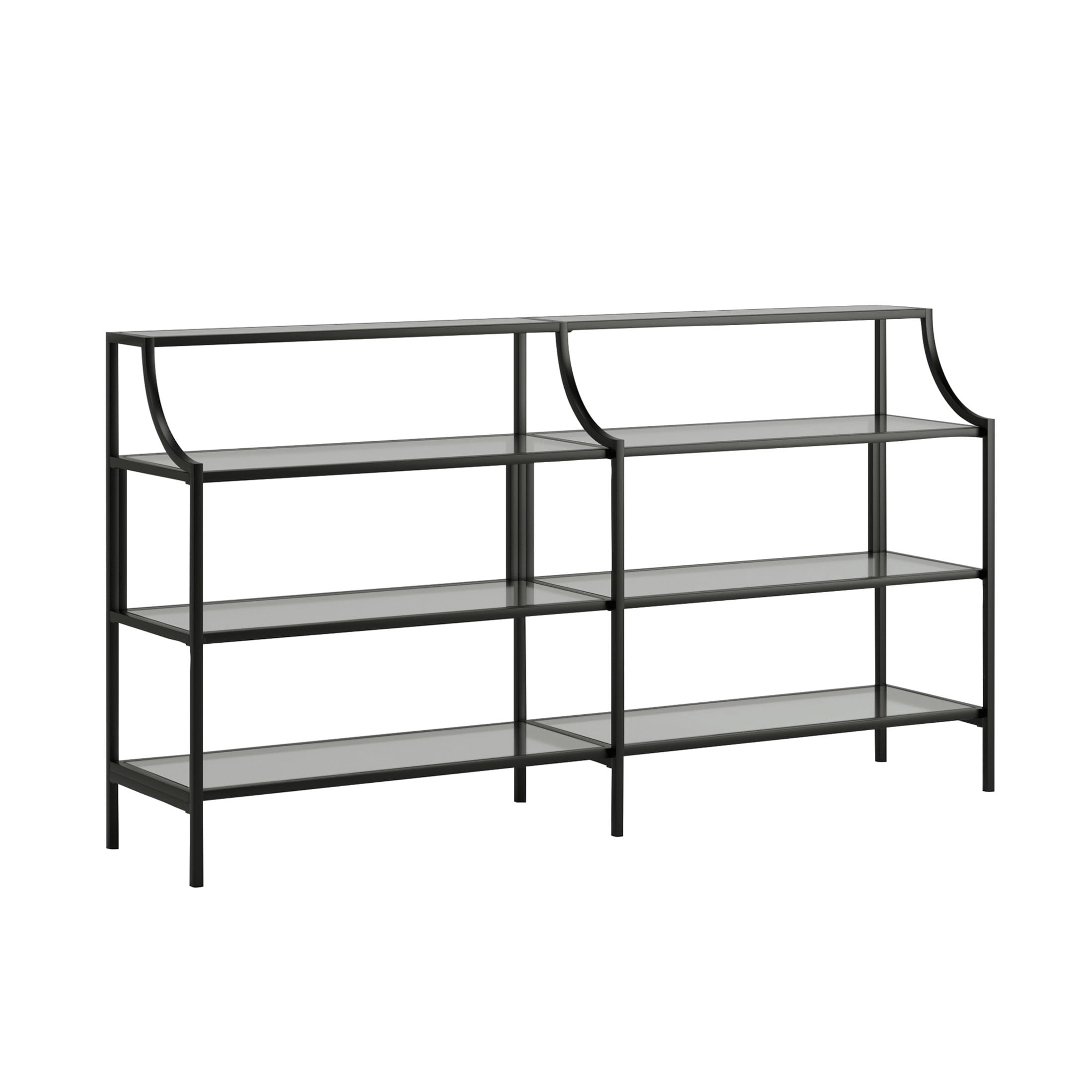 Finish: Black Material: Metal and Glass Open shelving for storage and display of books, binders, framed photos, collectibles, and more Safety-tempered glass for added detail Finished on all sides for versatile placement anywhere in your home Metal construction for long lasting durability