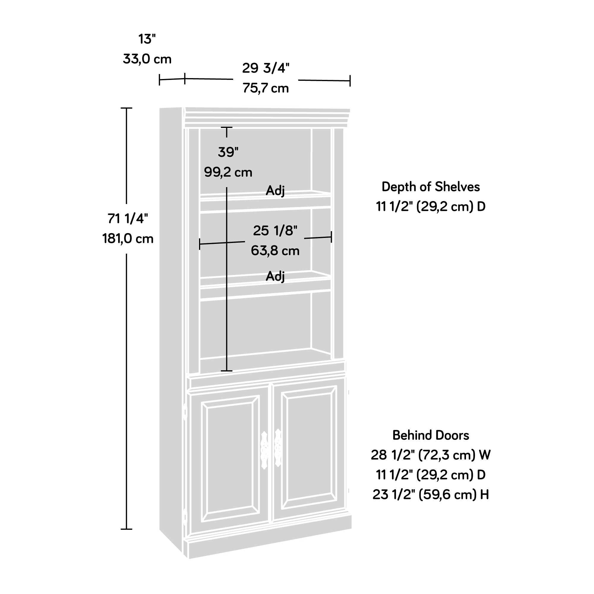 Assembled Dimensions: 29.80″ L X 12.99″ W X 71.26″ H Five shelves, three adjustable. Hidden storage behind doors. Classic Cherry finish Model #: 102792 For additional questions or any issues, please contact the manufacturer at 1-800-523-3987. Be sure to check out the Sauder Heritage Hill collection for more great items!