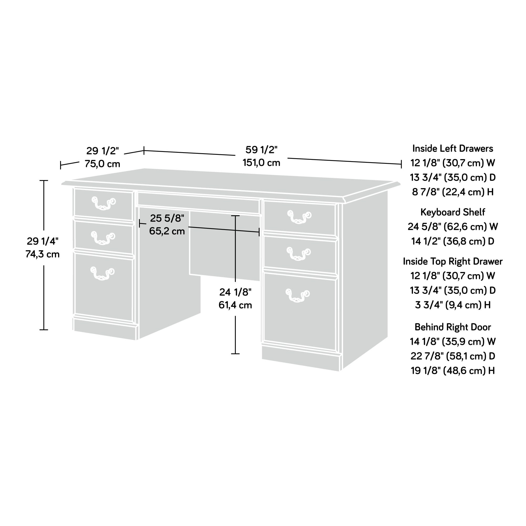 Assembled Dimensions: 59.45″ L x 29.53″ W x 29.25″ H Two file drawers on left side hold letter-size hanging files Right side features a small drawer and a door which conceals storage area for vertical CPU tower Center drawer has flip-down front for use with a keyboard Classic Cherry finish Model #: 109830 Box Dimensions: 67.25″ L x 31.13″ W x 5.31″ H For additional questions or any issues, please contact the manufacturer at 1-800-523-3987. Be sure to check out the Sauder Heritage Hill collection for more great items!