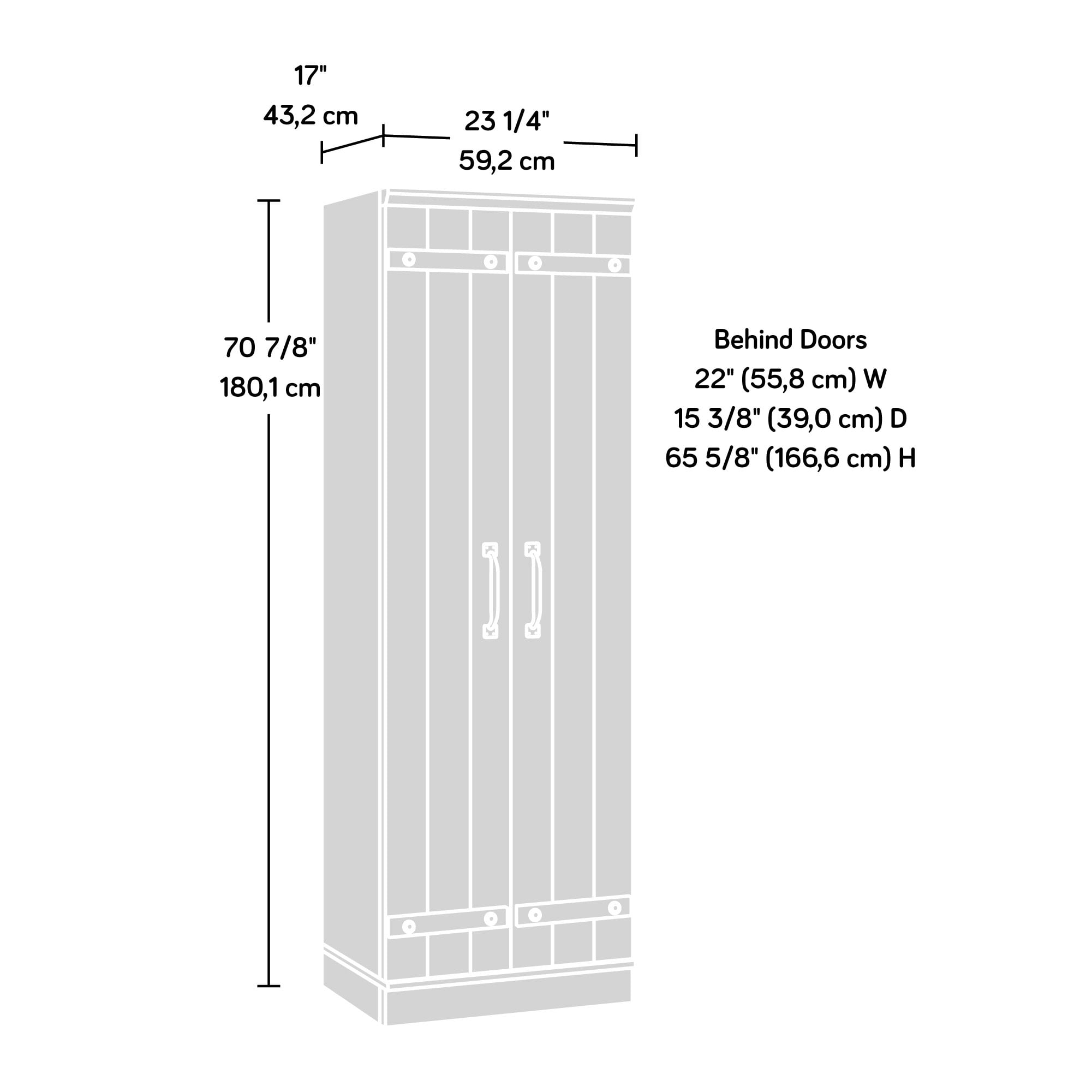 Assembled Dimensions: 23.31″ L x 17.01″ W x 70.91″ H Four adjustable shelves for customizable storage options Details include planked barn door styling Adjustable levelers at the base provide stability over uneven surfaces Salt Oak finish Model #: 430335 Box Dimensions: 72.69″ L x 19.37″ W x 5.37″ H For additional questions or any issues, please contact the manufacturer at 1-800-523-3987. Be sure to check out the Sauder Homeplus collection for more great items!