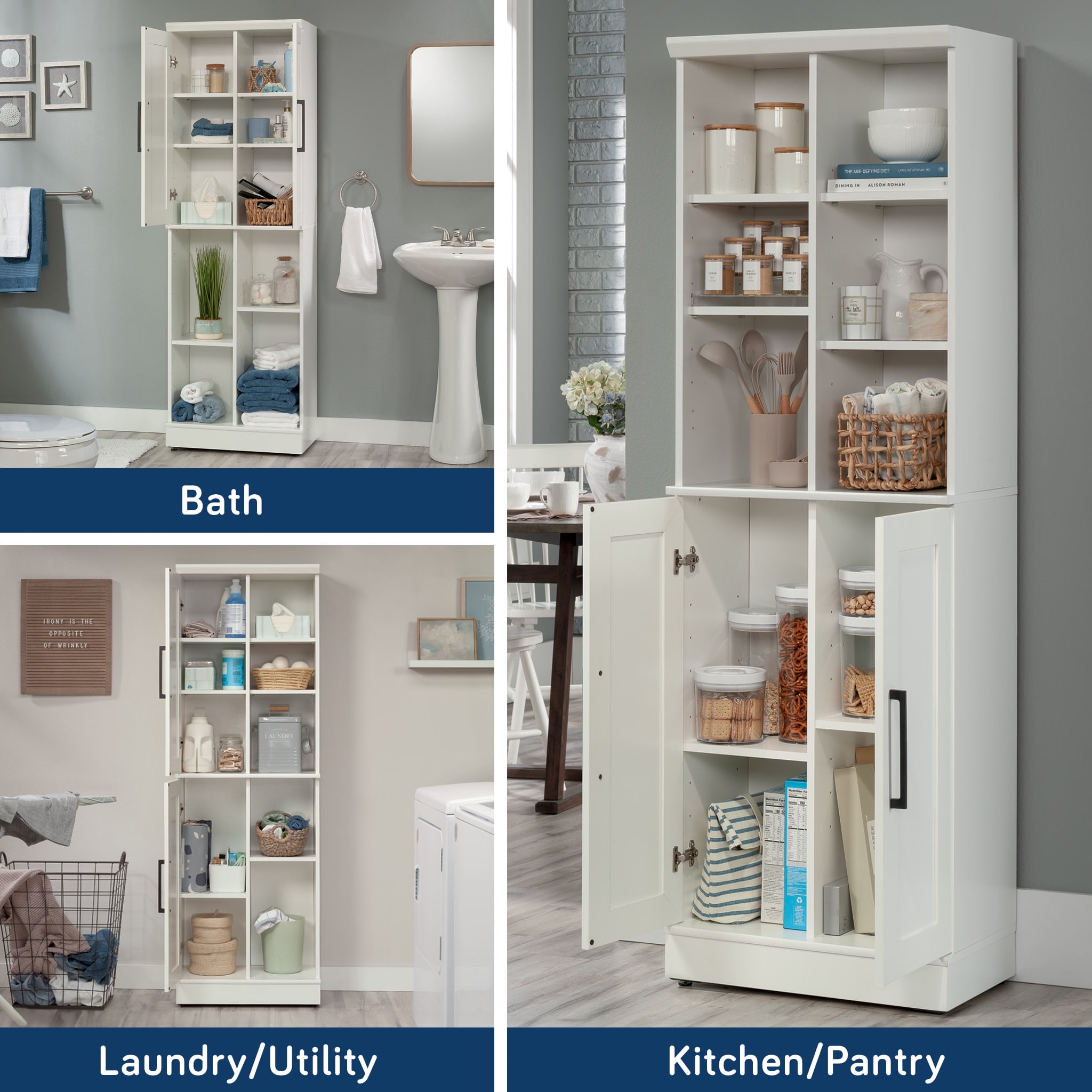 For a versatile storage solution that can be customized to fit a variety general storage needs, look no further than this 2-door storage cabinet from the HomePlus collection! This multipurpose 2-door storage cabinet has an easily configurable design which allows its doors to be positioned on the top, bottom, left, or right. Adjustable levelers at the base provide added stability, especially over uneven flooring. This kitchen storage cabinet also features six adjustable shelves, making it easy to organize items of all shapes and sizes. Whether storing boxes of cereal, canned food, or other meal prep staples, this pantry cabinet is sure to deliver. The enclosed back panel with cord access makes it easy to charge electronic devices for use in the home office too. Additionally, the adjustable shelves of this white storage cabinet make it ideal for use in the laundry room or bathroom, with versatility to store tall bottles of laundry soap or big stacks of towels. Finished in Soft White, this modern storage cabinet is both pretty, and prepared to solve a variety of household storage shortcomings.