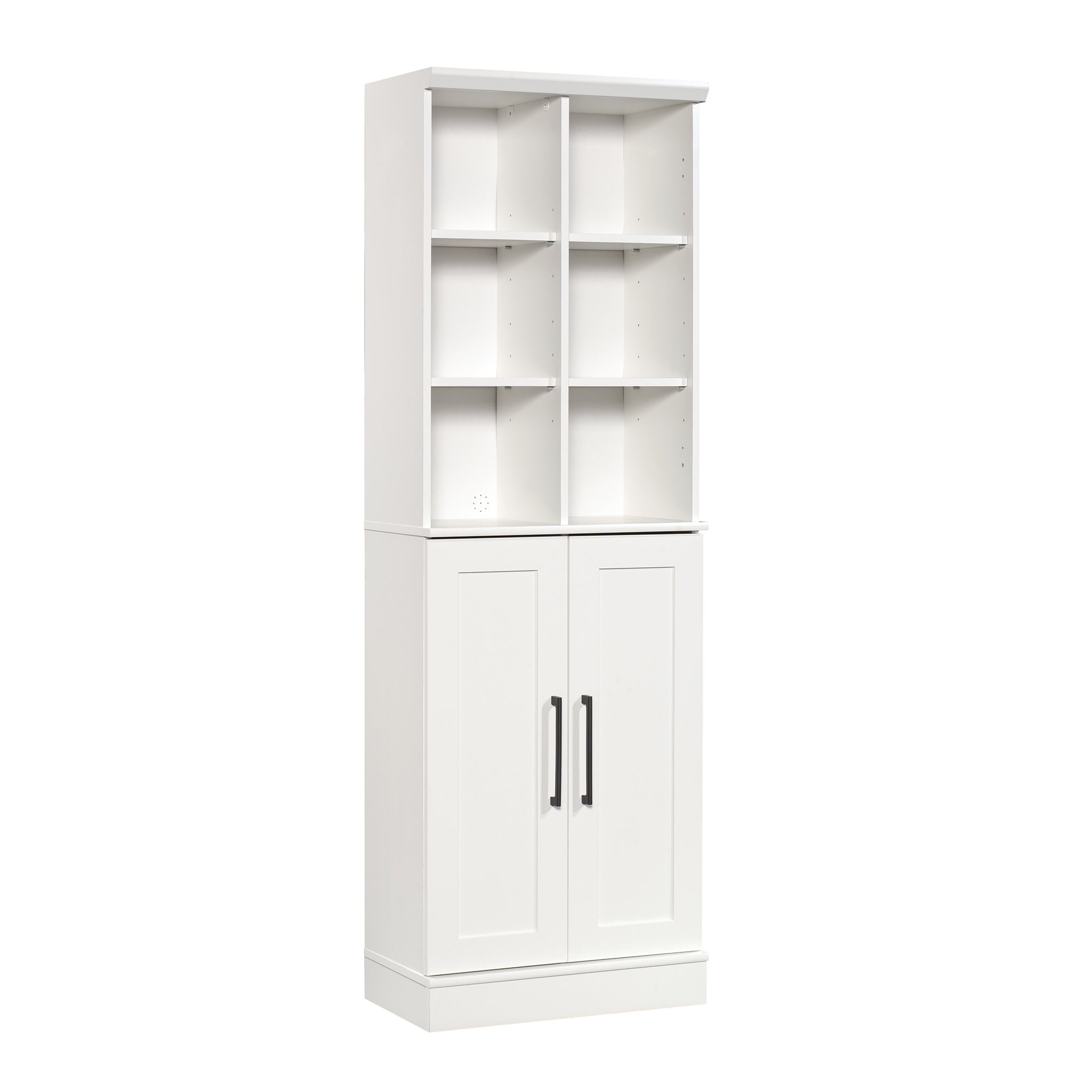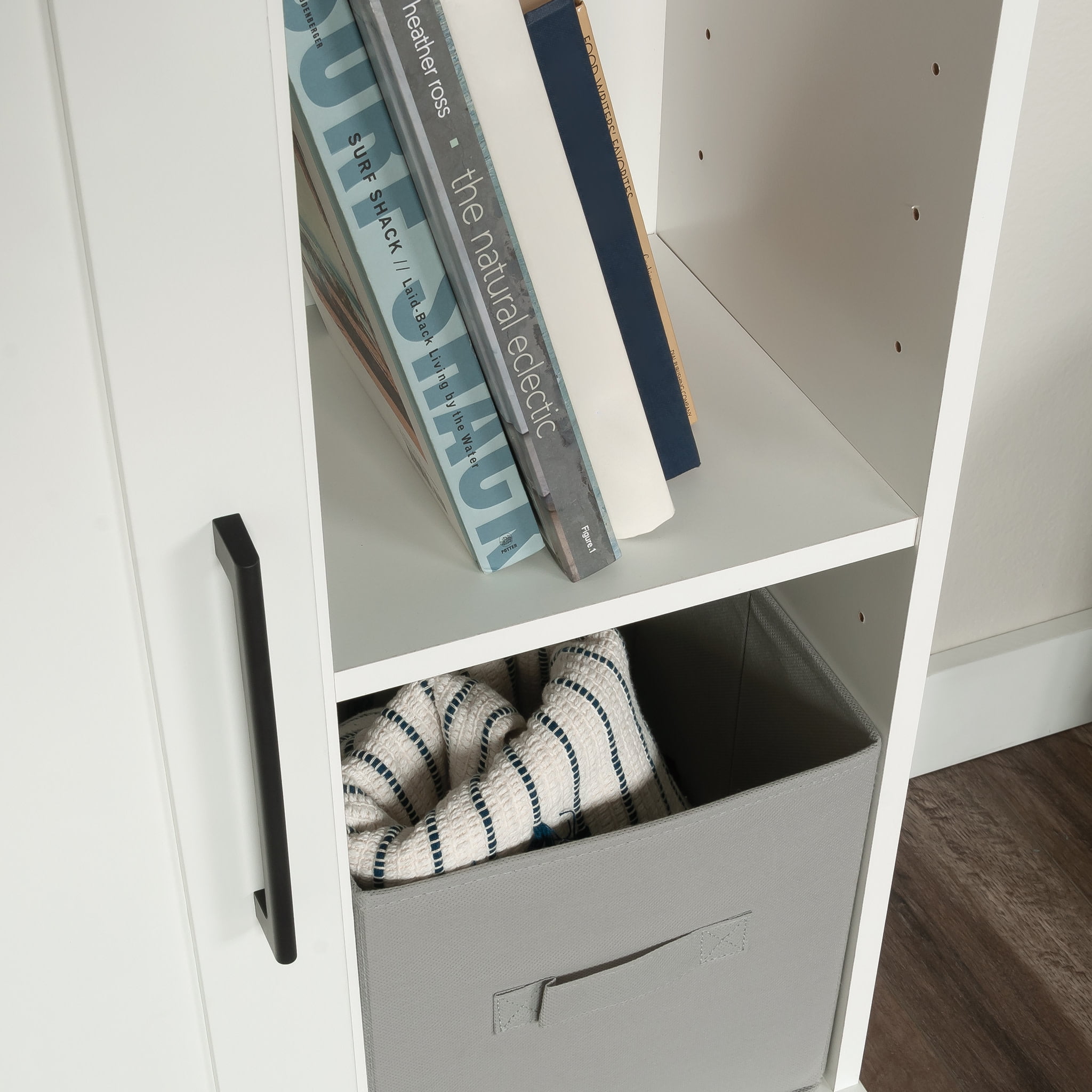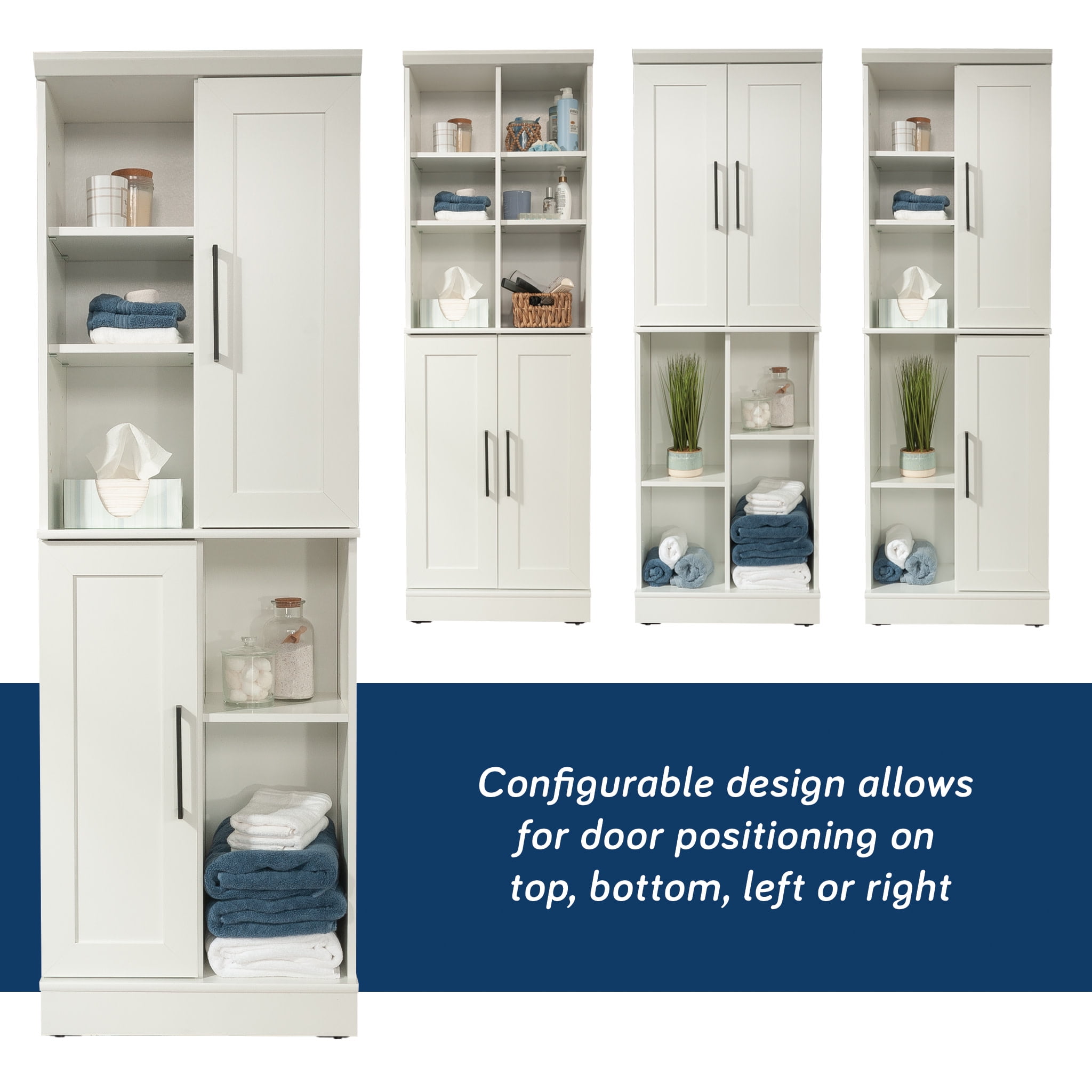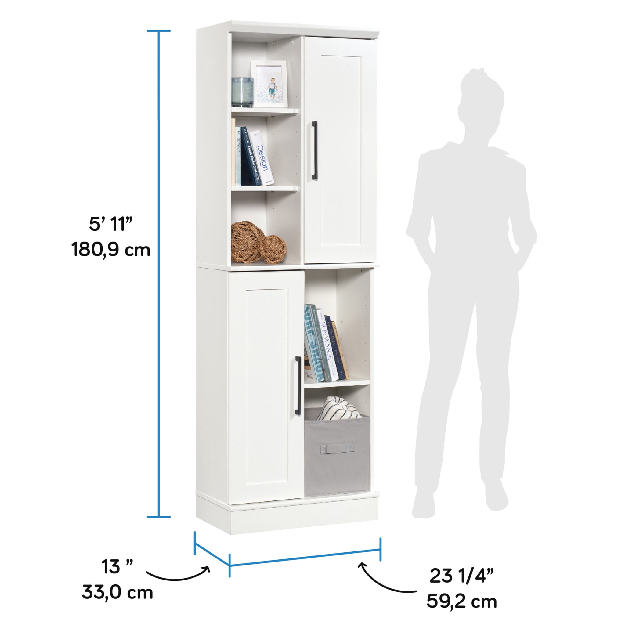 Assembled Dimensions: 23.31″ L x 12.99″ W x 71.22″ H Configurable design allows for position of doors on top, bottom, left or right Six adjustable shelves for various storage options Enclosed back panel has cord access for easy charging Adjustable base levelers for even placement Soft White finish Model #: 430330 Box Dimensions: 52.0″ L x 13.63″ W x 8.06″ H For additional questions or any issues, please contact the manufacturer at 1-800-523-3987. Be sure to check out the Sauder HomePlus collection for more great items! Multi use cabinets with doors for kitchen, garage, mud room or bathroom cabinet storage