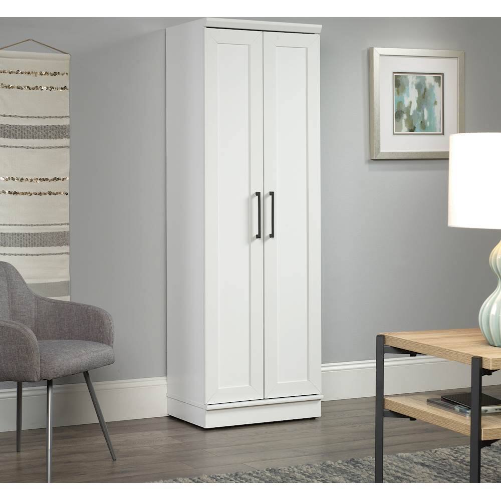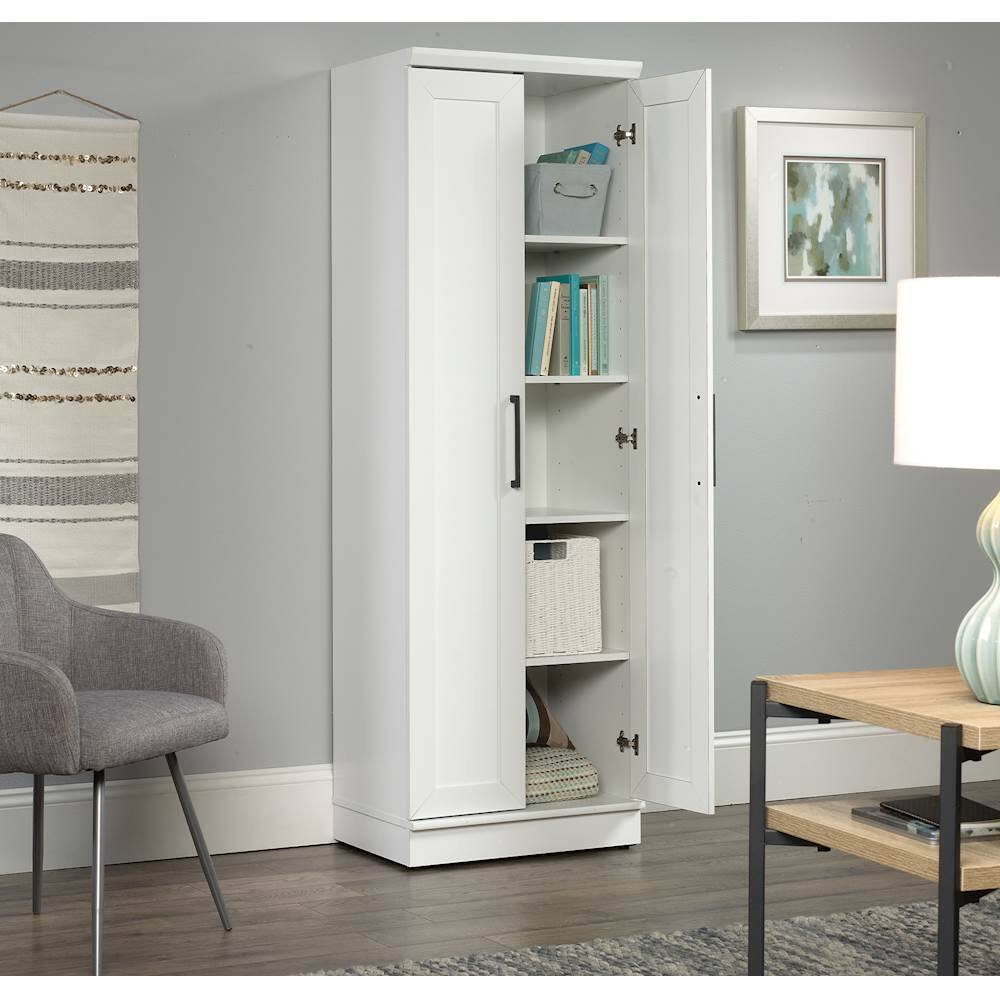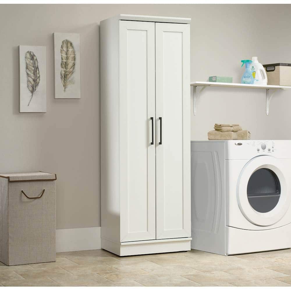 Expand storage capacity in the kitchen, laundry room or bathroom with this 23.25-inch Sauder HomePlus storage cabinet. Its paneled doors open to reveal four shelves for keeping items out of sight. The soft white finish on this Sauder HomePlus storage cabinet makes it an easy fit with your existing furnishings.