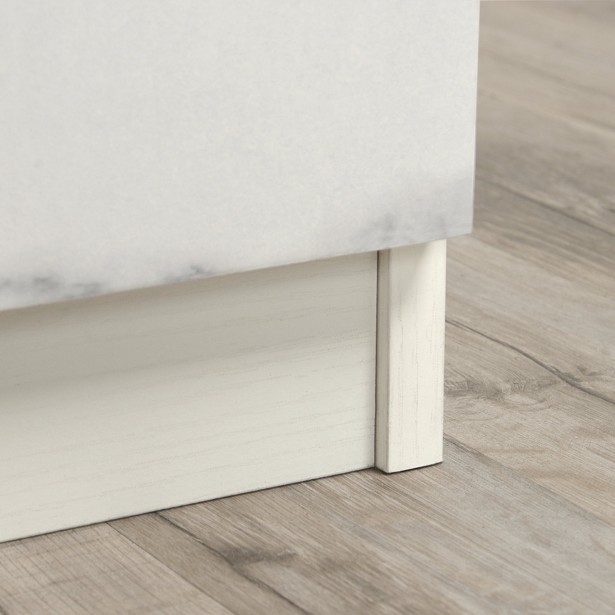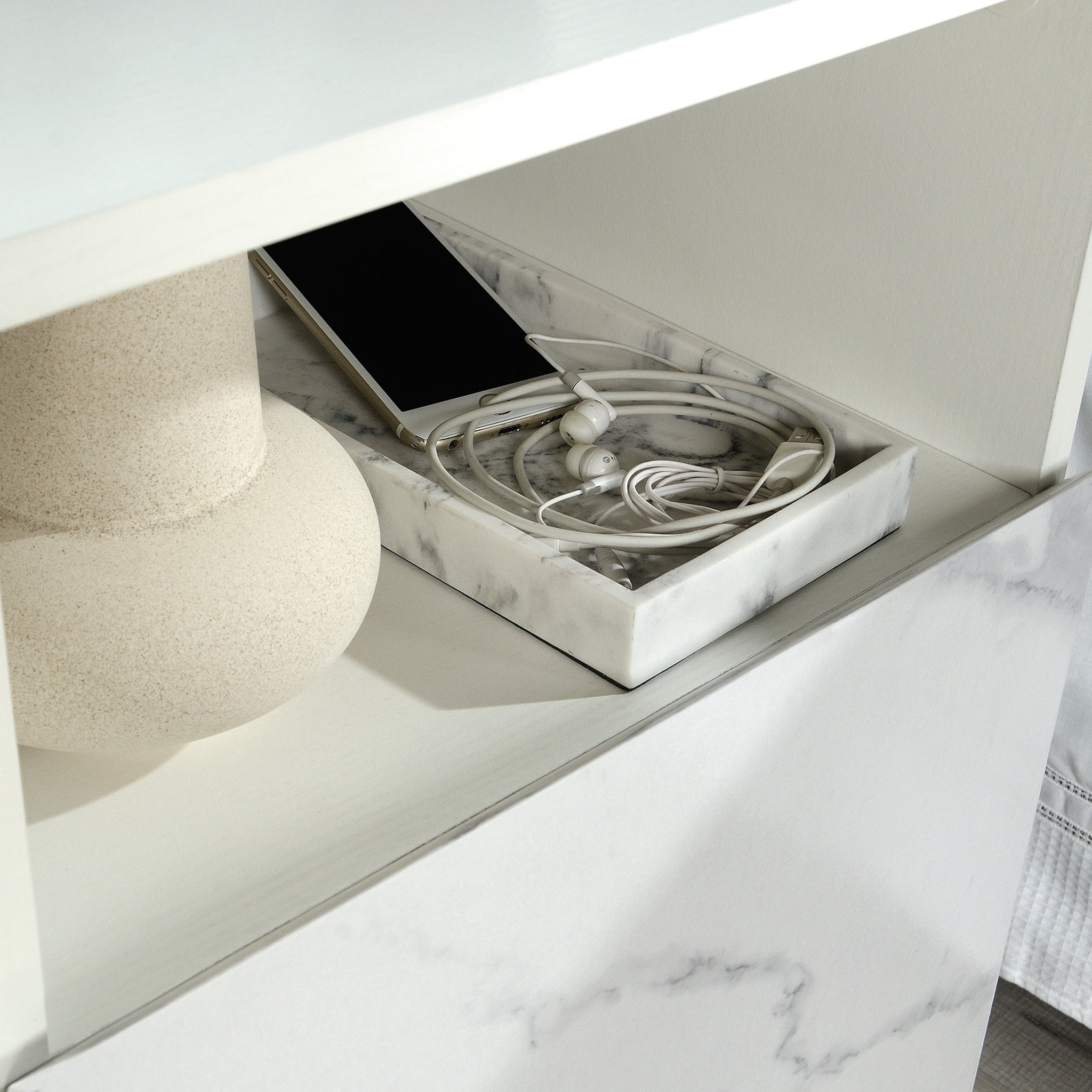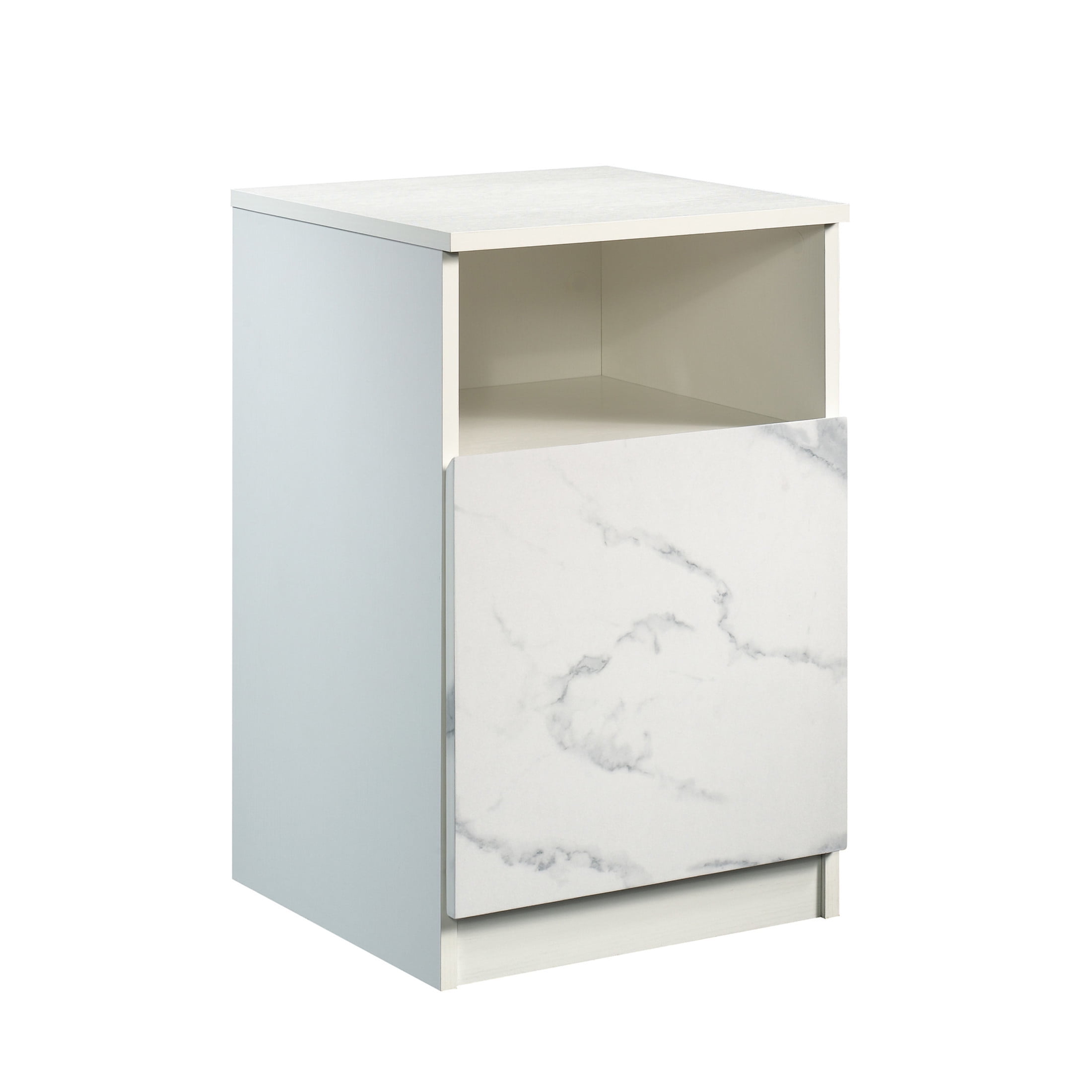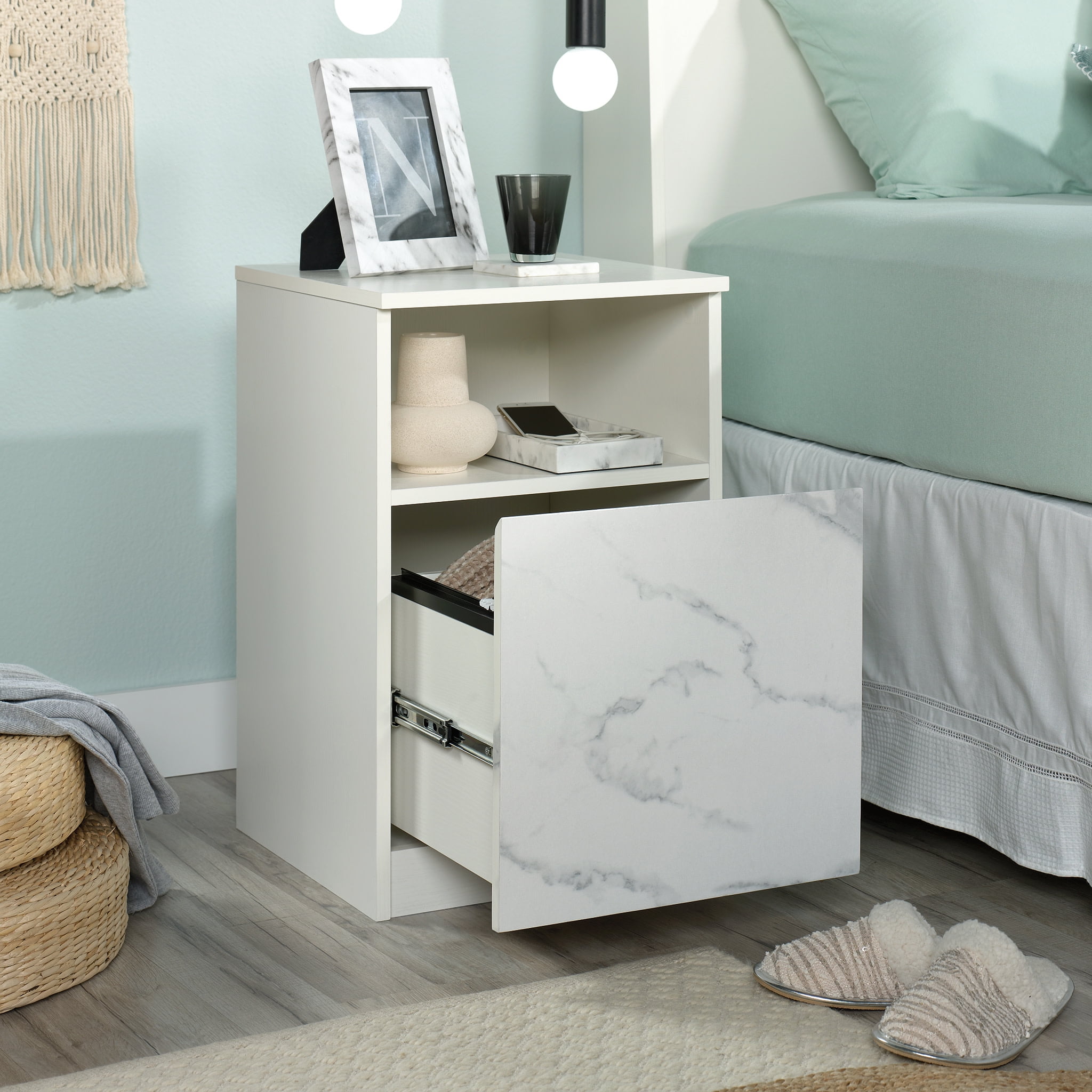 Enhance the look of your bedroom with the timeless charm and simplistic beauty of this nightstand from the Hudson Court collection. The spacious top surface of this bedside table with drawer provides you with the ideal amount of space for all of your must-have bedside necessities – an accent lamp, your alarm clock, a charging station for your smartphone and a place to set a refreshing glass of water. This nightstand with open storage features a drawer that opens and closes on full extension slides for convenient and easy access storage of items like your reading glasses and the TV remote. It also includes a spacious open shelf for additional storage space or to display home décor items like picture frames and knick-knacks. This faux marble nightstand includes a cord management pass through so your side table is not cluttered with extra cords. This bedside table with drawer is detailed with a chamfered edge drawer front and finished on all sides for versatile placement in any room of your home. Finished in Pearl Oak with faux White Marble accent, this unique bedside table with storage is just what your bedroom is missing.