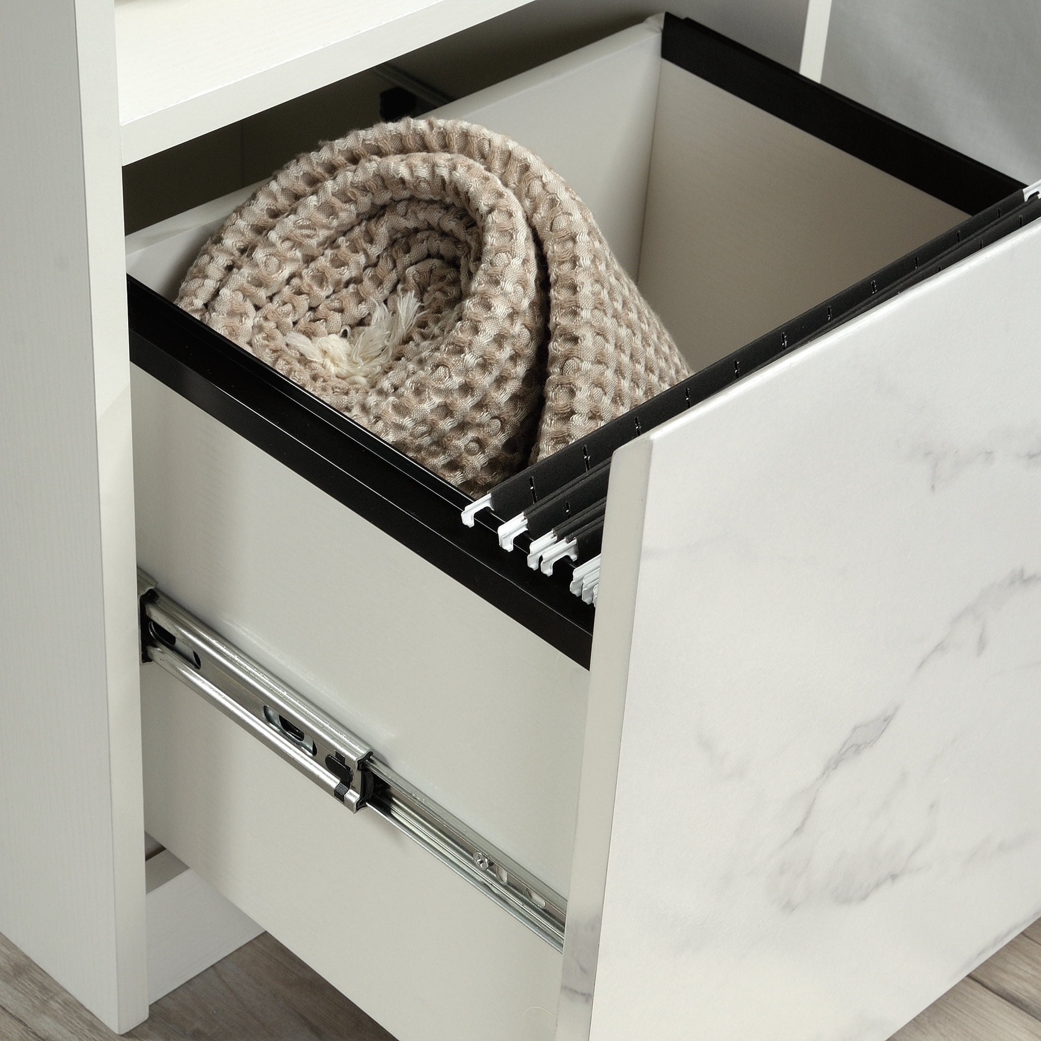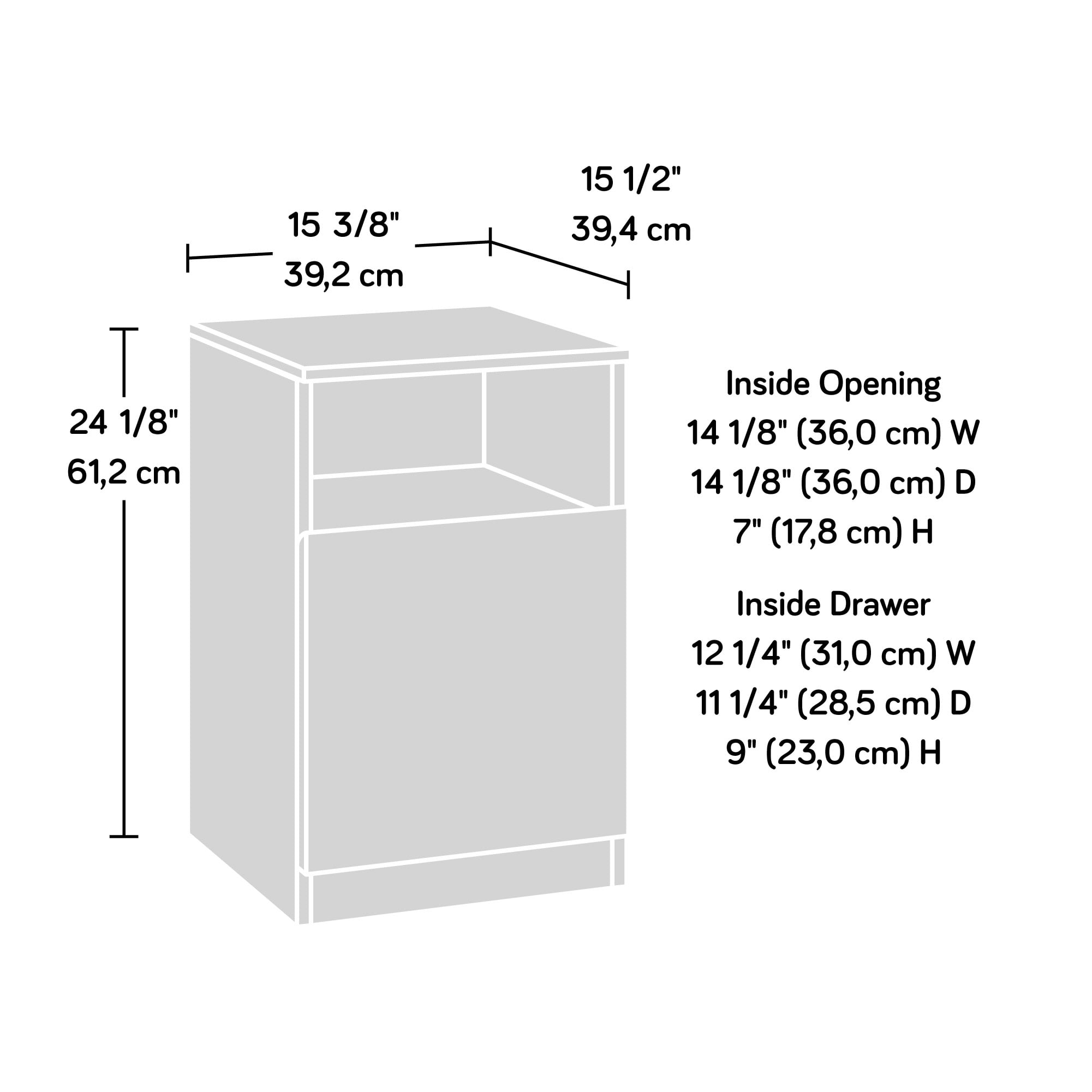 Assembled Dimensions: 15.43″ L x 15.51″ W x 24.09″ H Drawer features full extension slides Open shelf provides additional storage for bedroom home dcor Detailing includes chamfered edge drawer front Finished on all sides for versatile placement in any room of your home Cord management to keep your night stand clutter free Pearl Oak” finish with faux White Marble accent Model #: 428251 Box Dimensions: 27.68″ L x 17.83″ W x 5.12″ H For additional questions or any issues, please contact the manufacturer at 1-800-523-3987. Be sure to check out the Sauder Hudson Court collection for more great items!