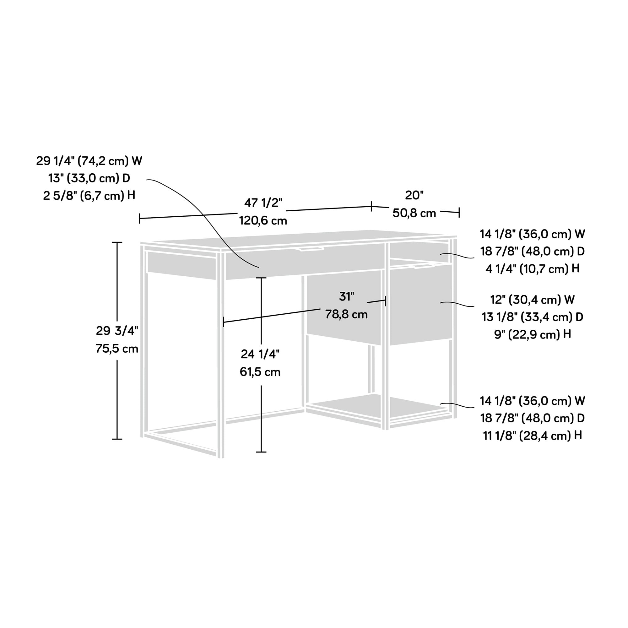 Assembled Dimensions: 47.48″ L x 20.0″ W x 29.72″ H Pencil drawer features metal runners and safety stops to keep you and your family safe Cubbyhole storage and lower shelf for additional storage File drawer with full extension slides holds letter-size hanging files to help keep you organized Finished on all sides for versatile placement anywhere in your home Powder metal frame for durability Diamond Ash finish Model #: 426429 Box Dimensions: 52.76″ L x 23.43″ W x 5.51″ H For additional questions or any issues, please contact the manufacturer at 1-800-523-3987. Be sure to check out the Sauder International Lux collection for more great items!