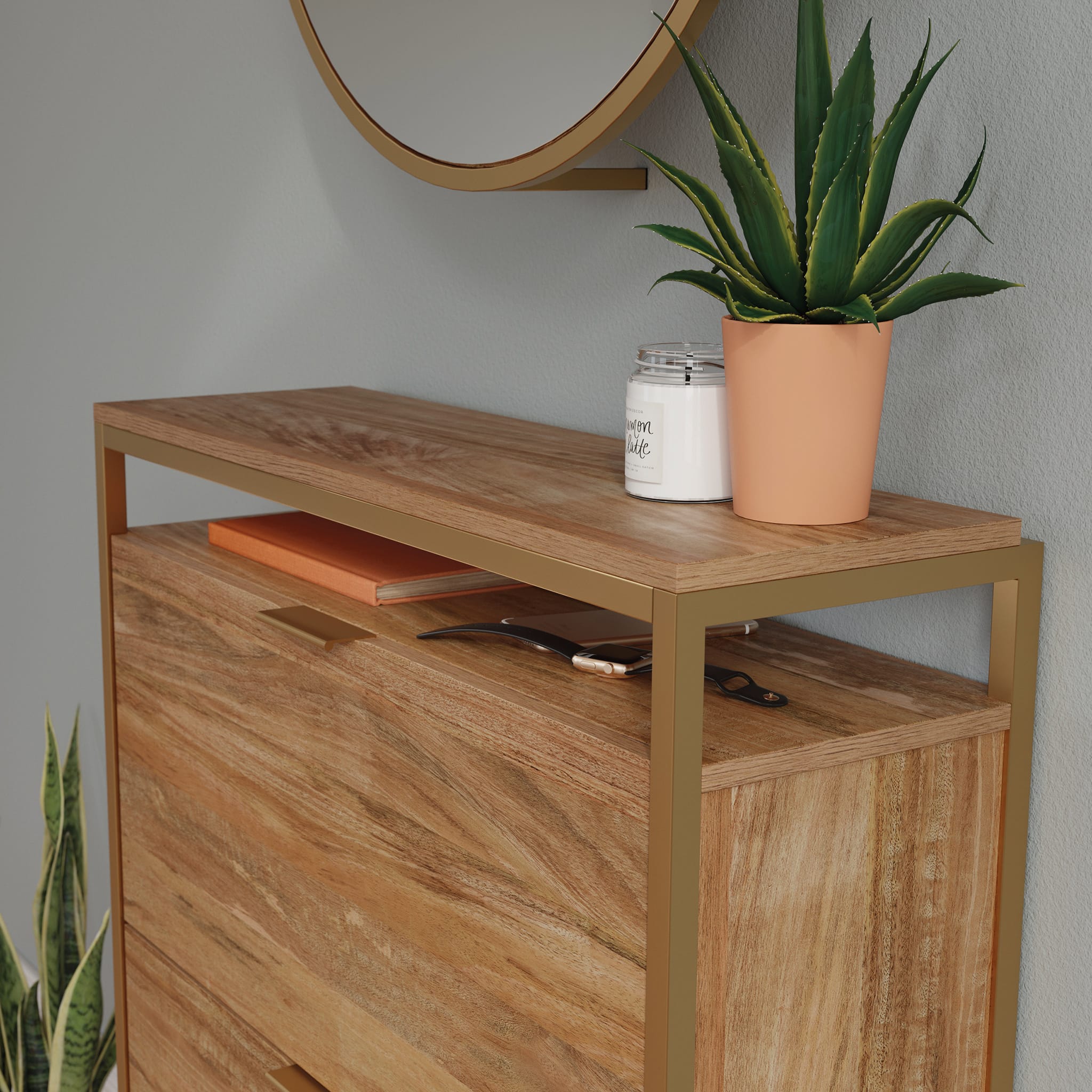 An organized entryway makes for a happy place. Use this shoe cabinet with mirror to get your entryway neat and tidy without sacrificing the style you love. This two-piece solution includes a wall-mounted shoe storage cabinet and mirror from the International Lux collection to save floor space while providing hidden organization. For foyer shoe storage, the cabinet features two tilt-out doors that conceal storage compartments. Display decorative plants, framed photos, or a candy dish on the top shelf and use the shelf underneath to store keys, wallet, or cell phone. Keep everything tidy and in one place. In addition to the entryway shoe storage cabinet, more concealed areas – including a shelf and four hanging hooks – can be found behind the mirror. With strategic positioning at the entryway, this mirrored shoe cabinet combination gives a convenient place to check your look before you head out the door. Finished in Sindoori Mango and accented with a powder coated metal frame for durability, this slick entryway organizer will have your home looking and feeling in tip-top shape in no time.