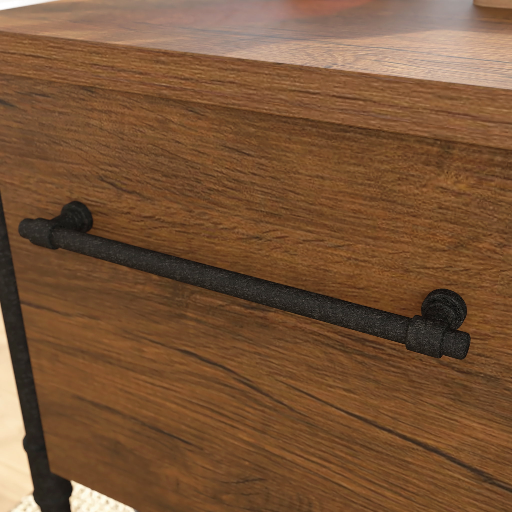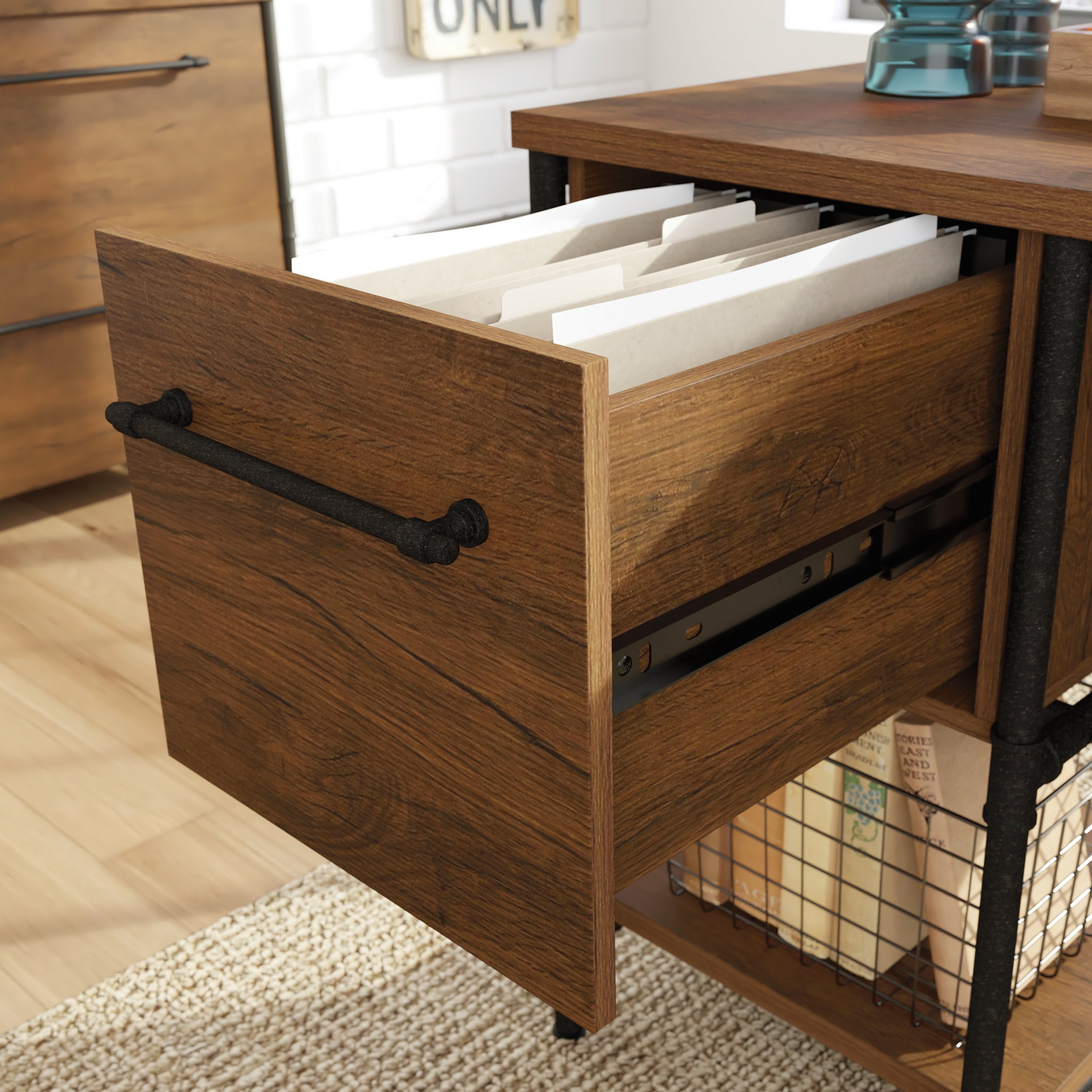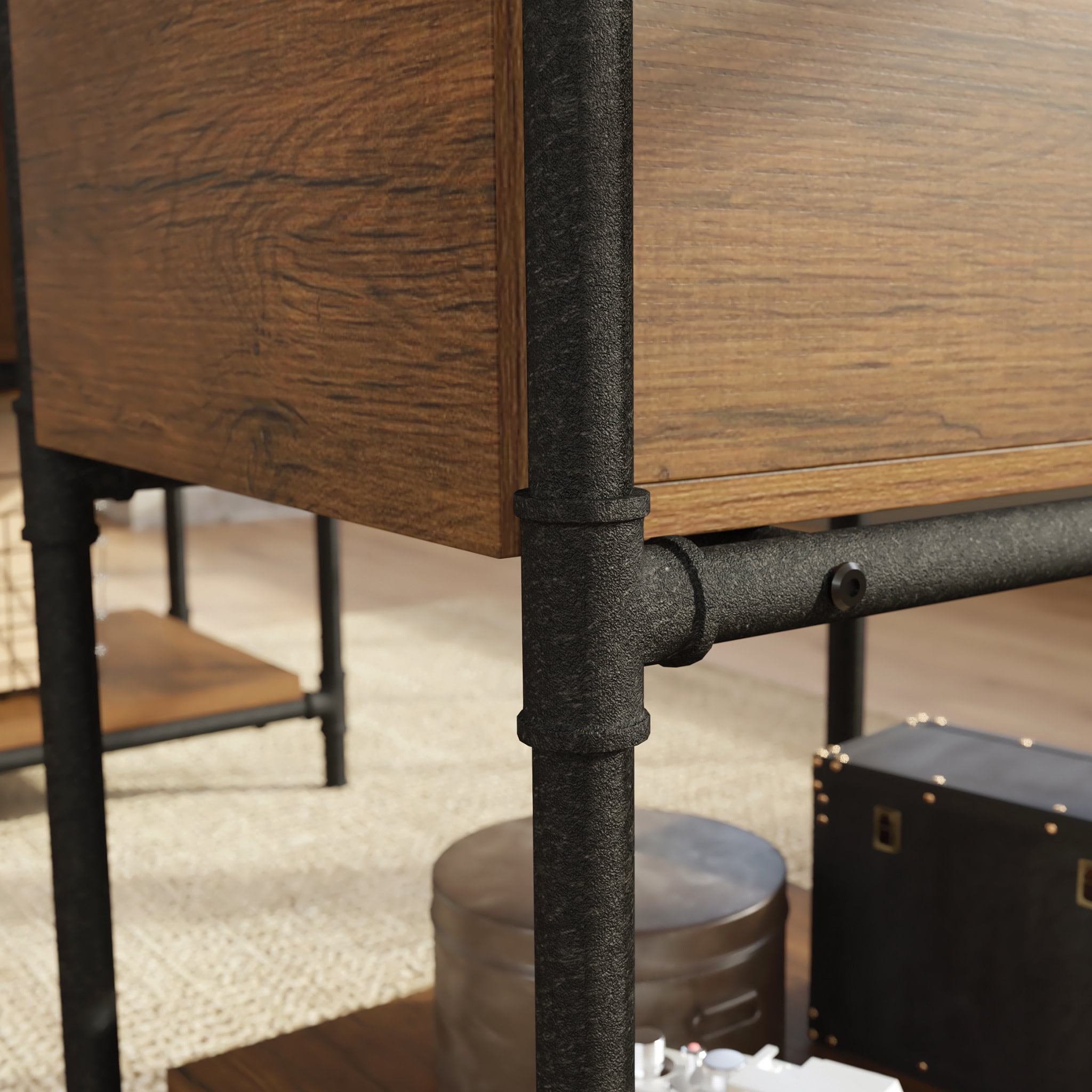 A stylish office space will have you feeling motivated and ready to work. Give your work space a touch of industrial-inspired style and design with this double pedestal desk from the Iron City collection. This home office desk offers a spacious top surface that provides you with all the room you need for items like your laptop, stacks of folders, notepads, and your hot cup of coffee. The two storage drawers with full extension slides hold letter-size hanging files so you can keep all your important papers organized. The two lower shelves provide you with additional storage space for items like binders and bins. This wood and metal desk features a textured, powder coated metal pipe frame and is finished on all sides for versatile placement throughout your home. Its strong and lightweight panel construction makes this desk easy to move and reposition in your home when its time to redecorate. Finished in Checked Oak, this good looking pipe desk is everything your office needs and more.